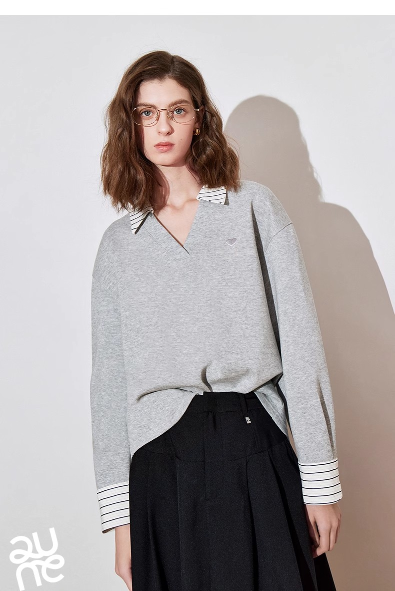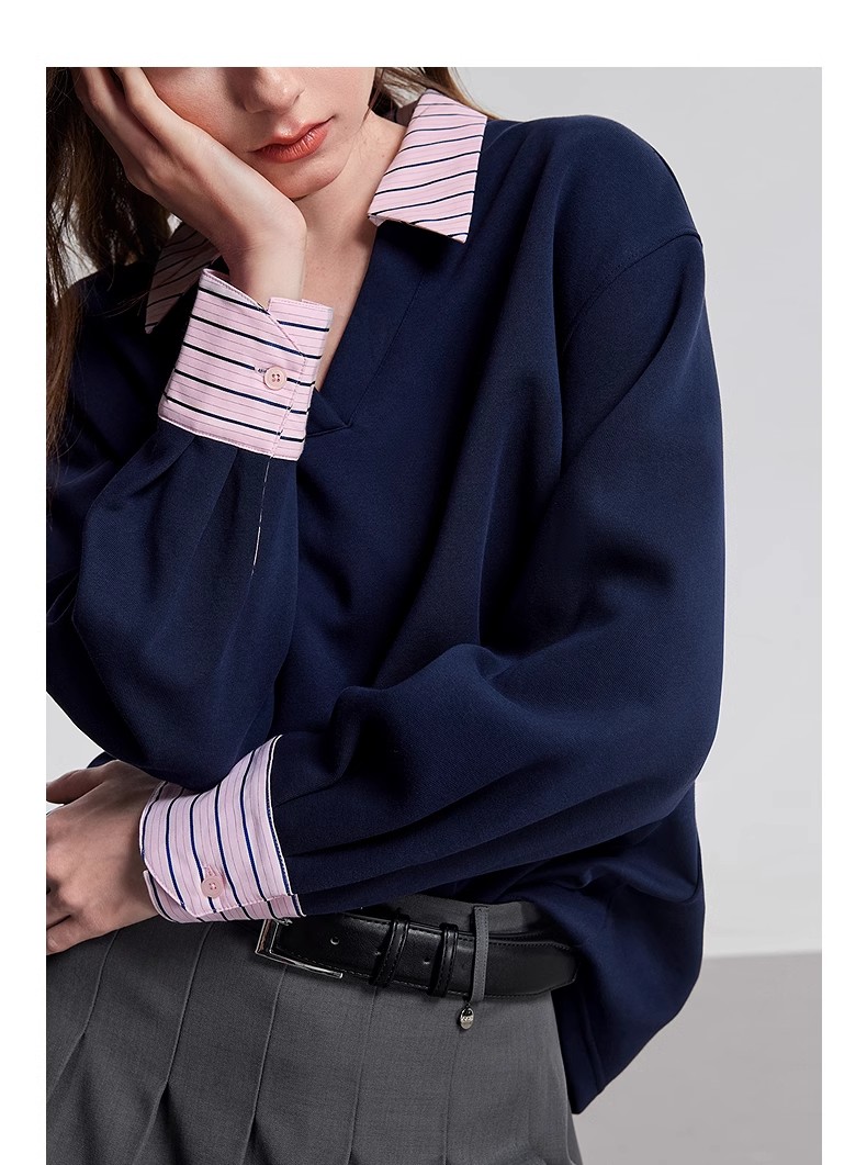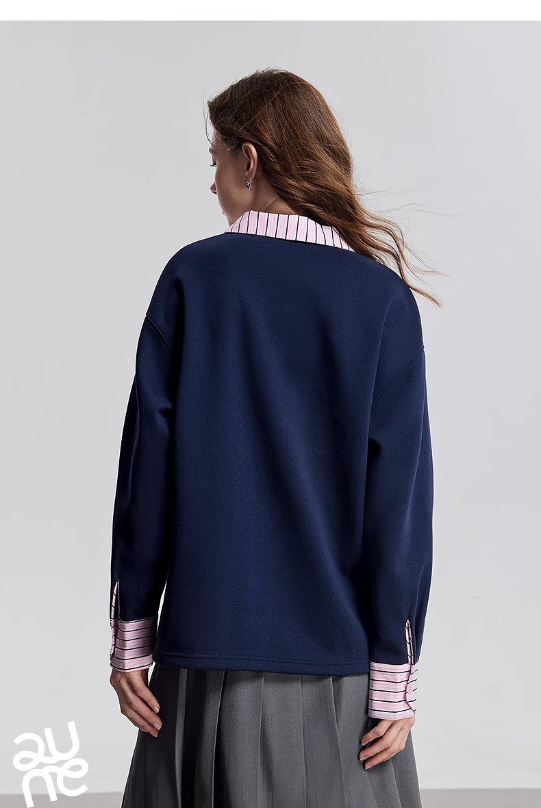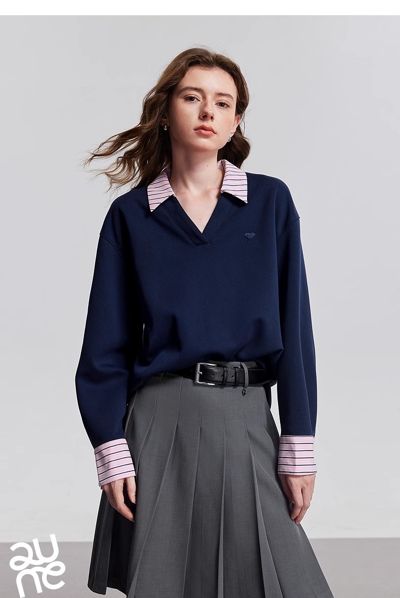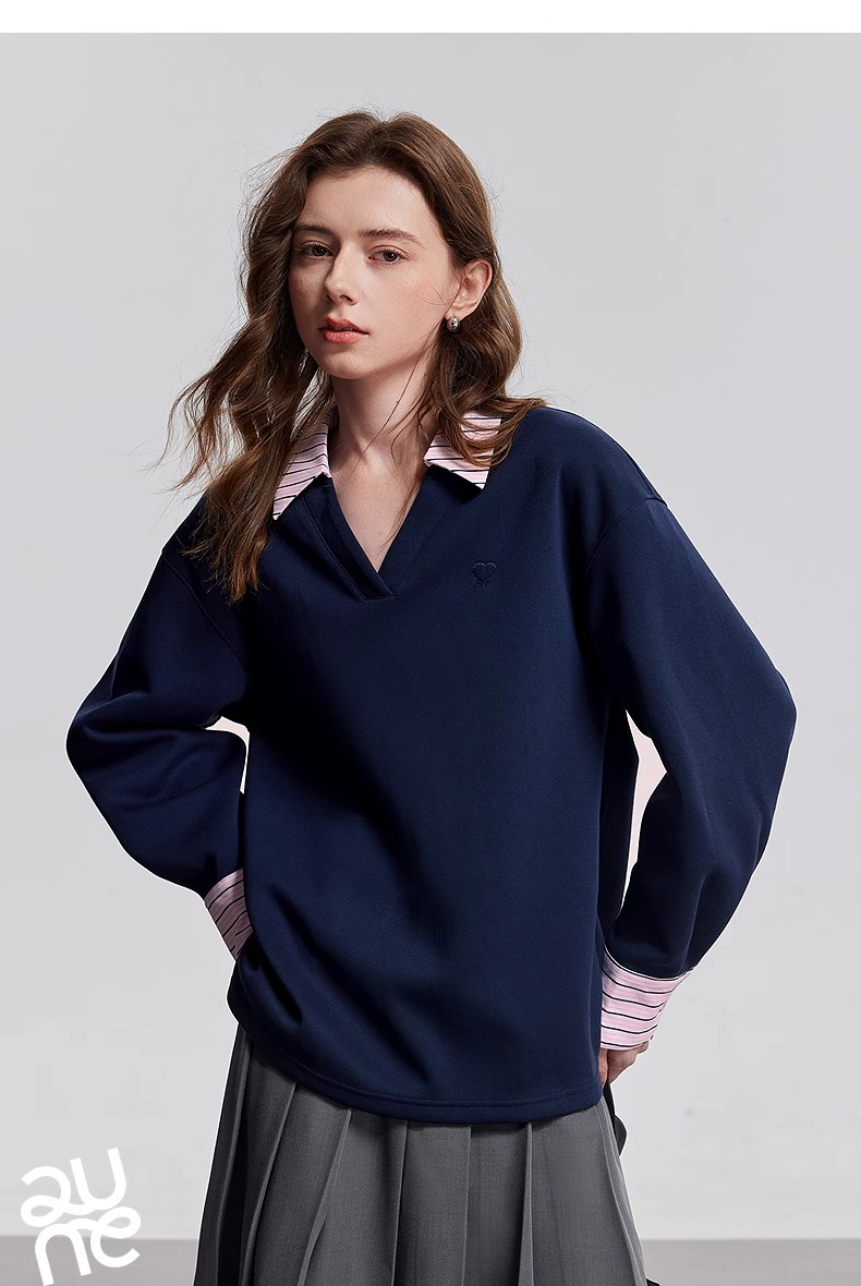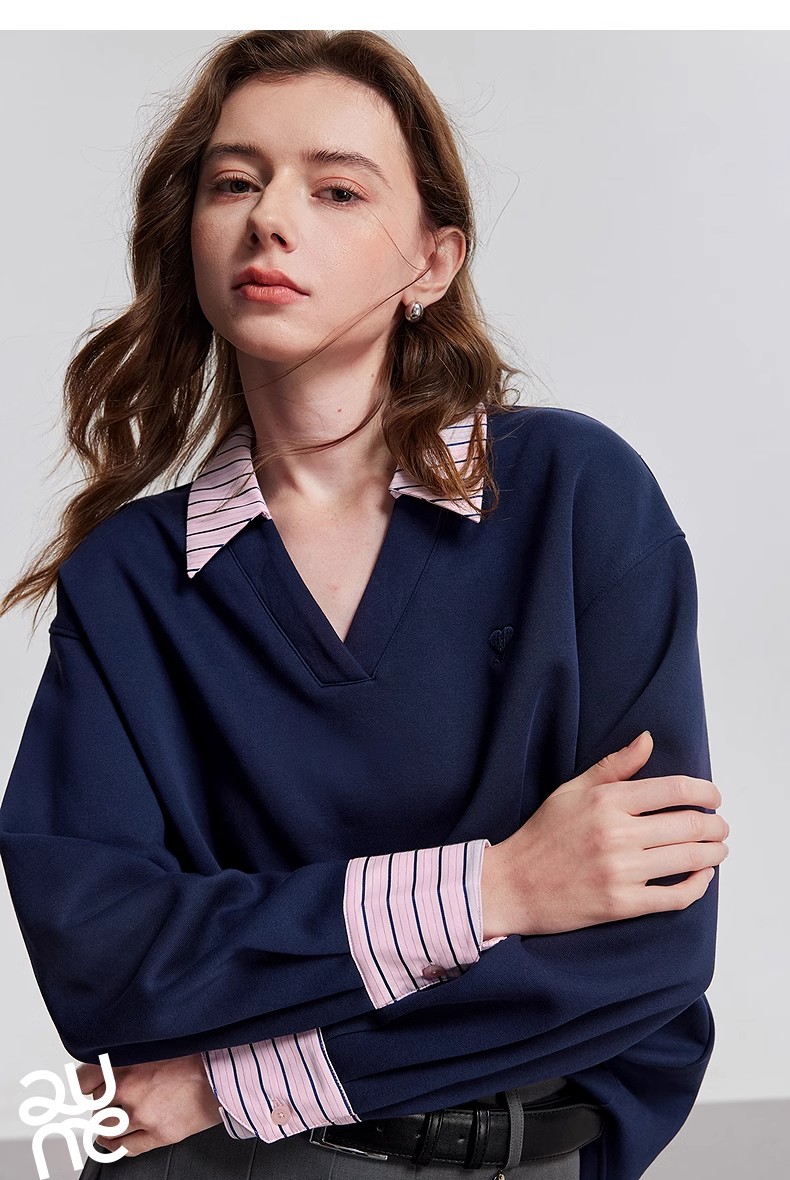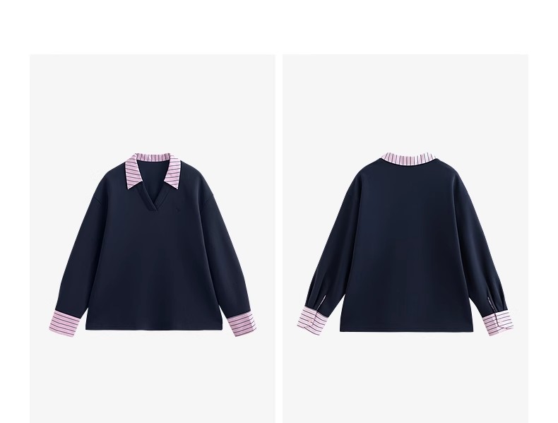 初语V字翻领卫衣女2025年春季新款撞色拼接假两件知识分子风上衣