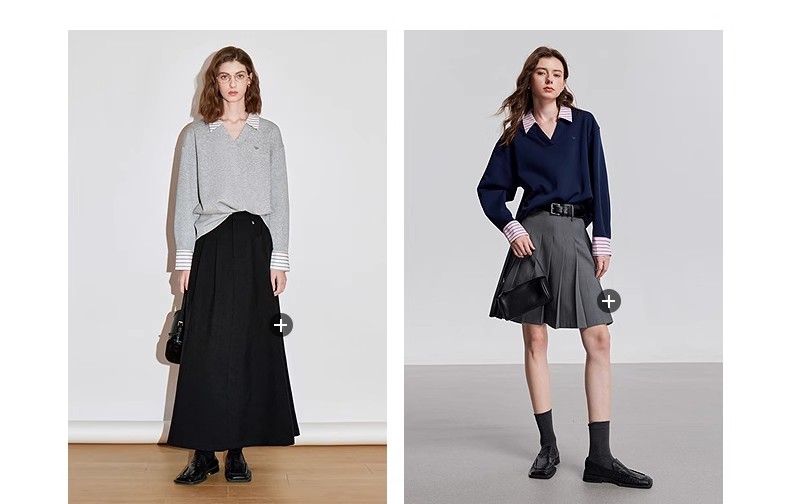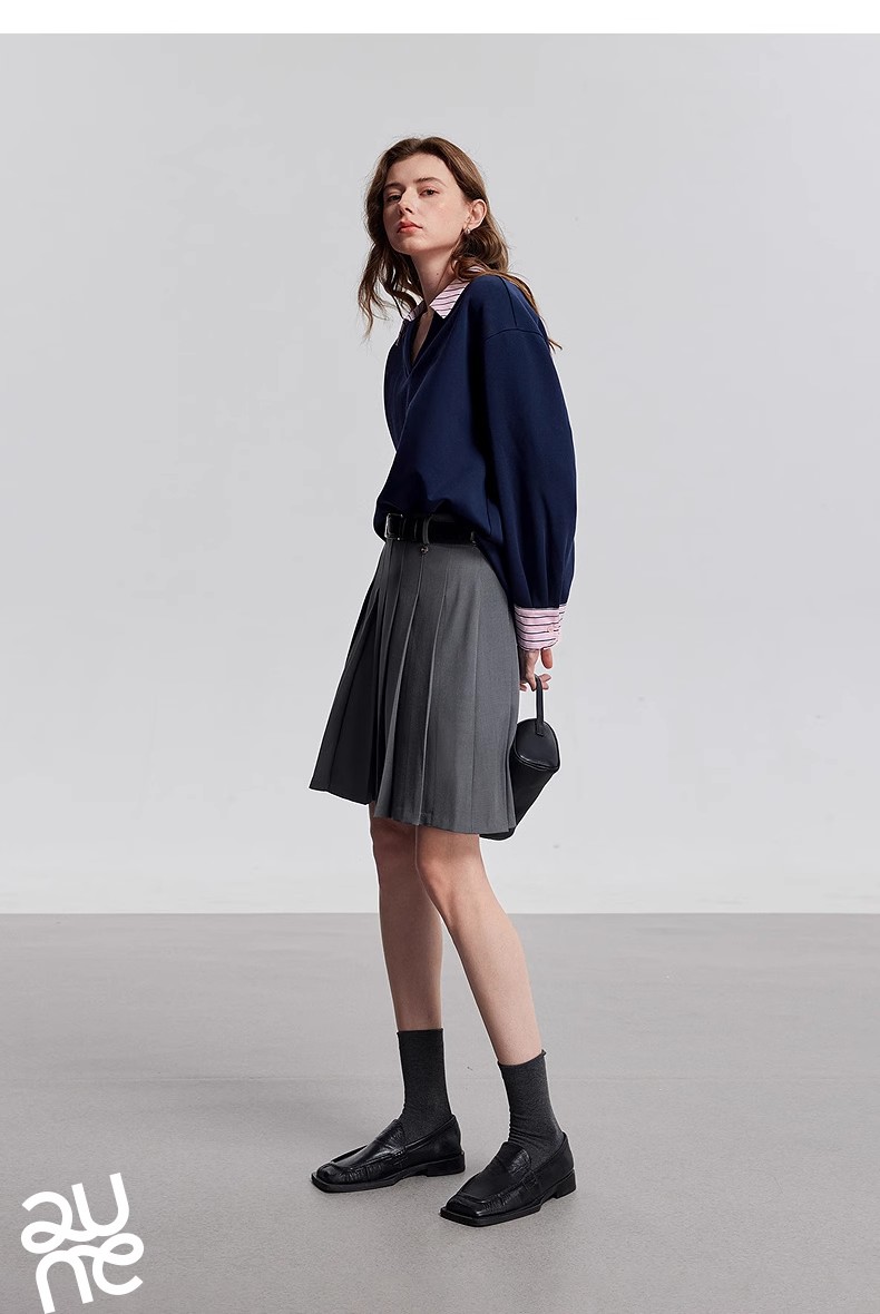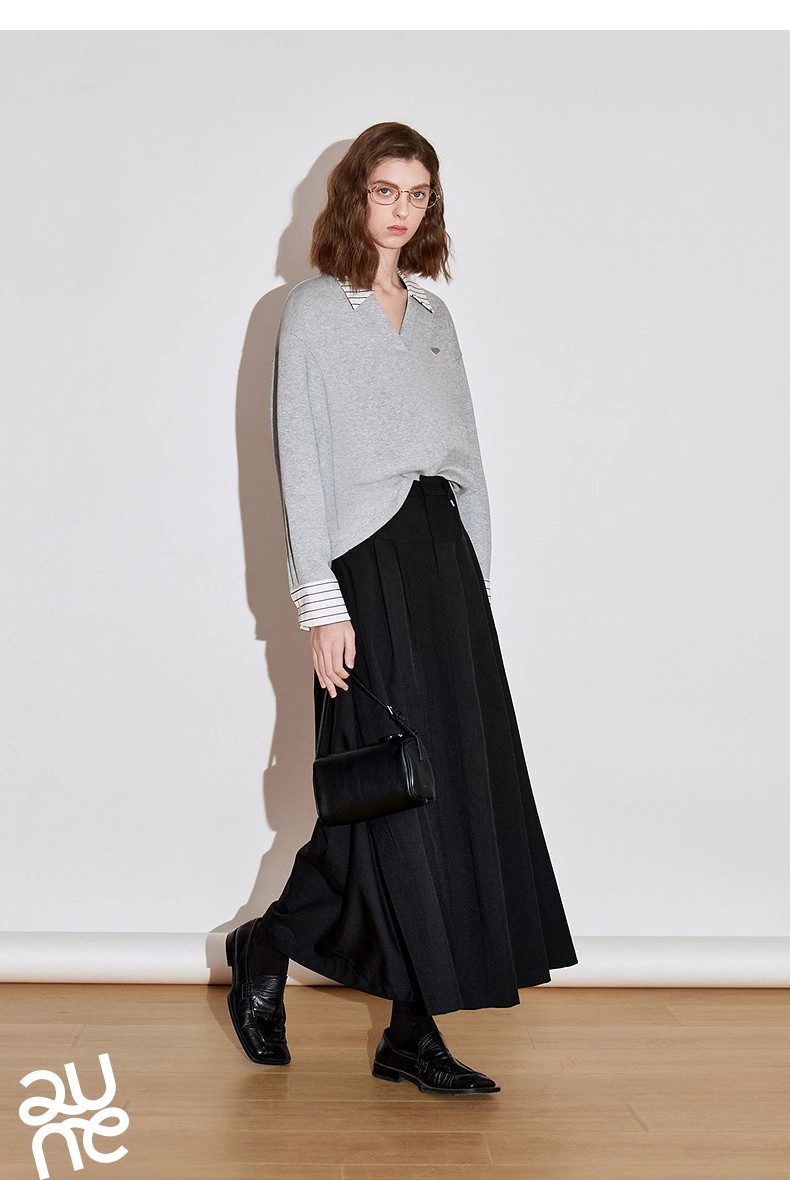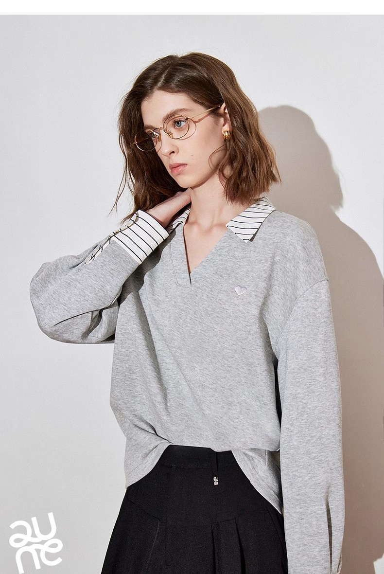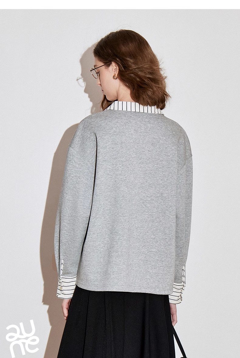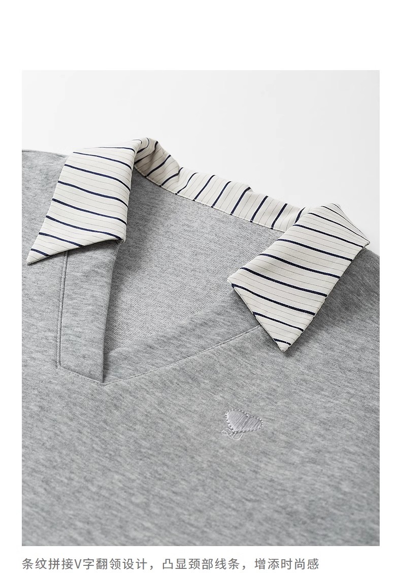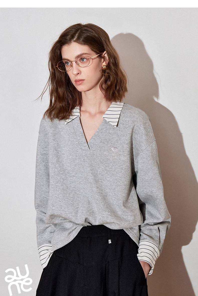 初语V字翻领卫衣女2025年春季新款撞色拼接假两件知识分子风上衣