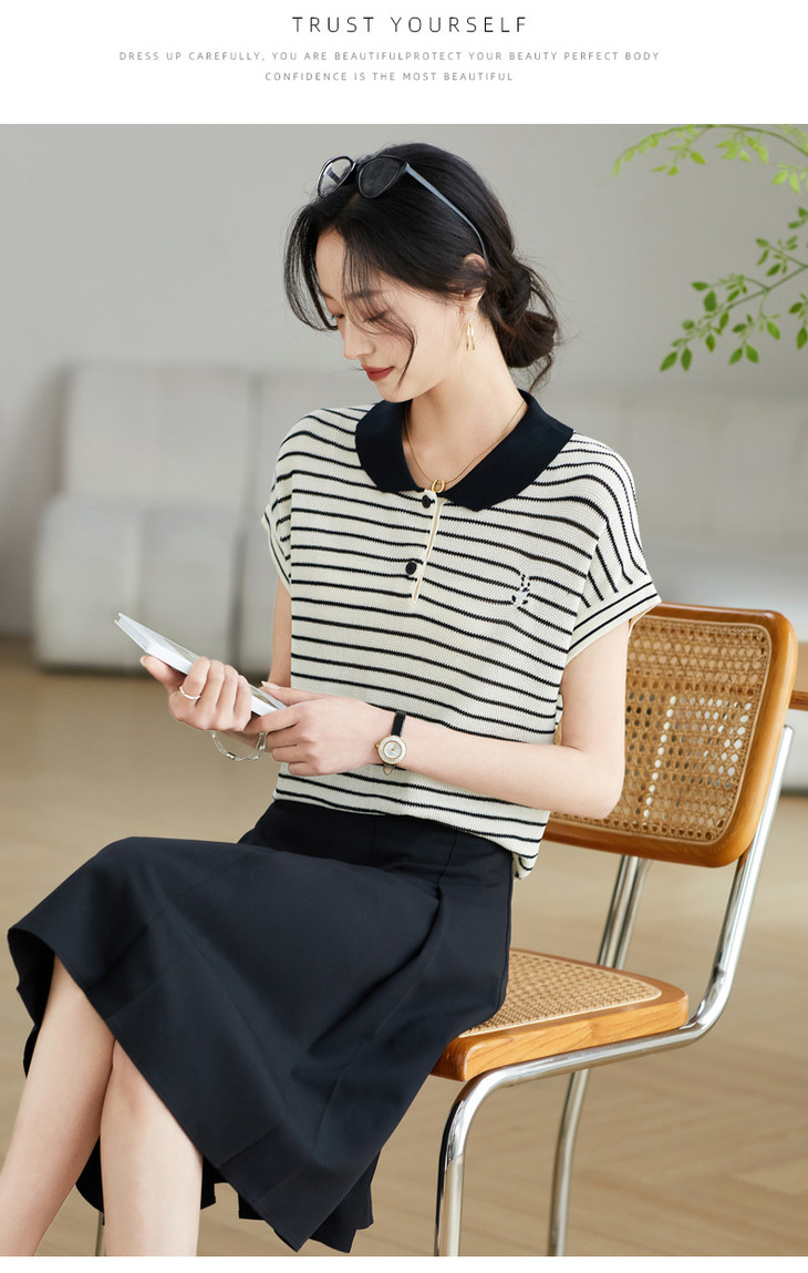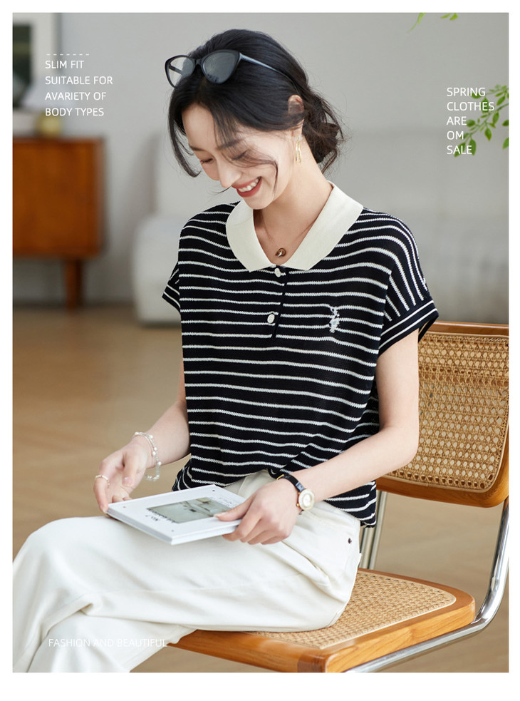 冰丝短袖条纹t恤刺绣撞色polo领针织衫CC-9013