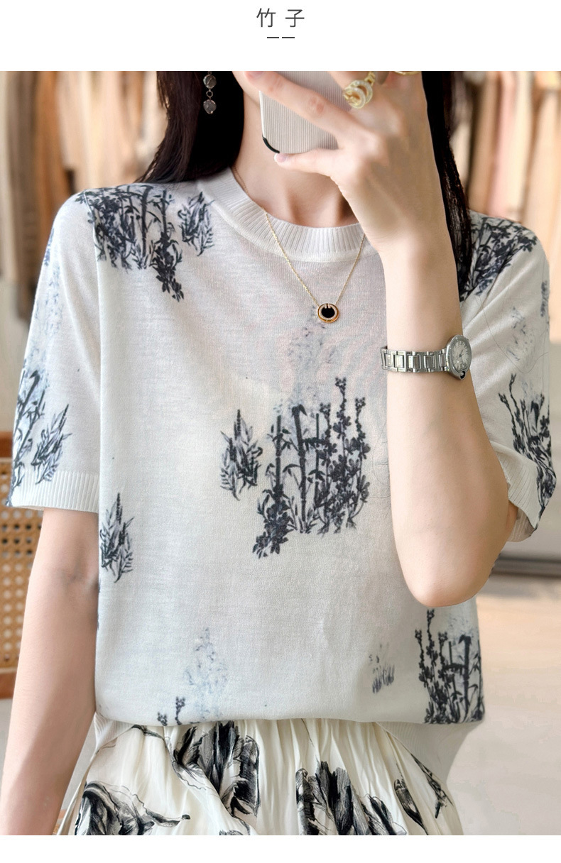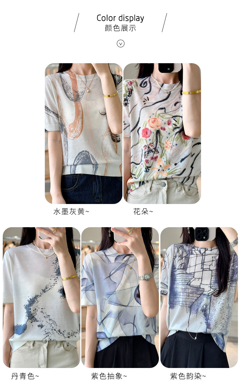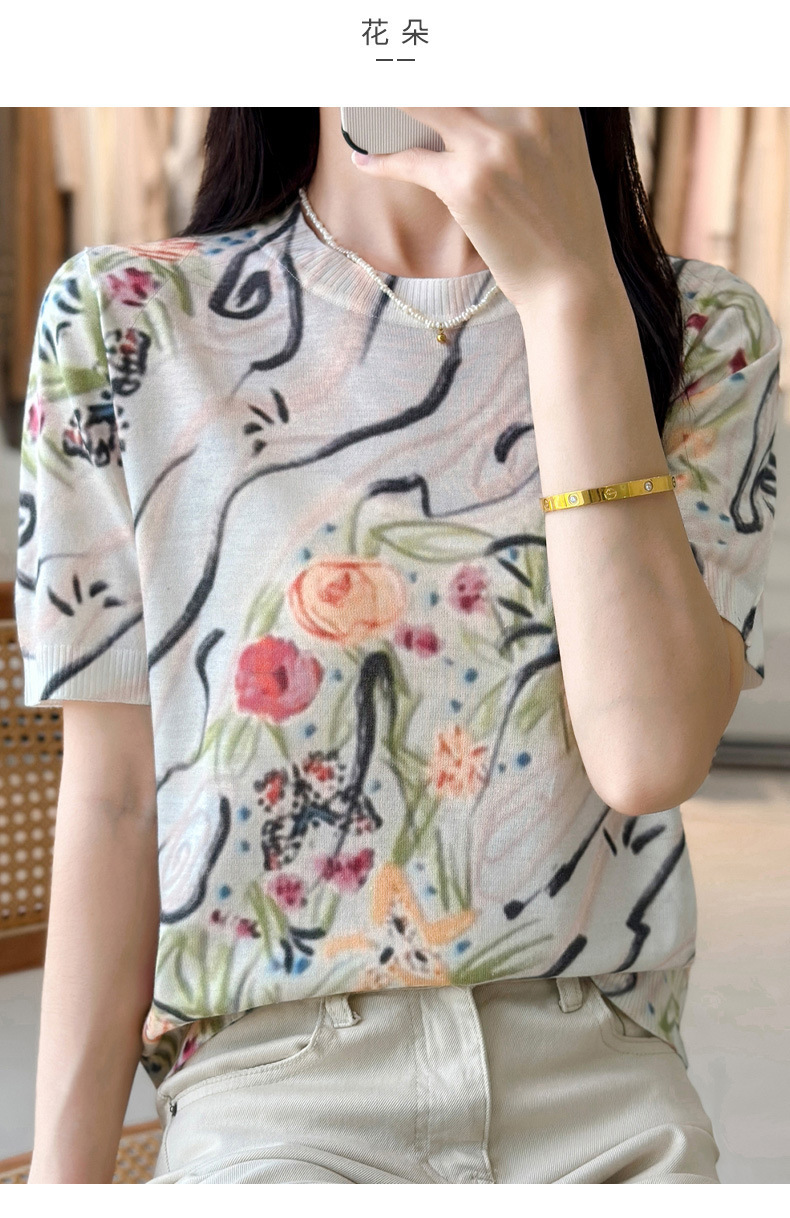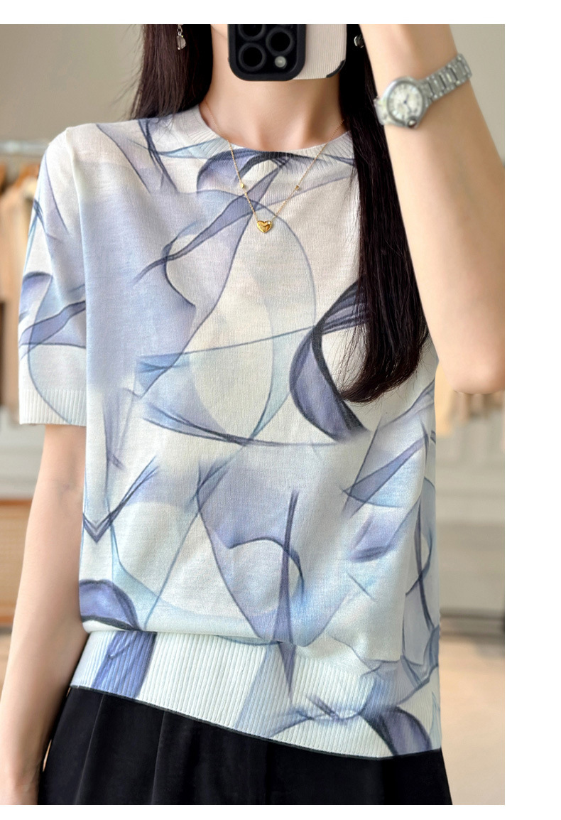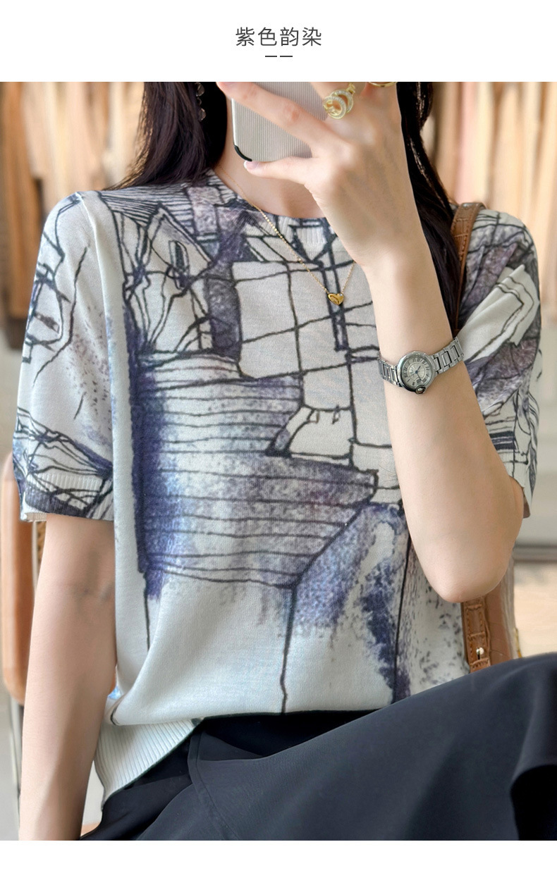 丁摩 夏季新款半袖羊毛+桑蚕丝针织衫女百搭半袖圆领减龄洋气上衣5ZF-2330