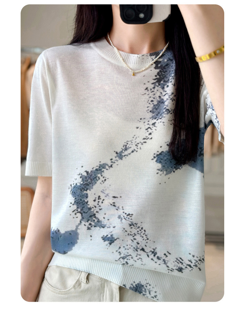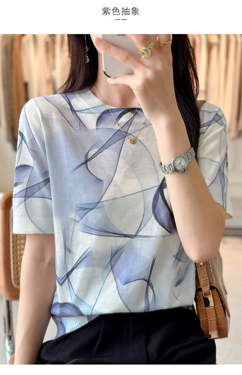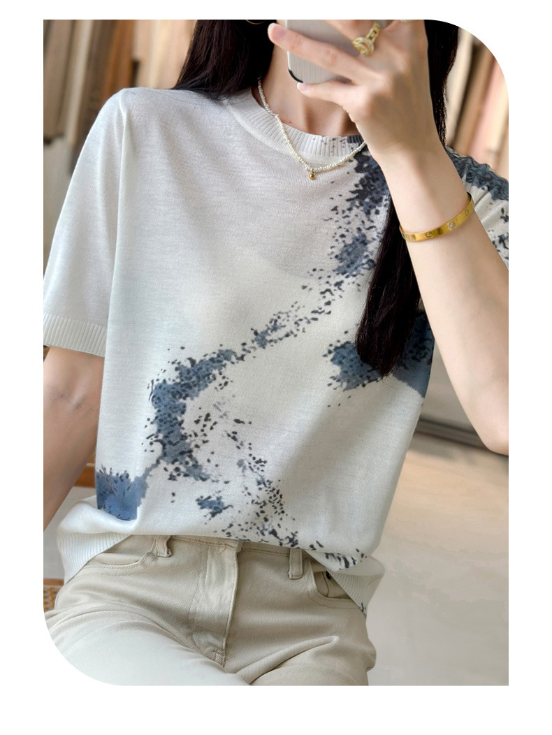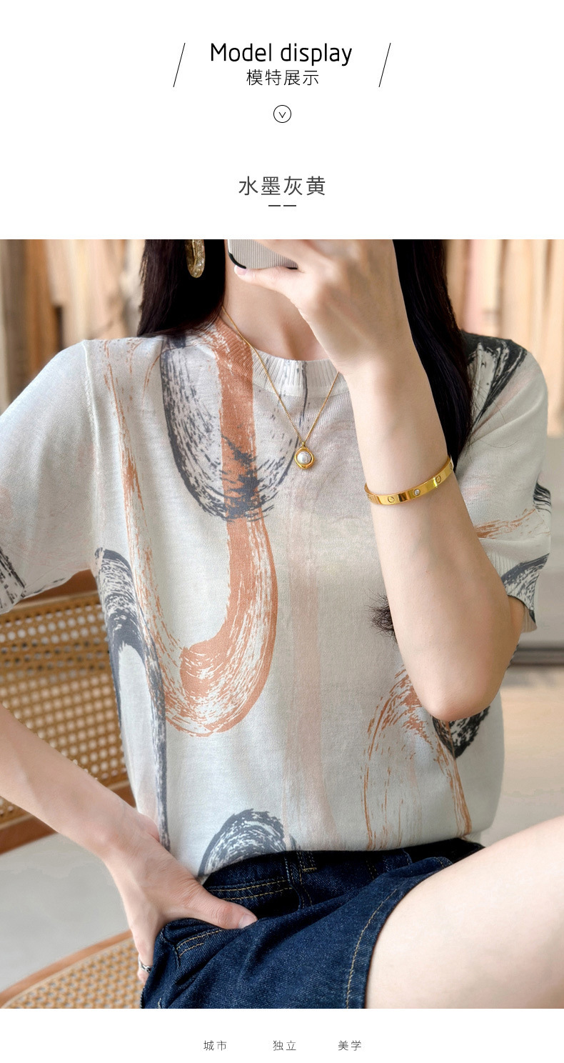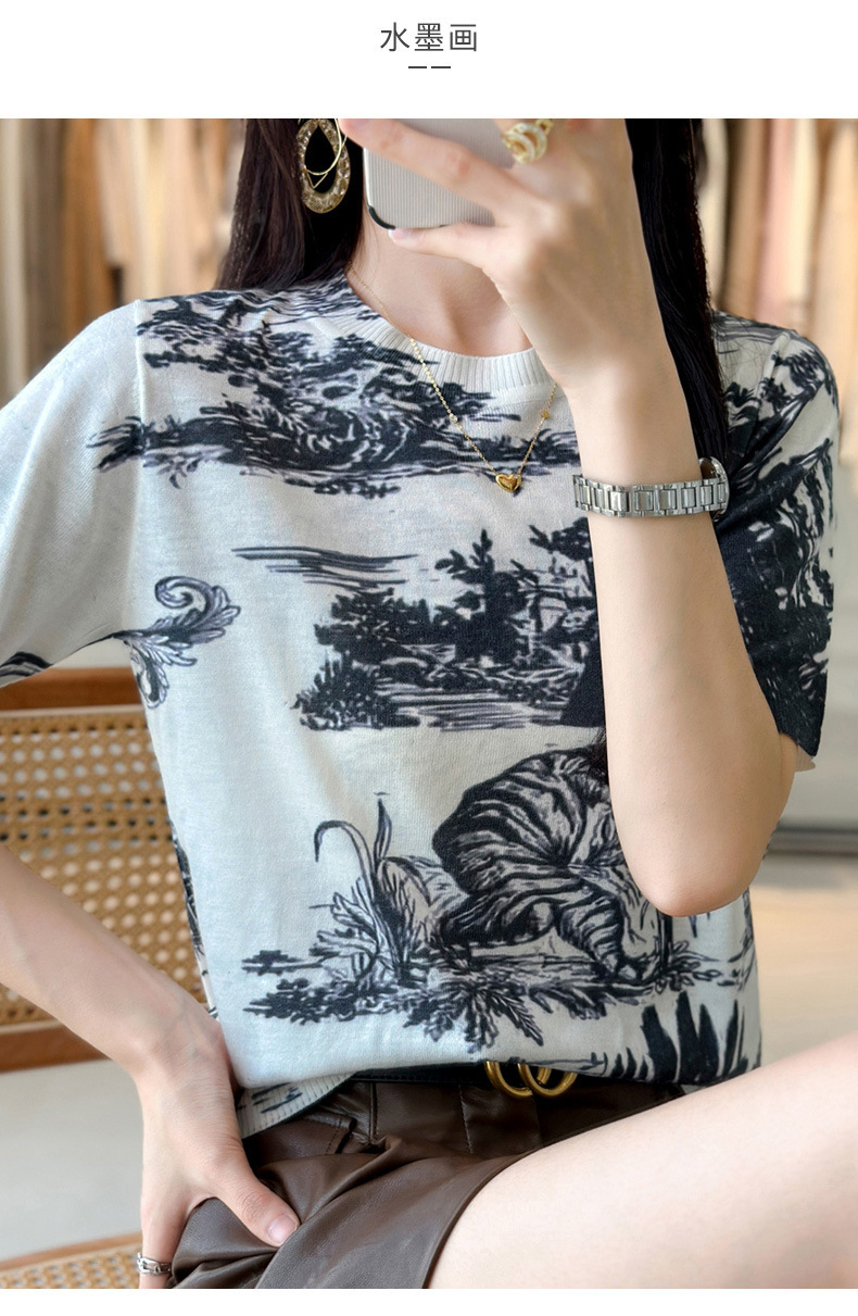 丁摩 夏季新款半袖羊毛+桑蚕丝针织衫女百搭半袖圆领减龄洋气上衣5ZF-2330