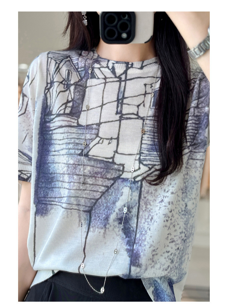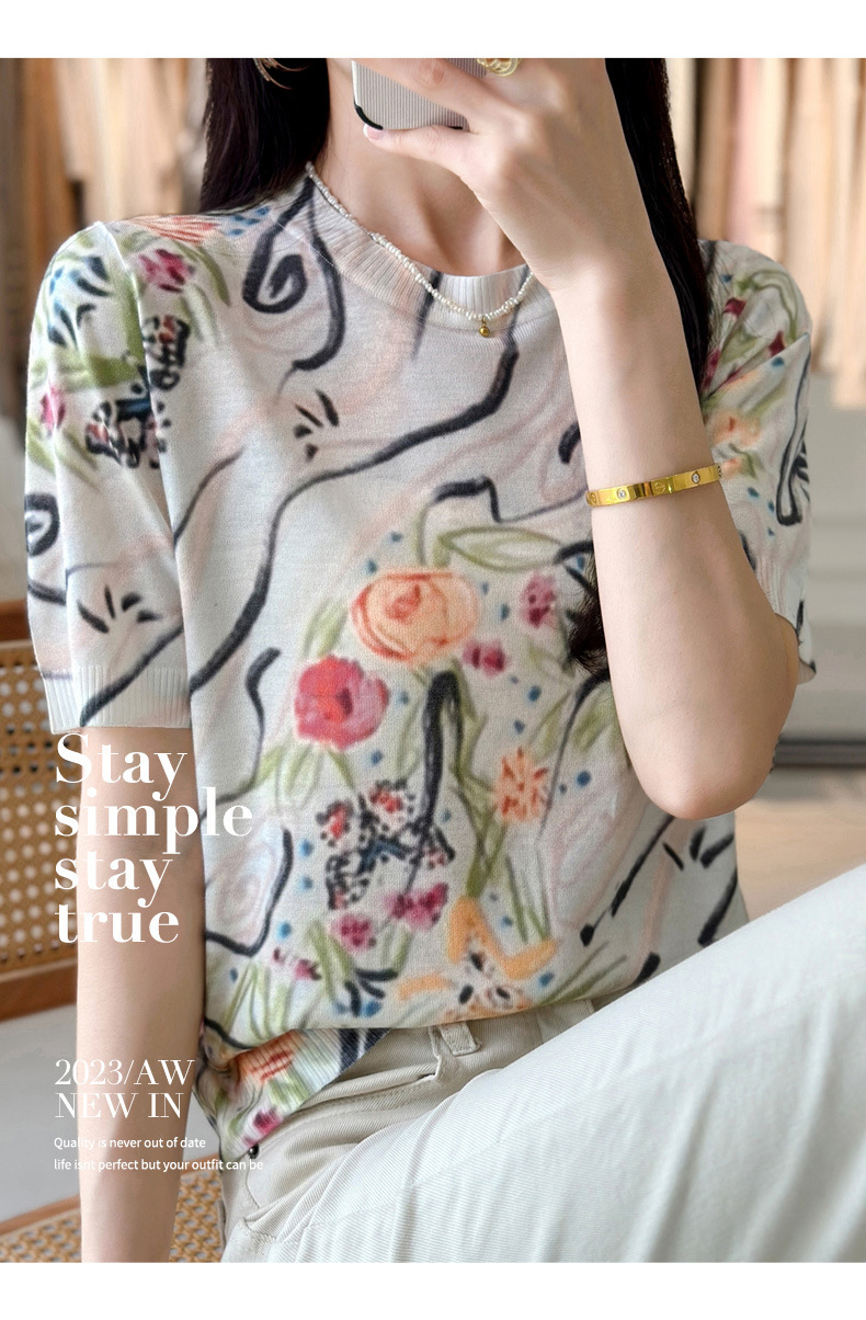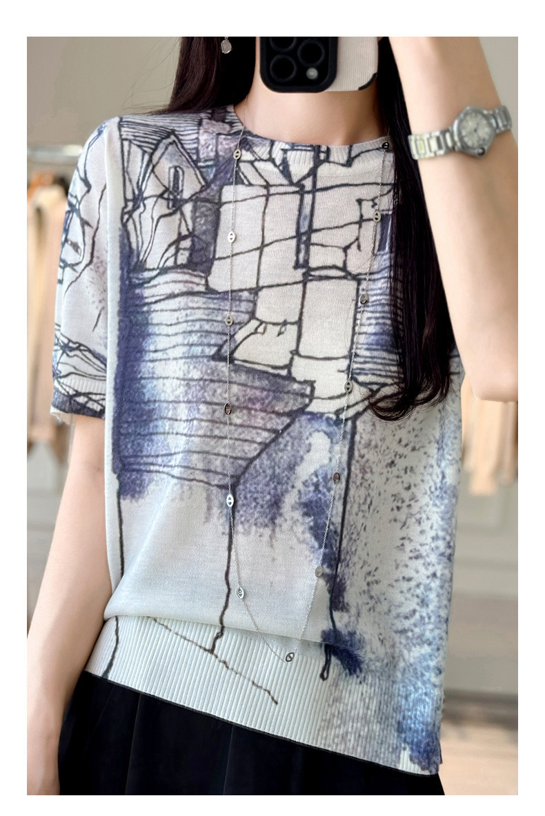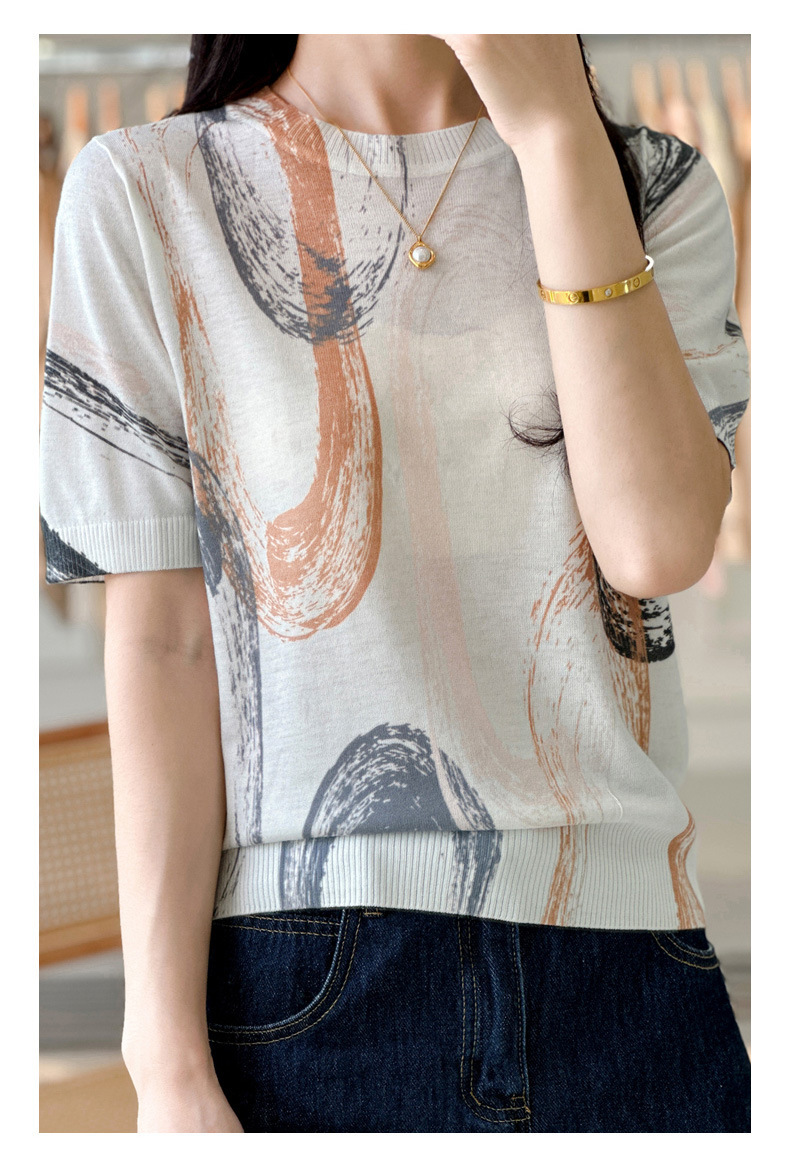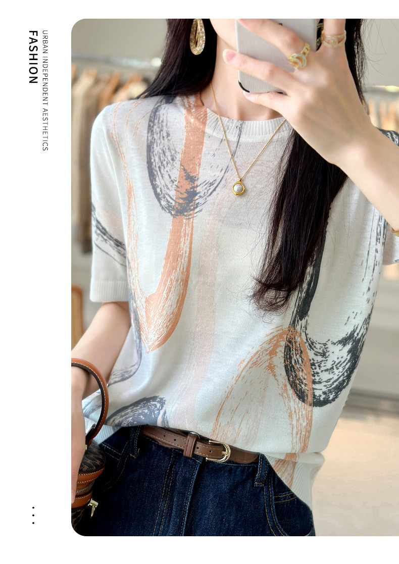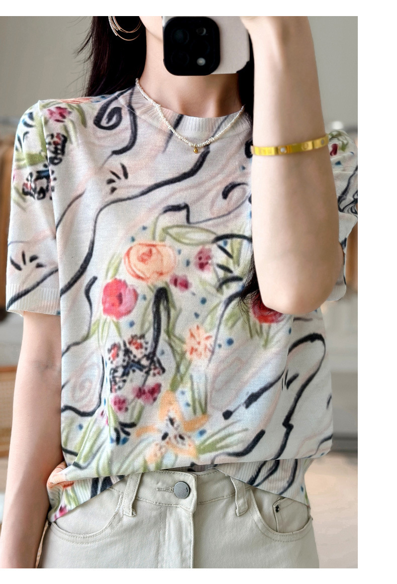 丁摩 夏季新款半袖羊毛+桑蚕丝针织衫女百搭半袖圆领减龄洋气上衣5ZF-2330