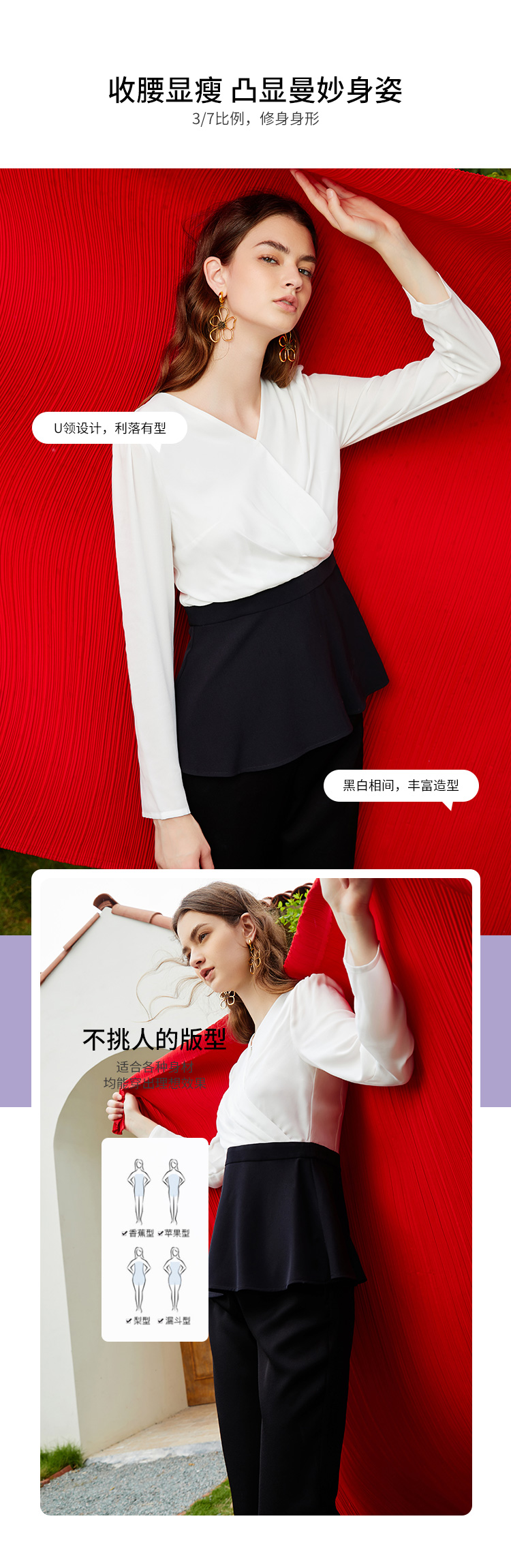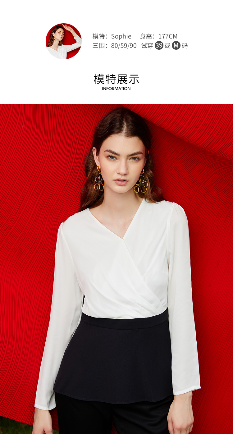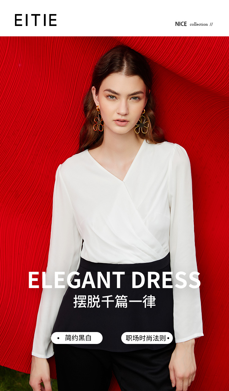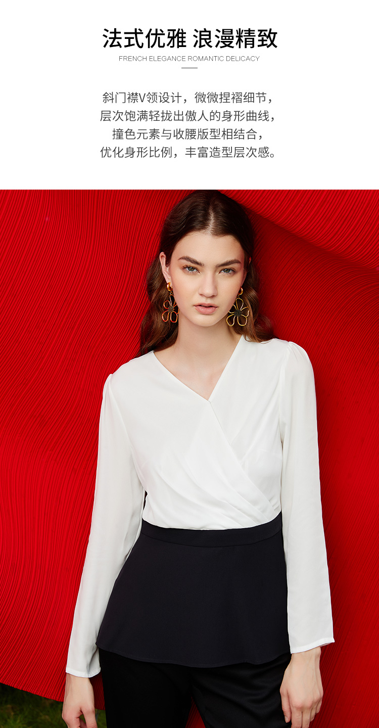 EITIE爱特爱气质通勤职业撞色V领显瘦收腰上衣女C2113814