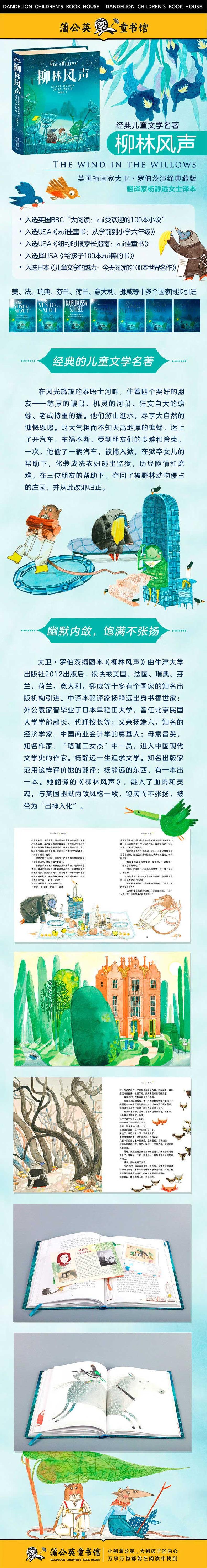 大卫·罗伯茨插图本《柳林风声》由牛津大学出版社2012出版后,很快被美国、法国、瑞典、芬兰、荷兰、意大利、挪威等十多有个国家的知名出版机构引进。中译本翻译家杨静远出身书香世家:外公袁家普毕业于日本早稻田大学,曾任北京民国大学学部部长、代理校长等;父亲杨端六,知名的经济学家,中国商业会计学的奠基人;母袁昌英,知名作家,“珞珈三女杰”中一员,进入中国现代文学史的作家。杨静远一生追求文学。知名出版家范用这样评价她的翻译:杨静远的东西,有一本出一本。她翻译的《柳林风声》,融入了血肉和灵魂,与英国幽默内敛风格一致,饱满而不张扬,被誉为“出神入化”。