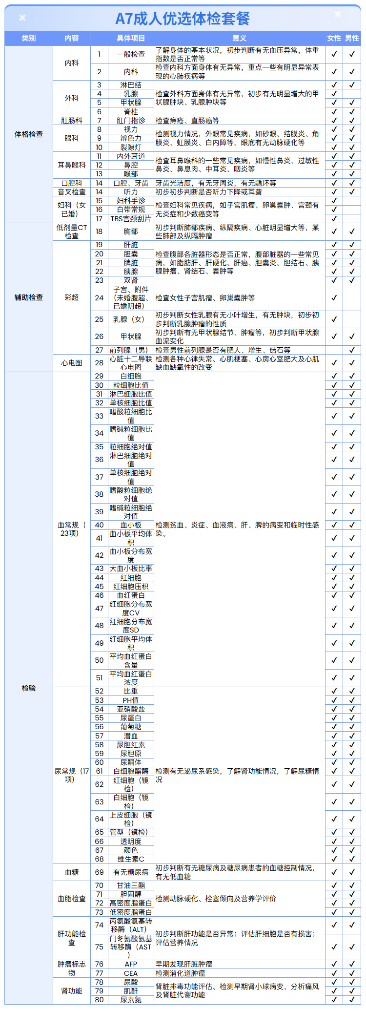 【男女通用|优选升级】含胸部CT+七彩超+心电图+肝肾功能+肿瘤两项 A7