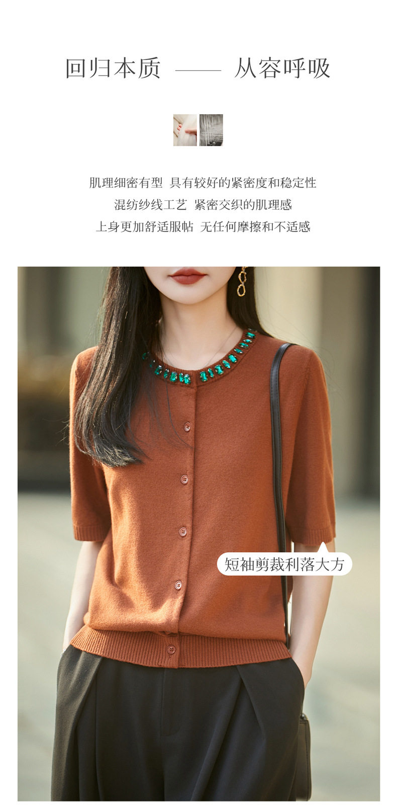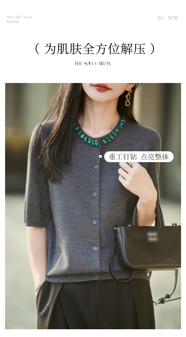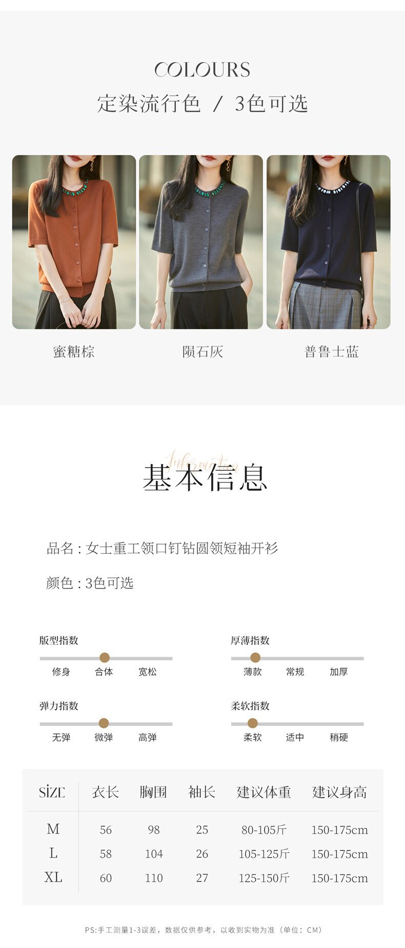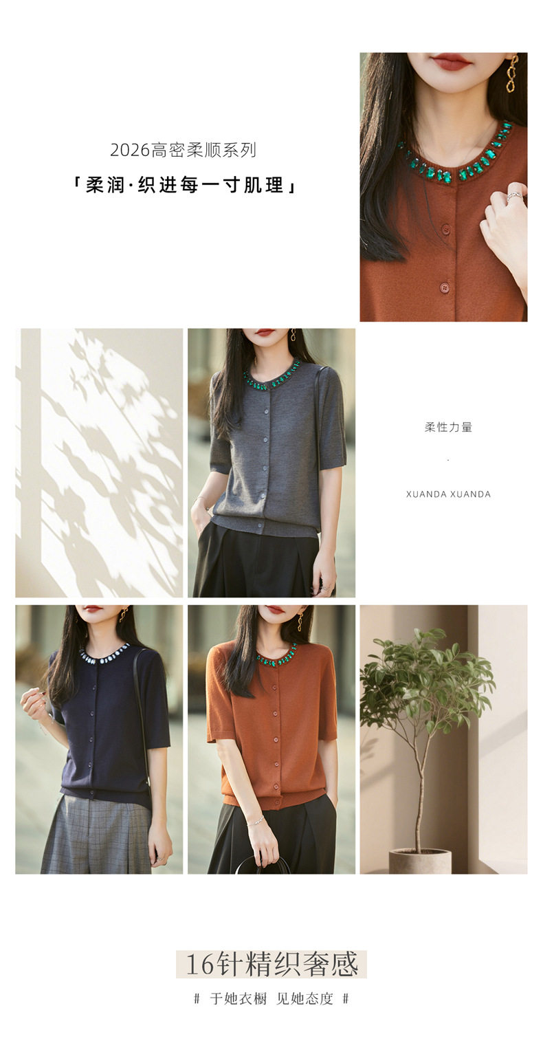 「自」全新升级【铂金会员174/天猫229/差价55】(12353)洛诗琳新款重工钉钻领针织T恤2026夏季新款羊毛蚕丝宽松短袖
