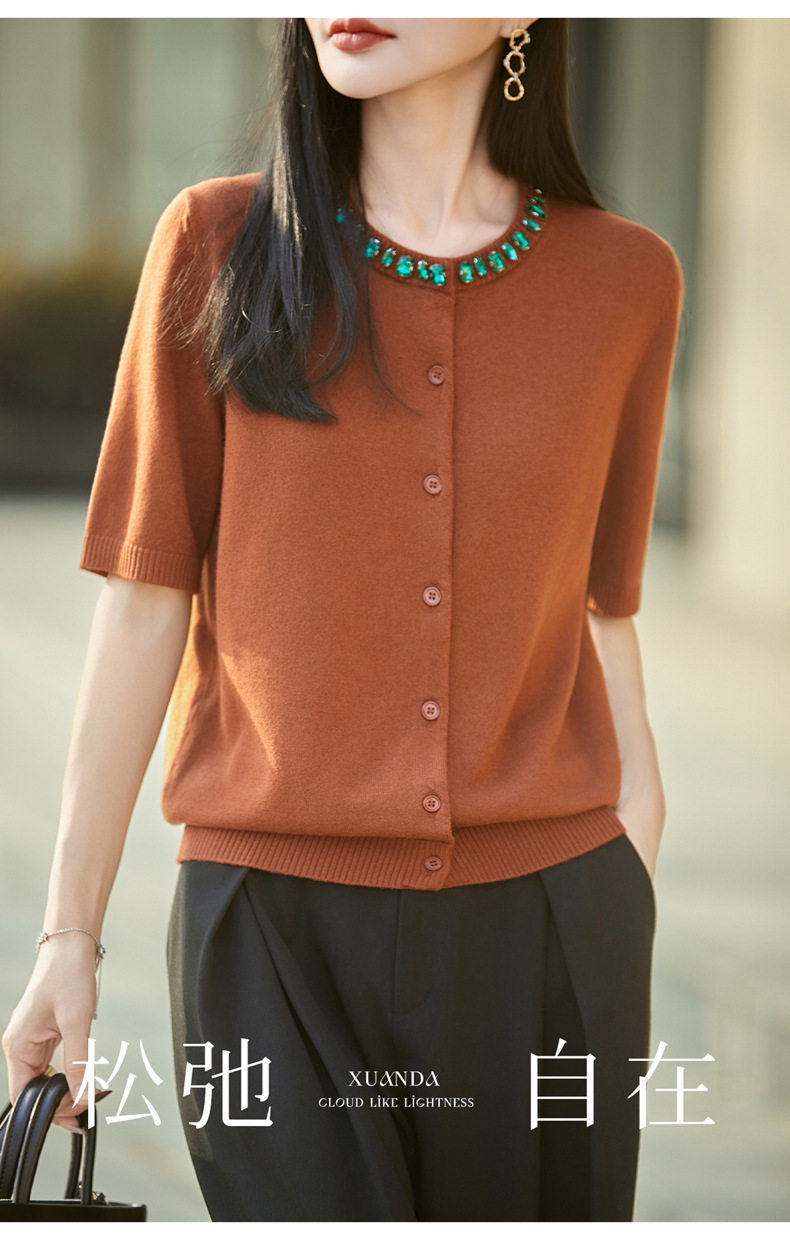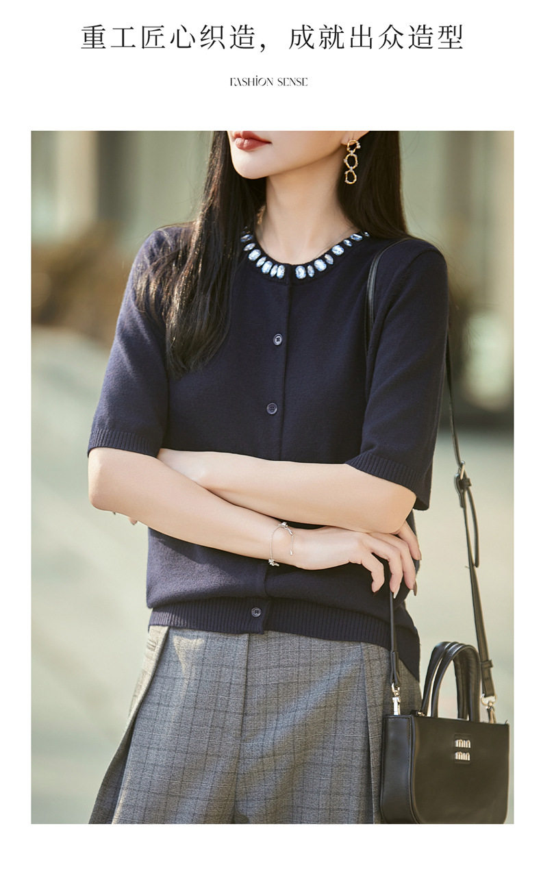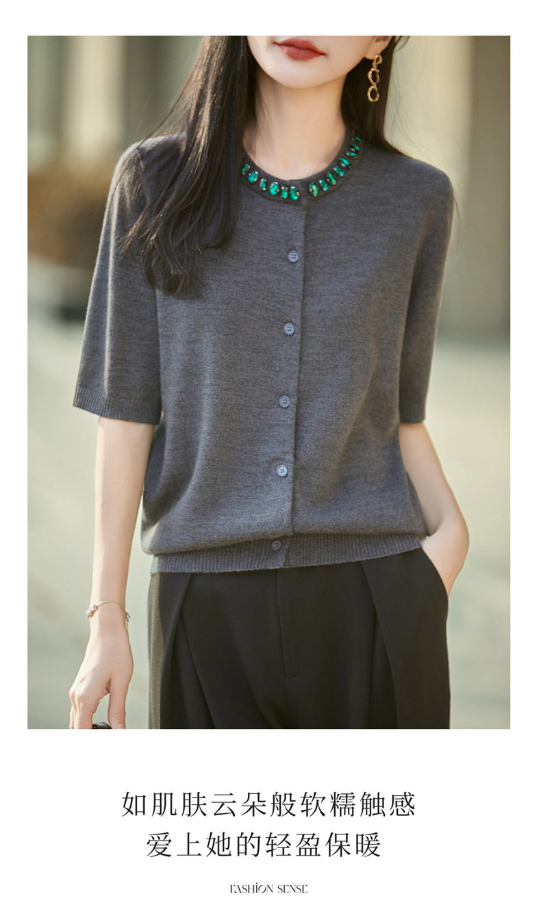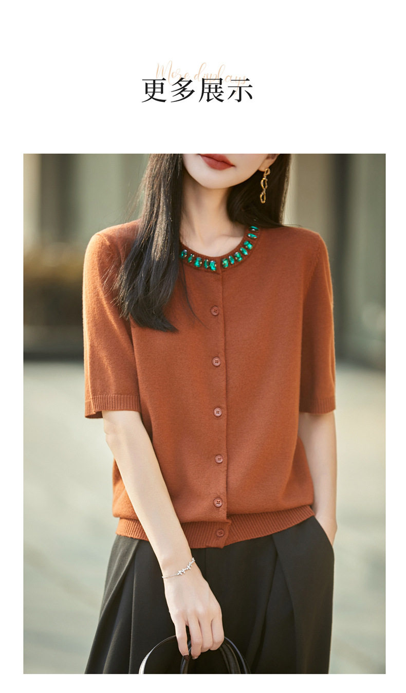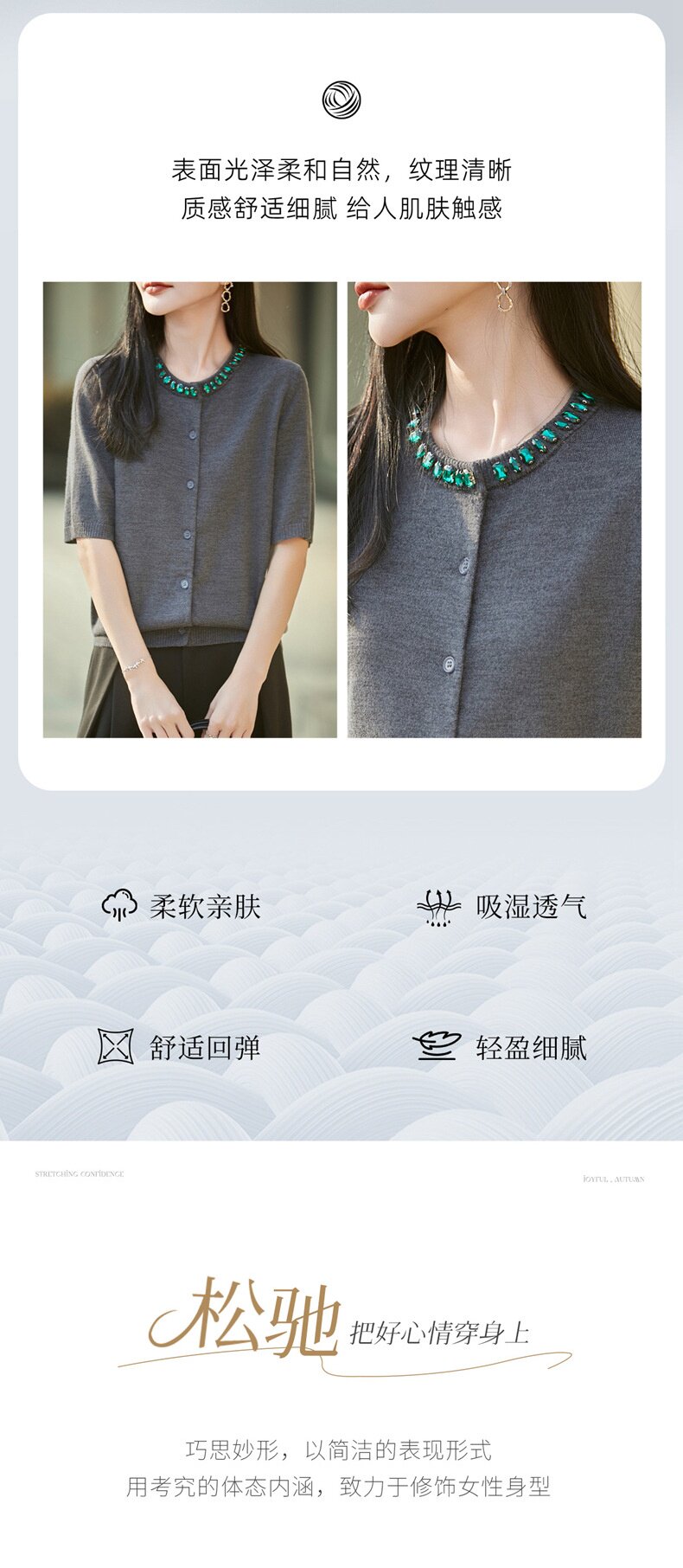 「自」全新升级【铂金会员174/天猫229/差价55】(12353)洛诗琳新款重工钉钻领针织T恤2026夏季新款羊毛蚕丝宽松短袖