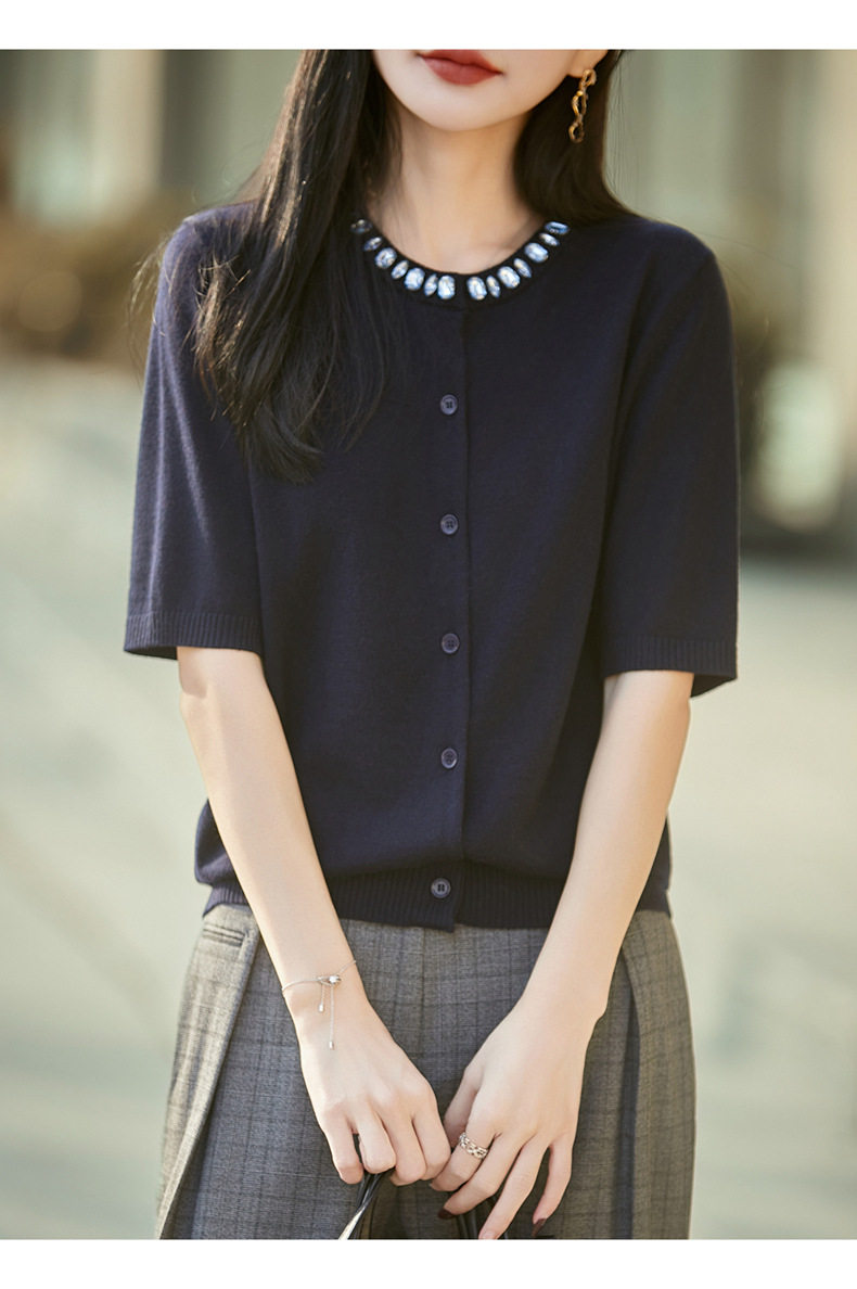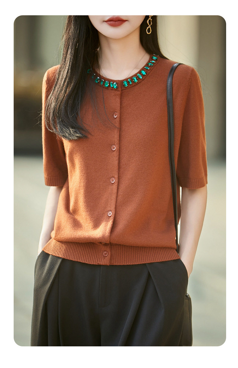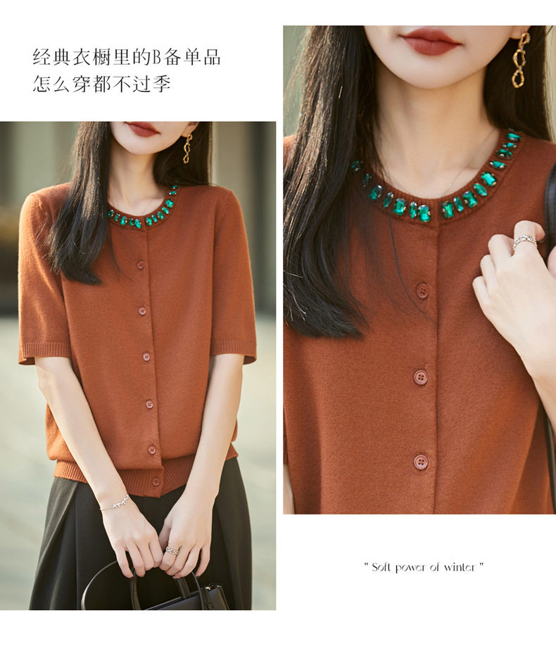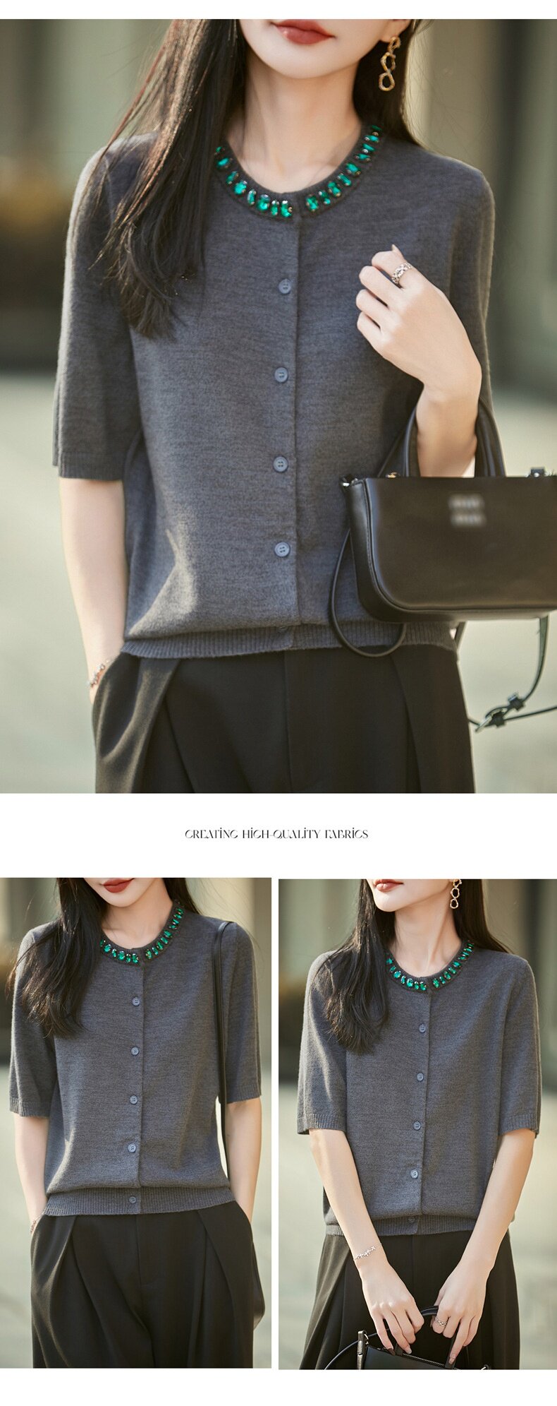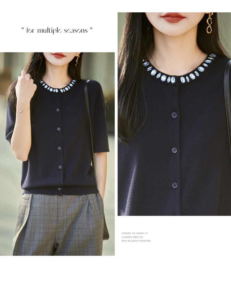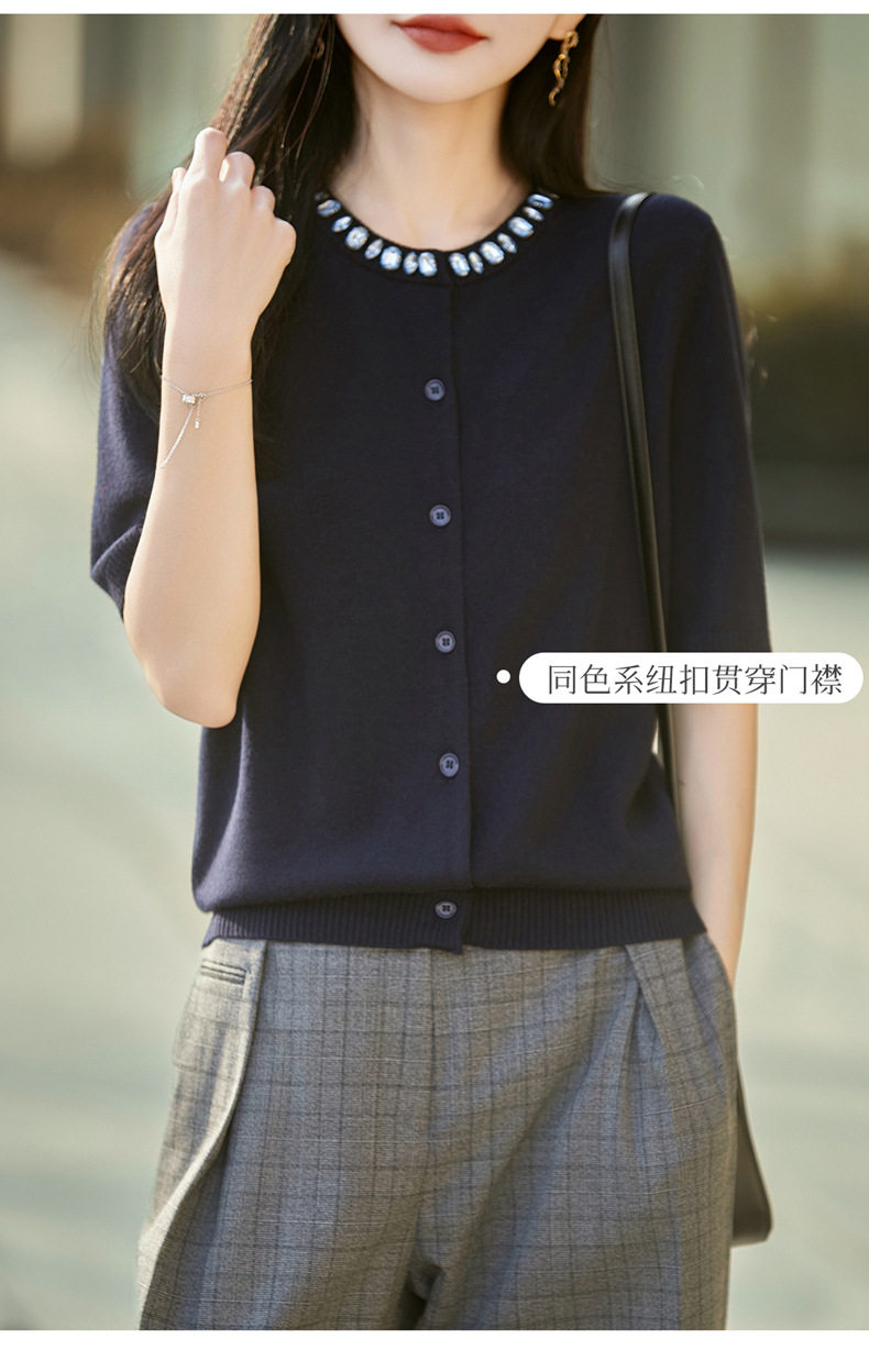 「自」全新升级【铂金会员174/天猫229/差价55】(12353)洛诗琳新款重工钉钻领针织T恤2026夏季新款羊毛蚕丝宽松短袖