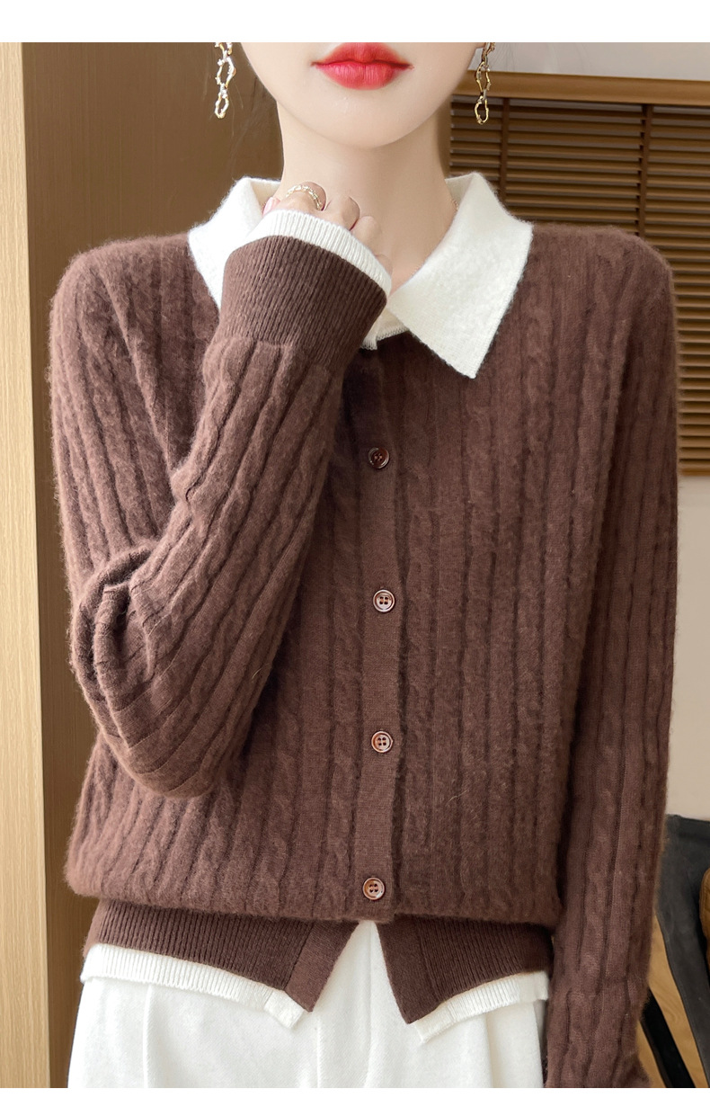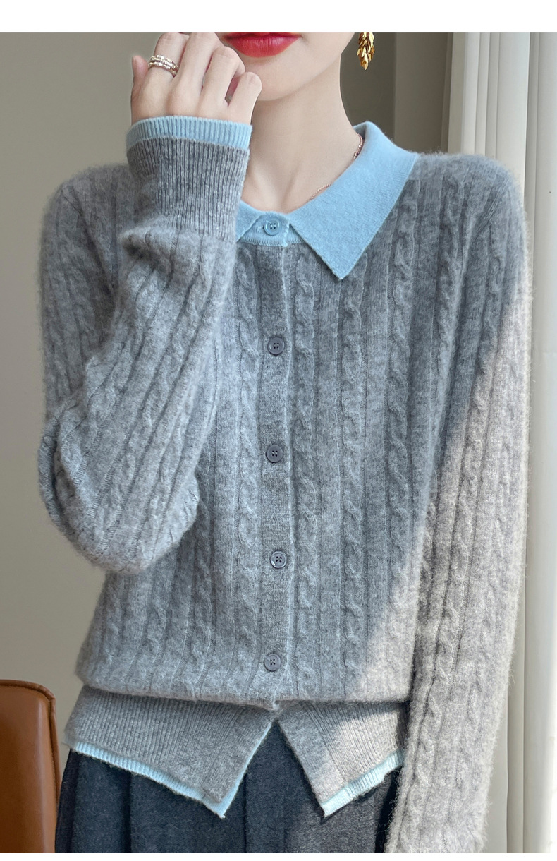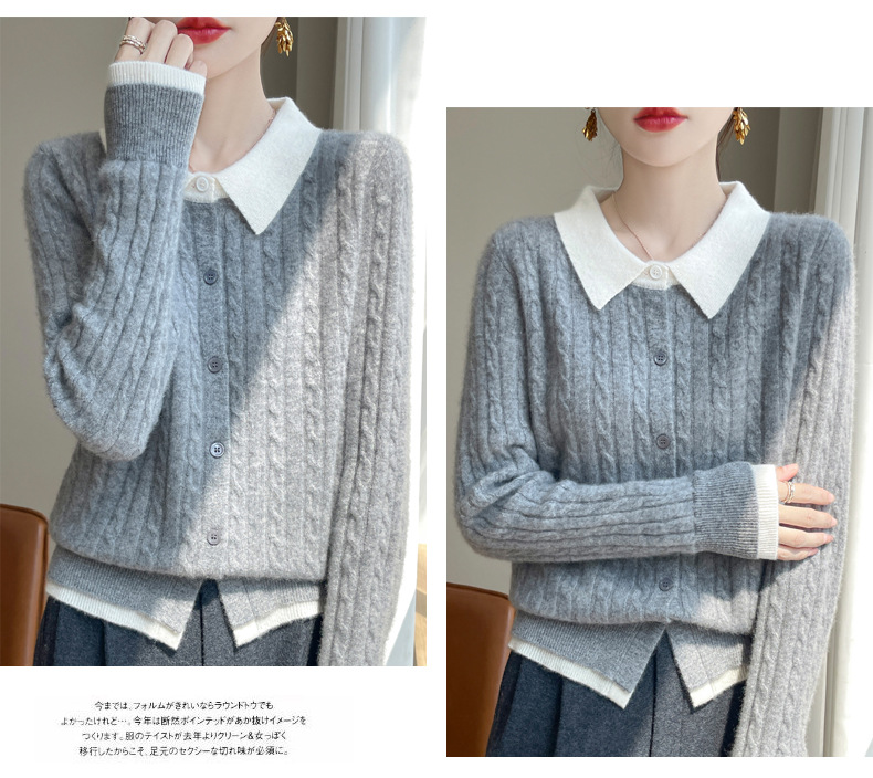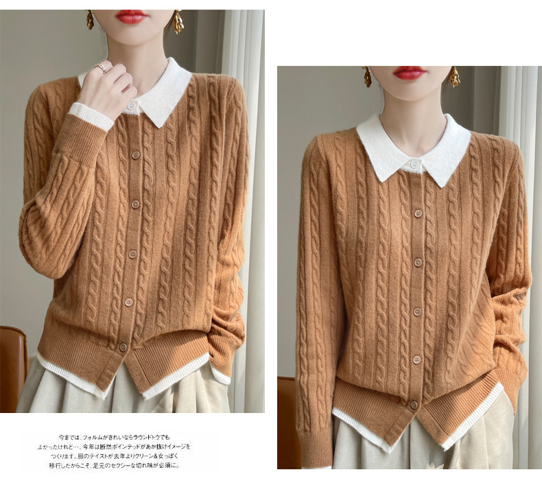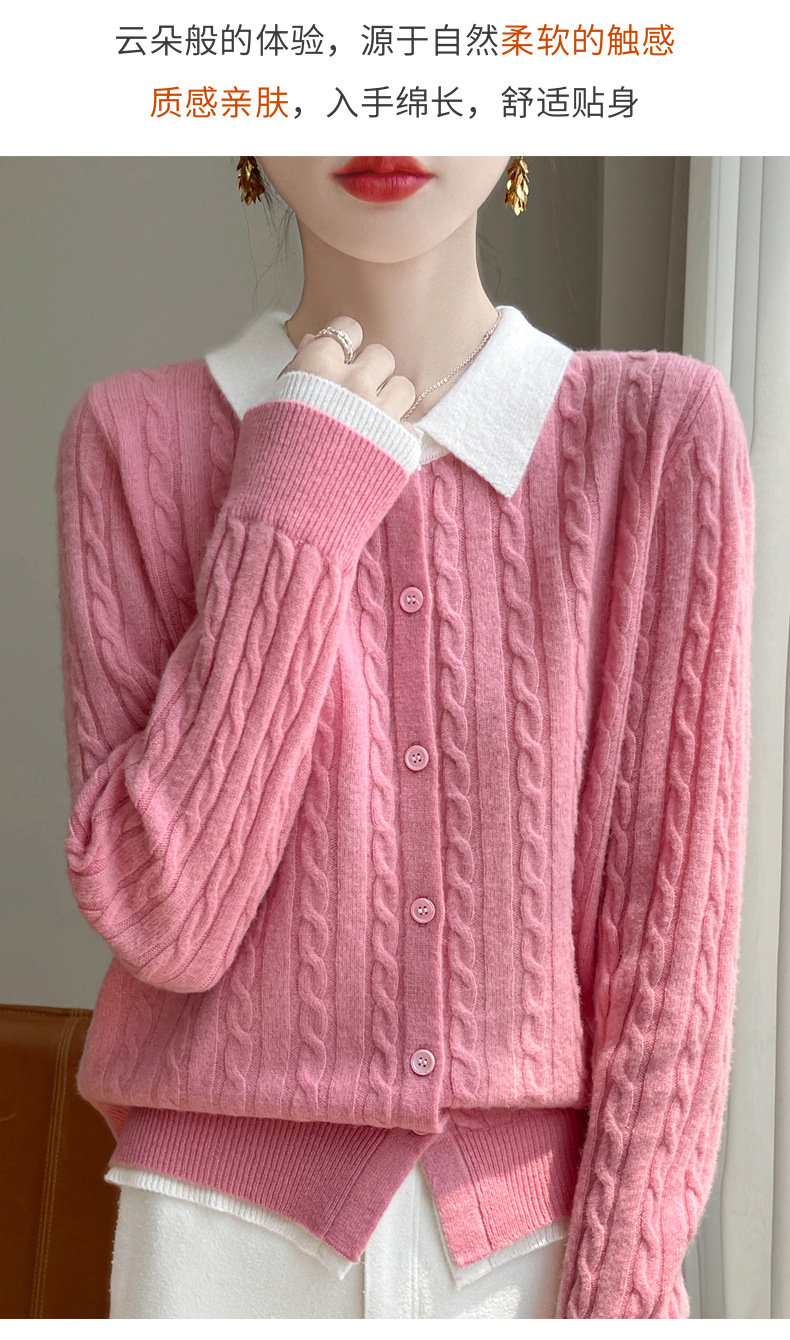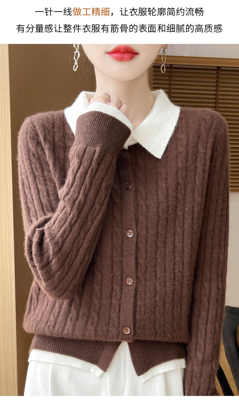 QHJY-J1127秋冬100安迪绒翻领假两件绞花拼接针织开衫上衣外套