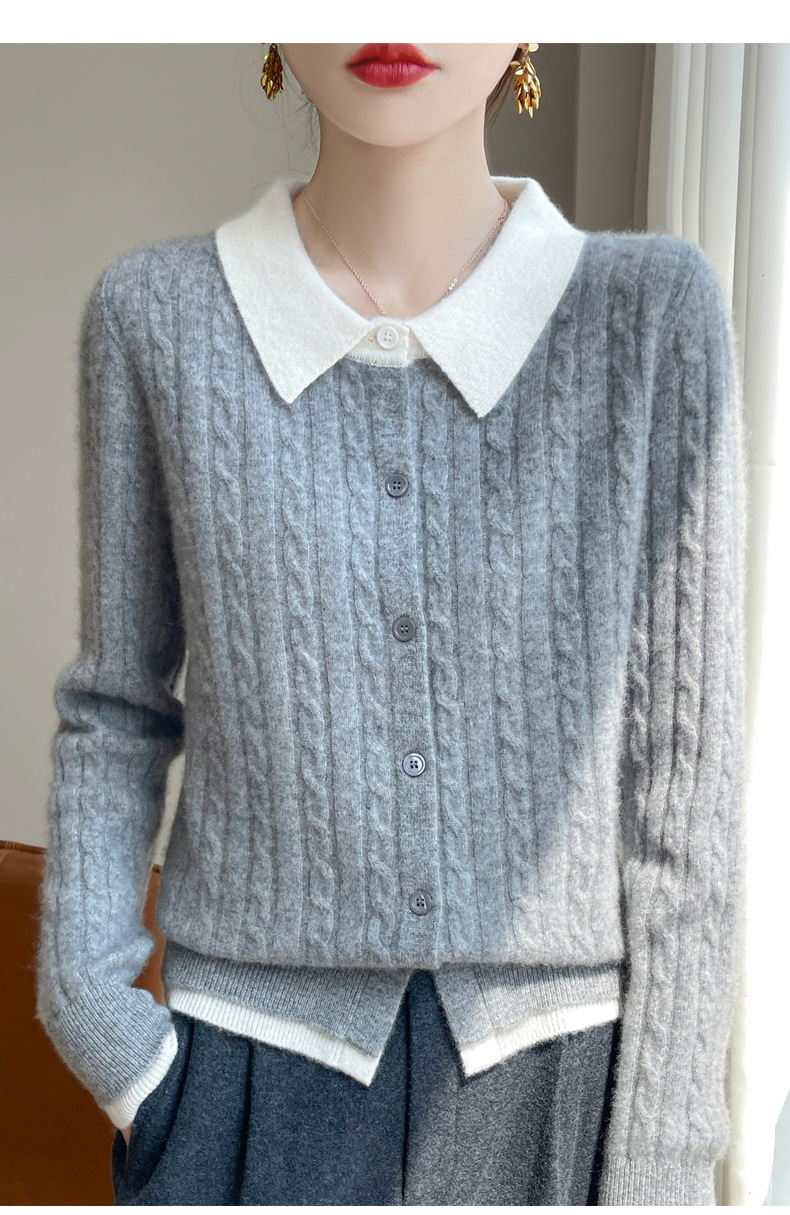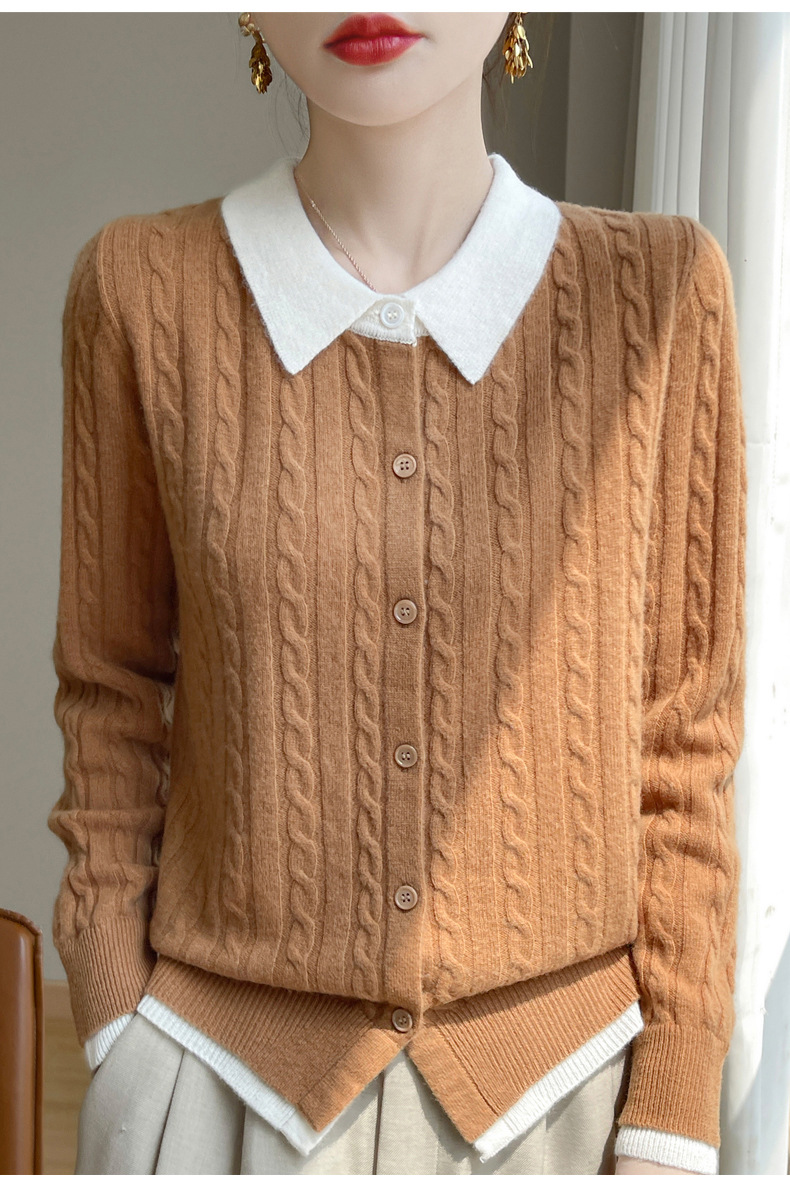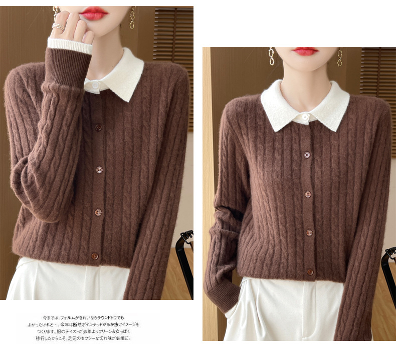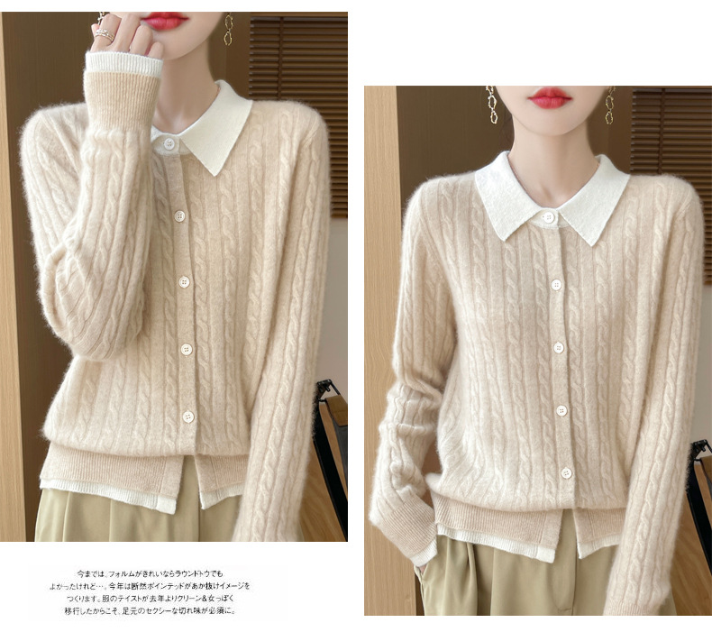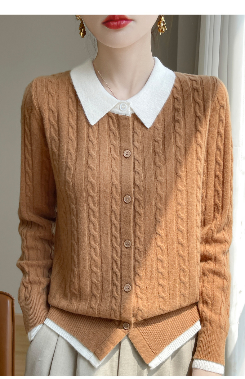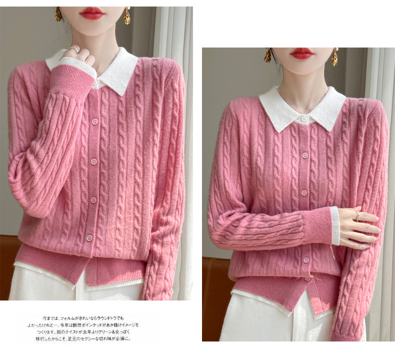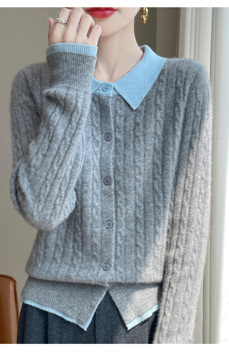 QHJY-J1127秋冬100安迪绒翻领假两件绞花拼接针织开衫上衣外套