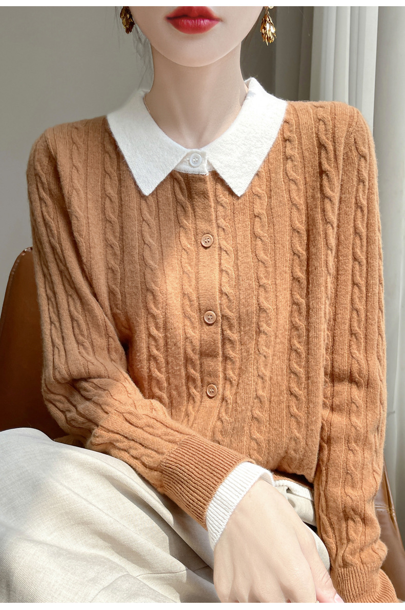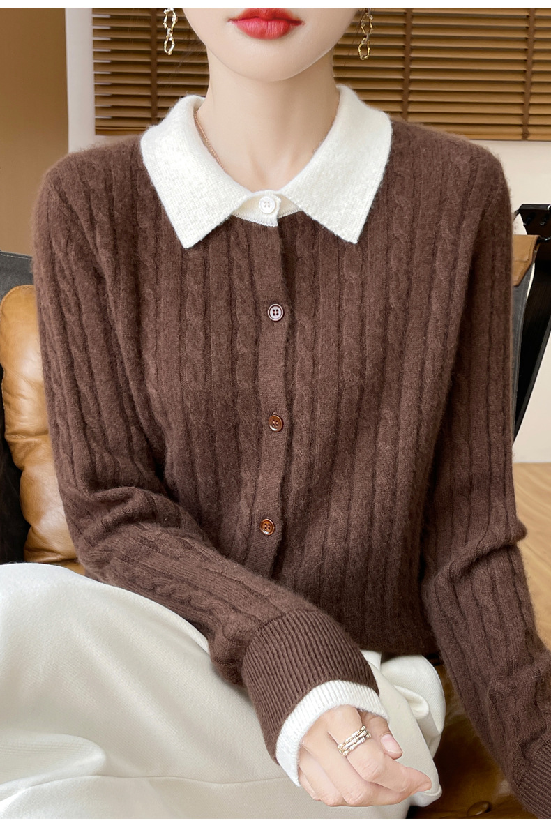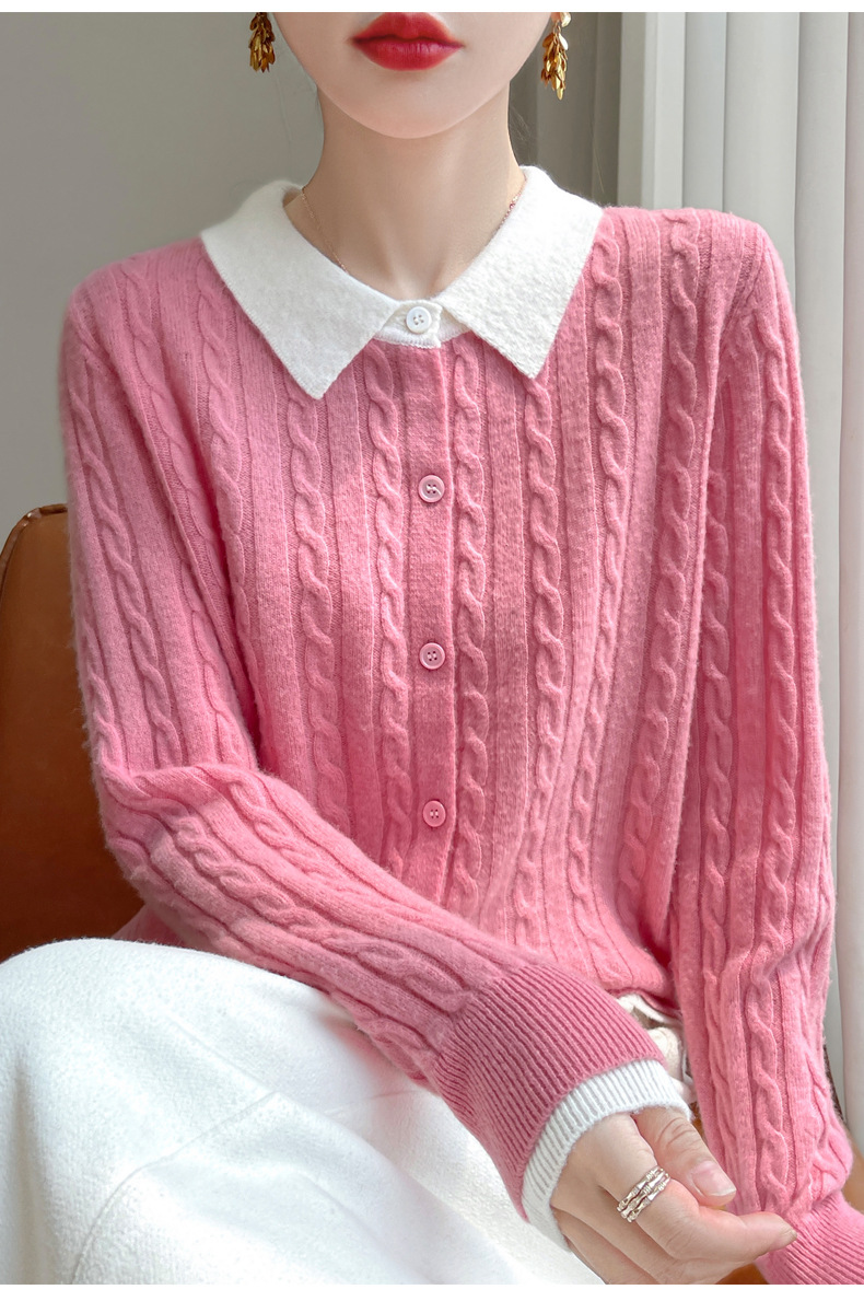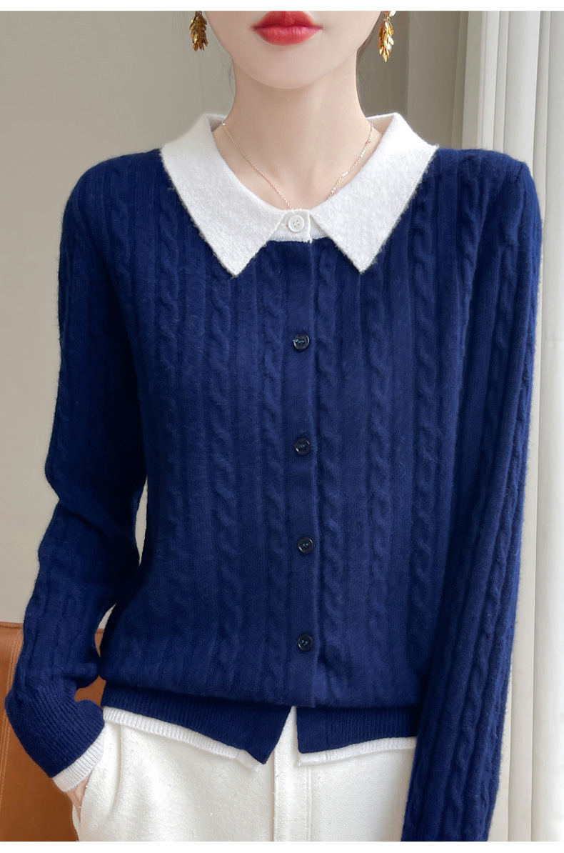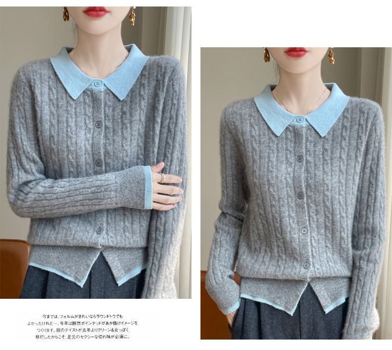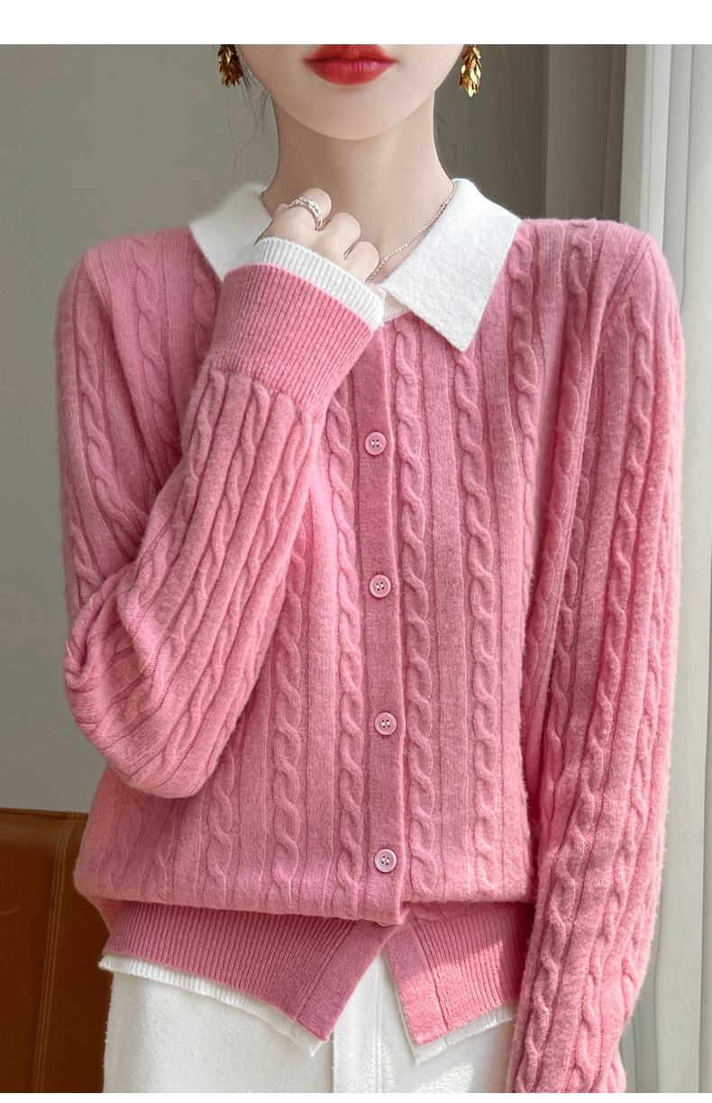 QHJY-J1127秋冬100安迪绒翻领假两件绞花拼接针织开衫上衣外套