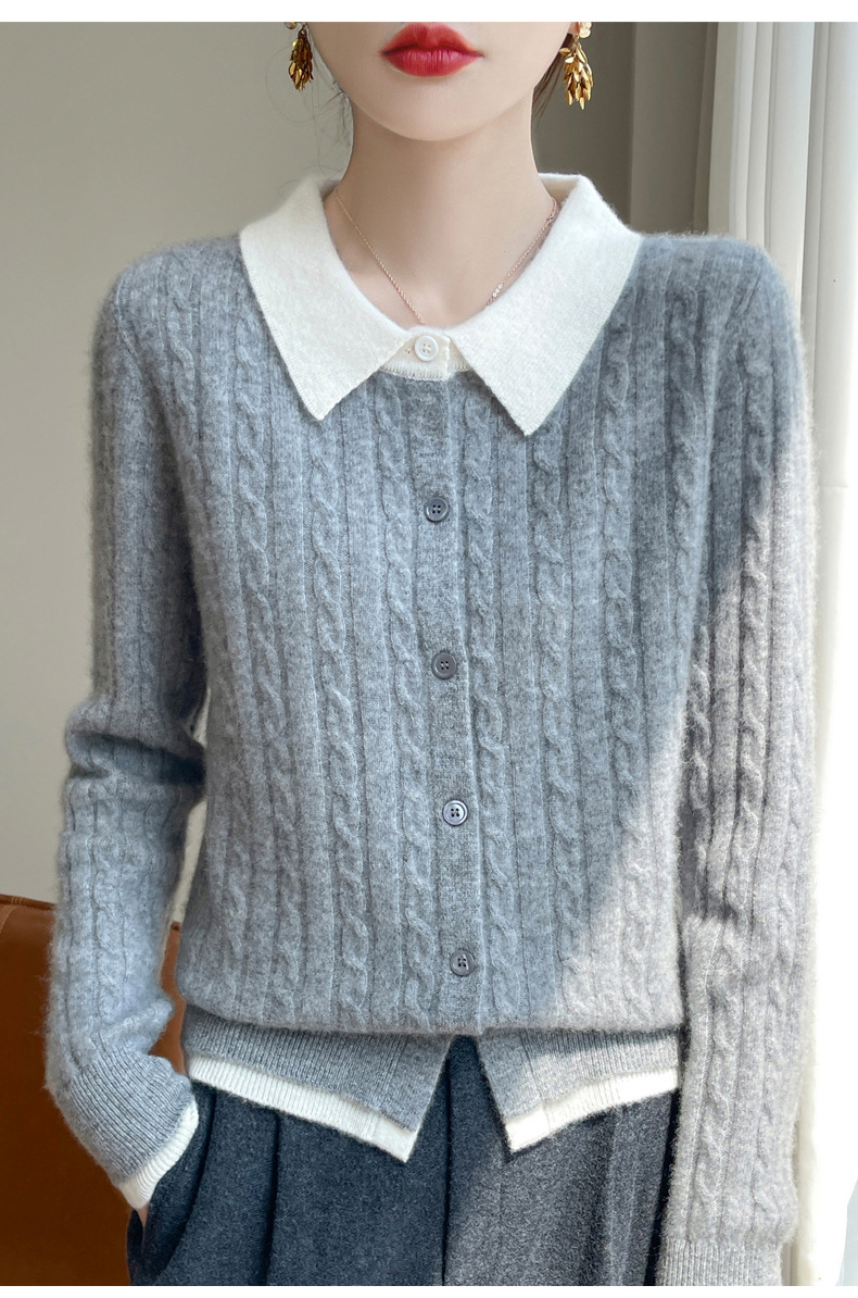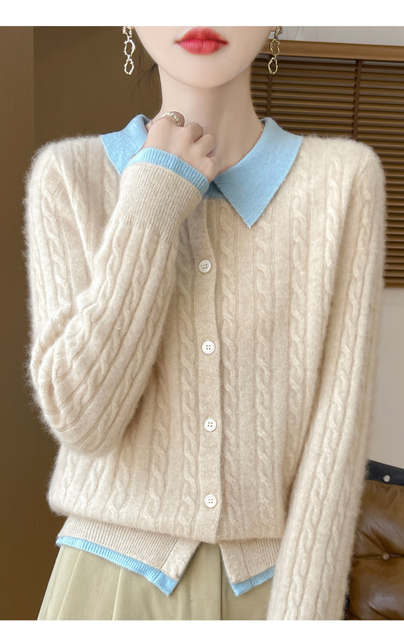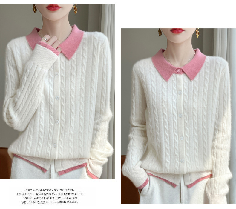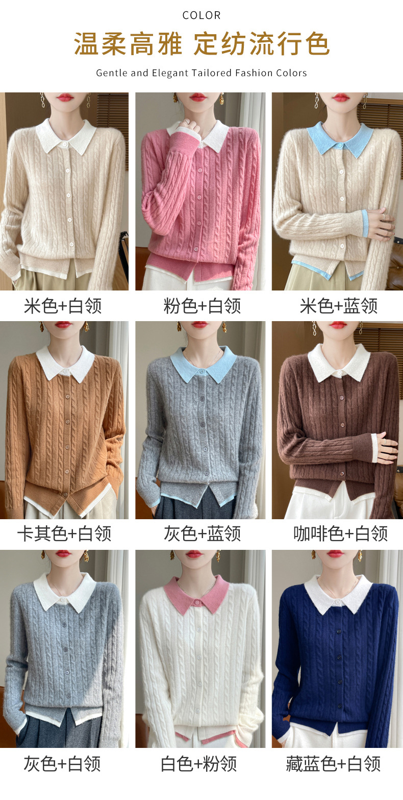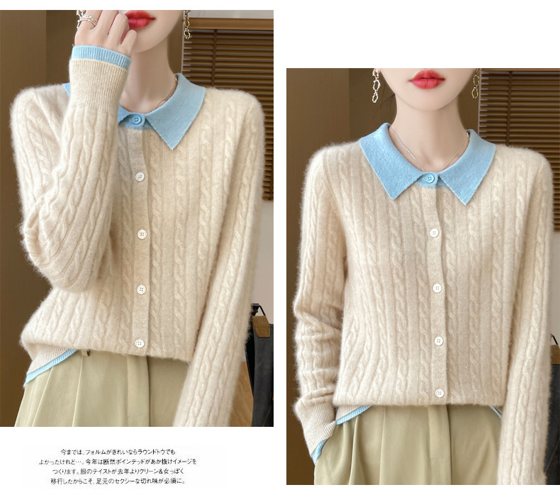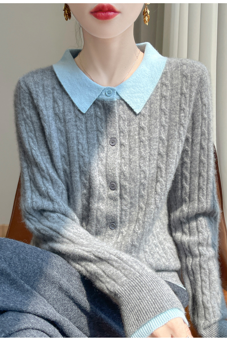 QHJY-J1127秋冬100安迪绒翻领假两件绞花拼接针织开衫上衣外套