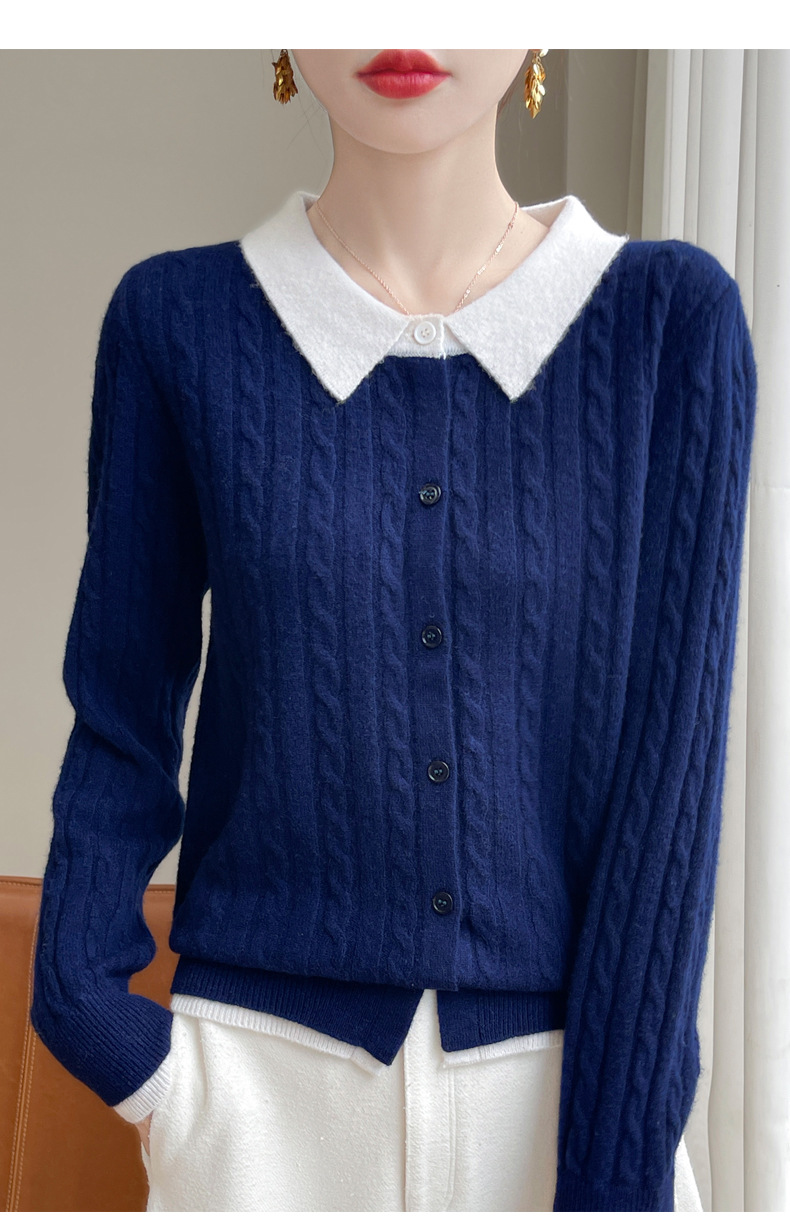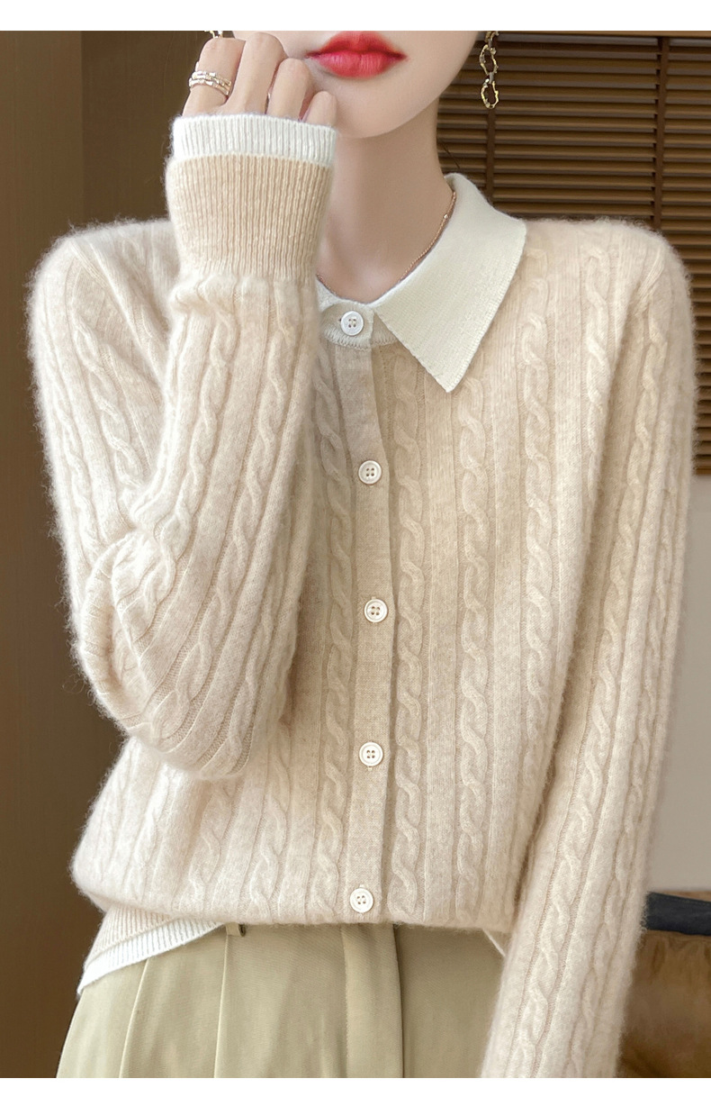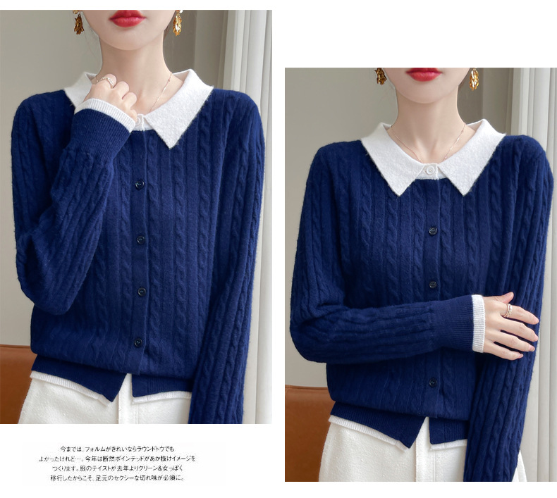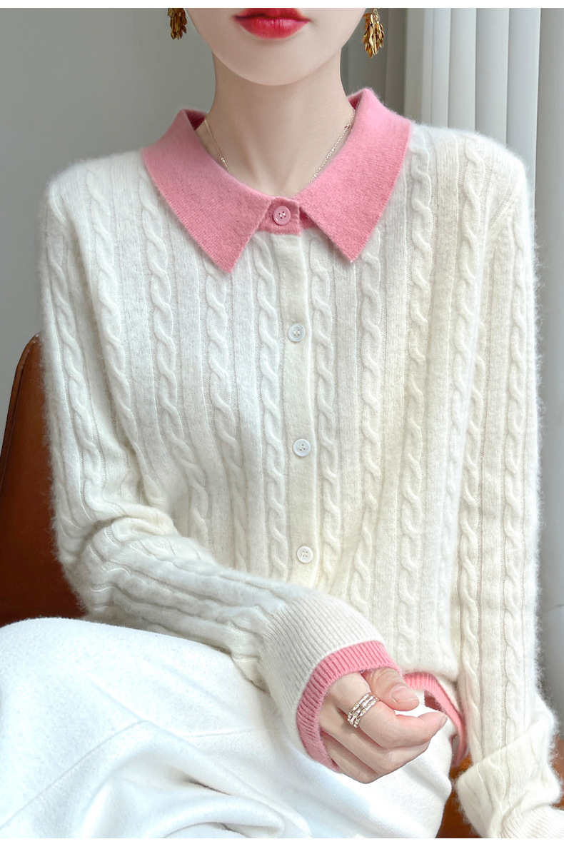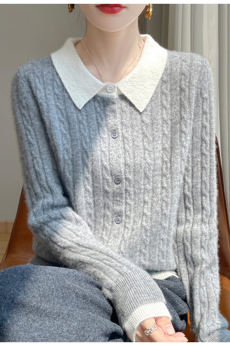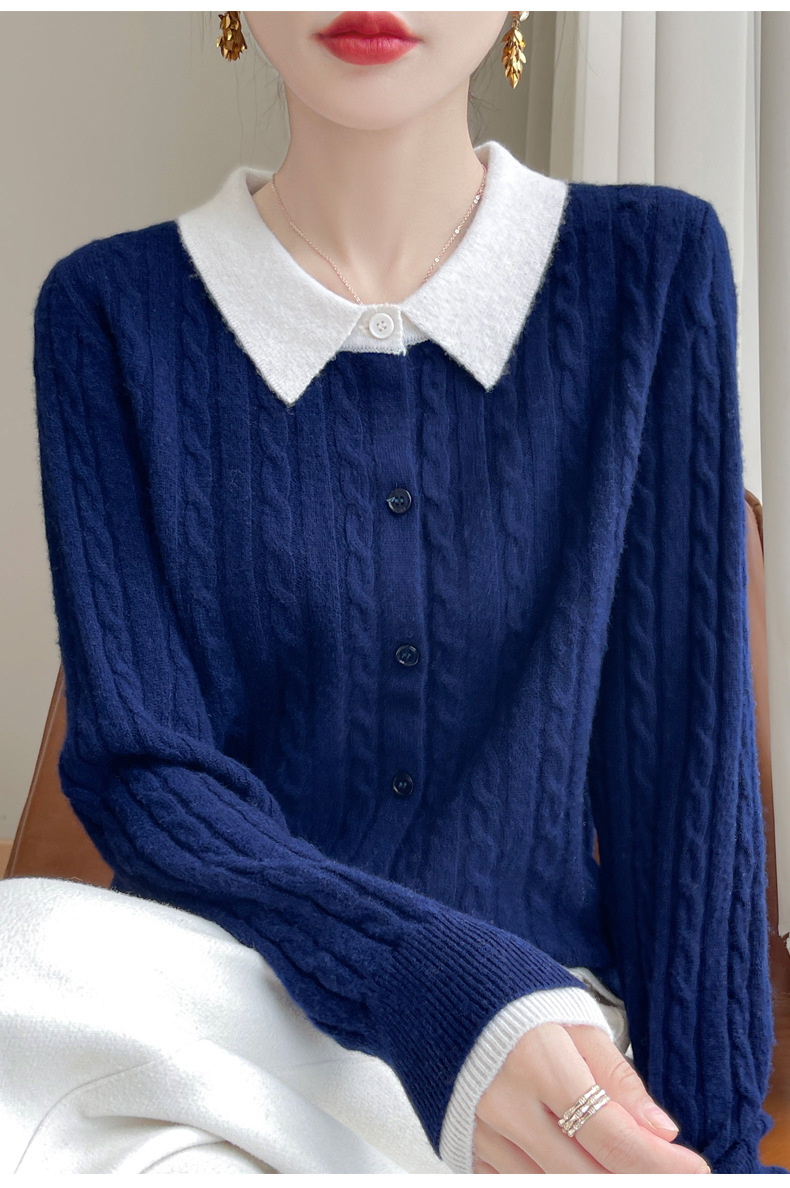 QHJY-J1127秋冬100安迪绒翻领假两件绞花拼接针织开衫上衣外套