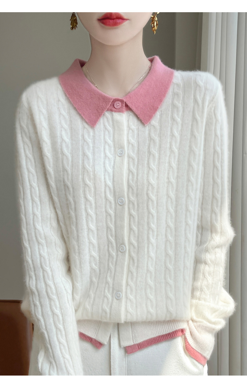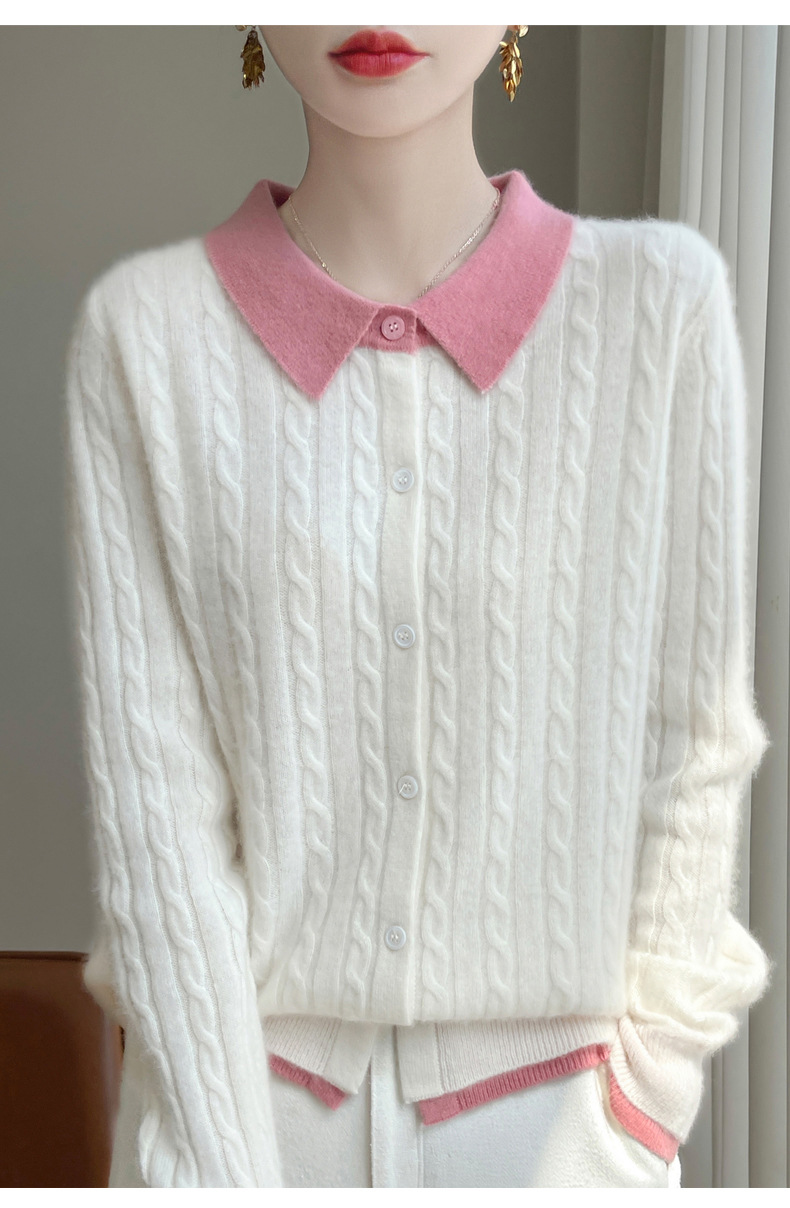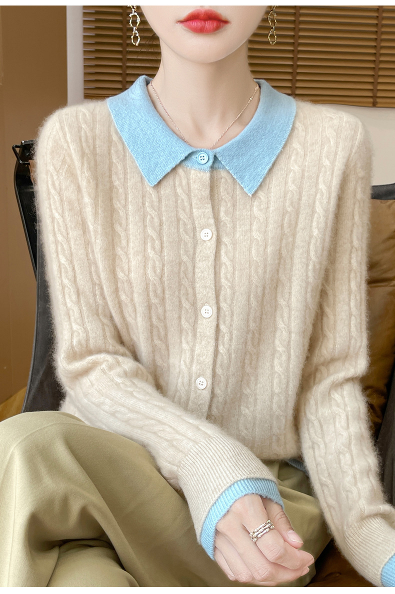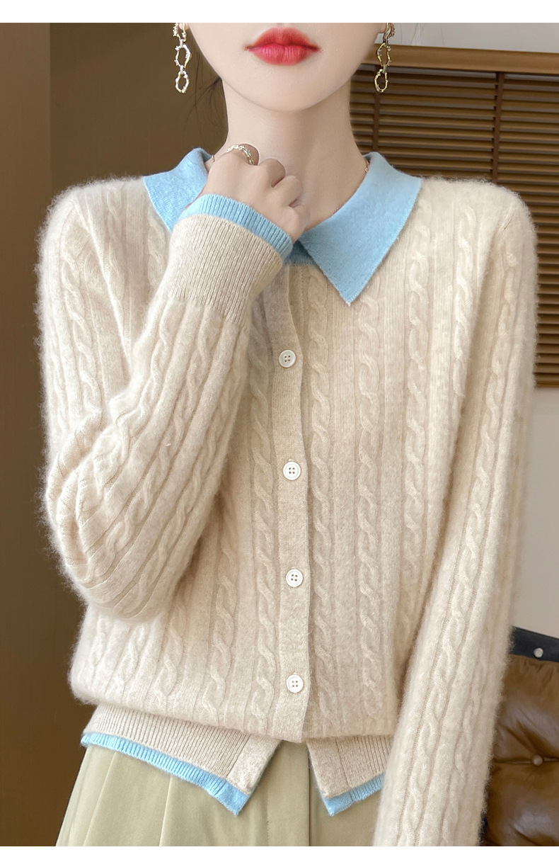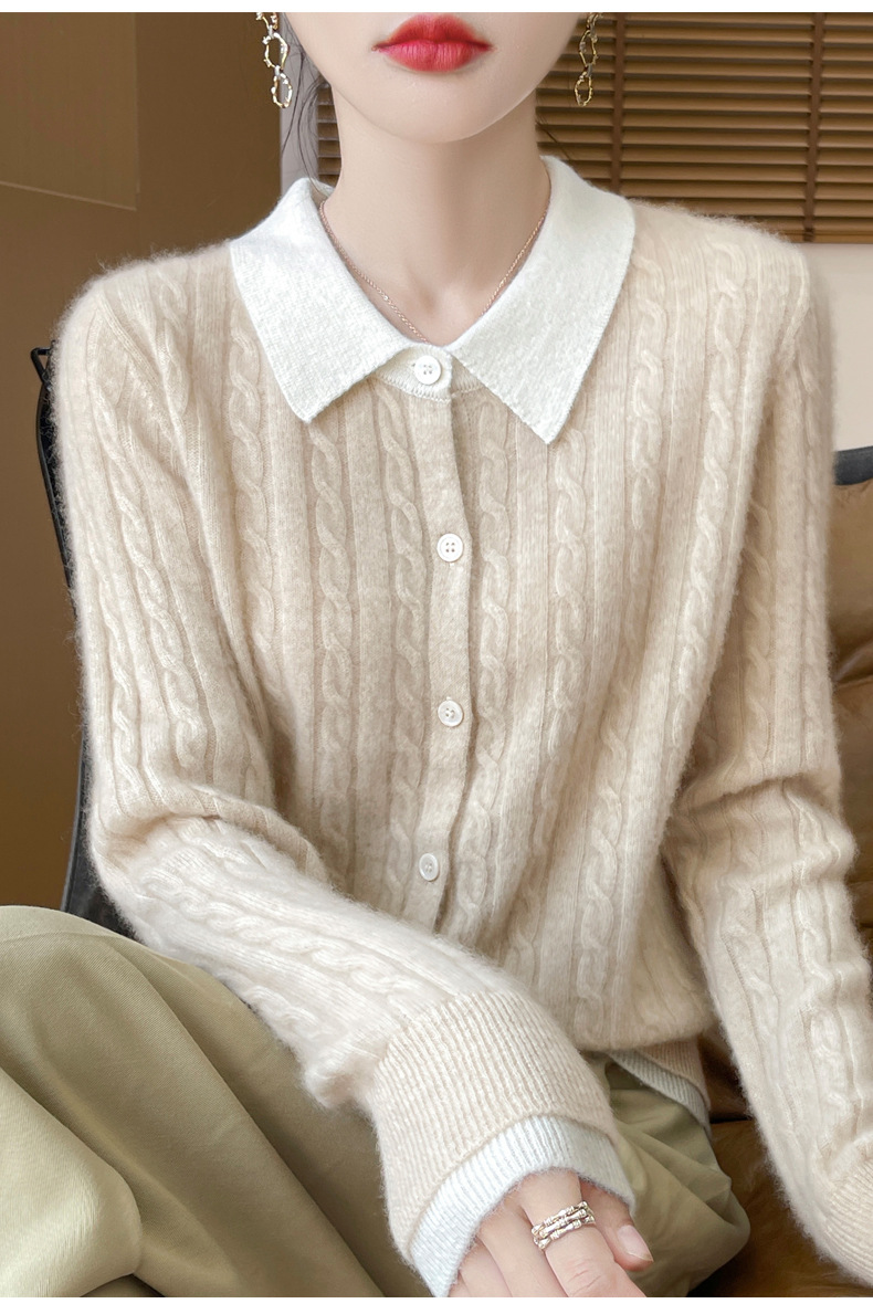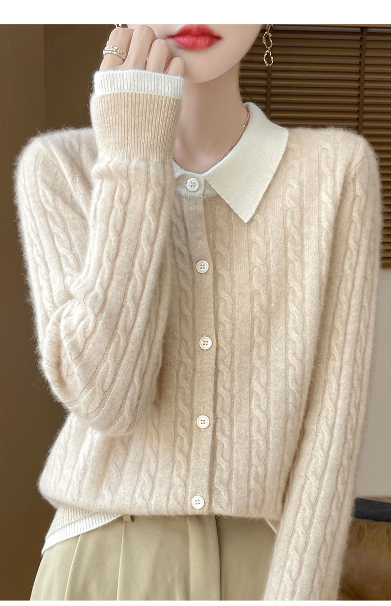 QHJY-J1127秋冬100安迪绒翻领假两件绞花拼接针织开衫上衣外套