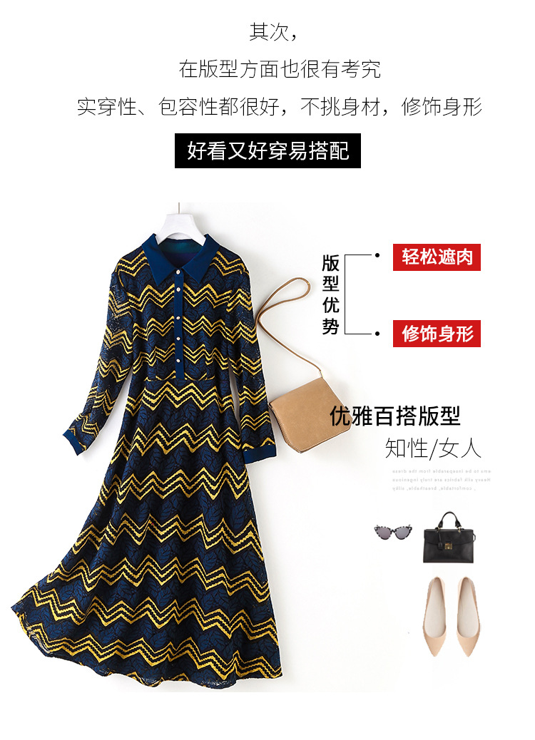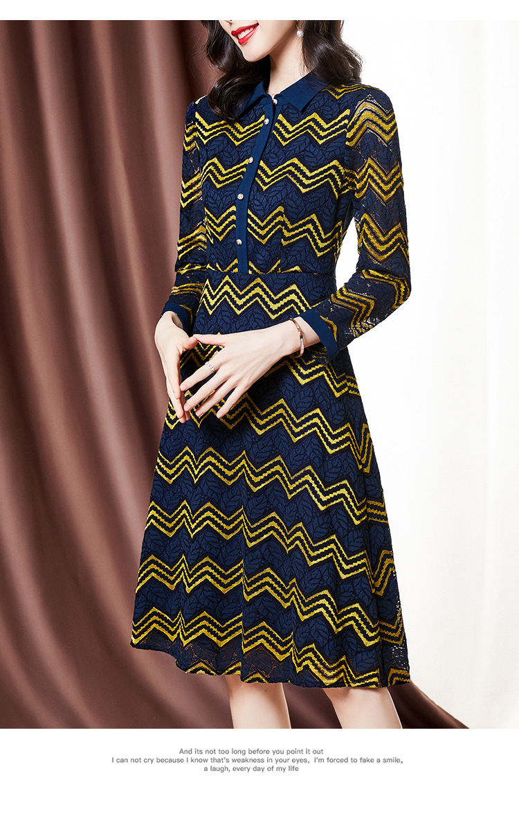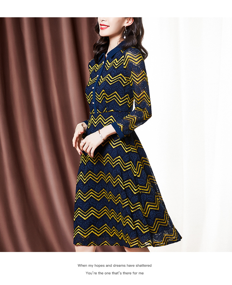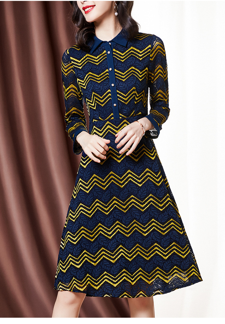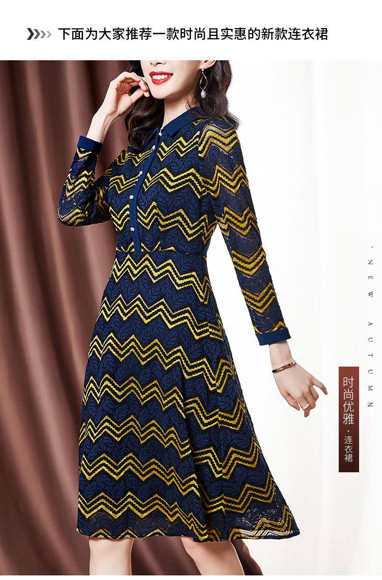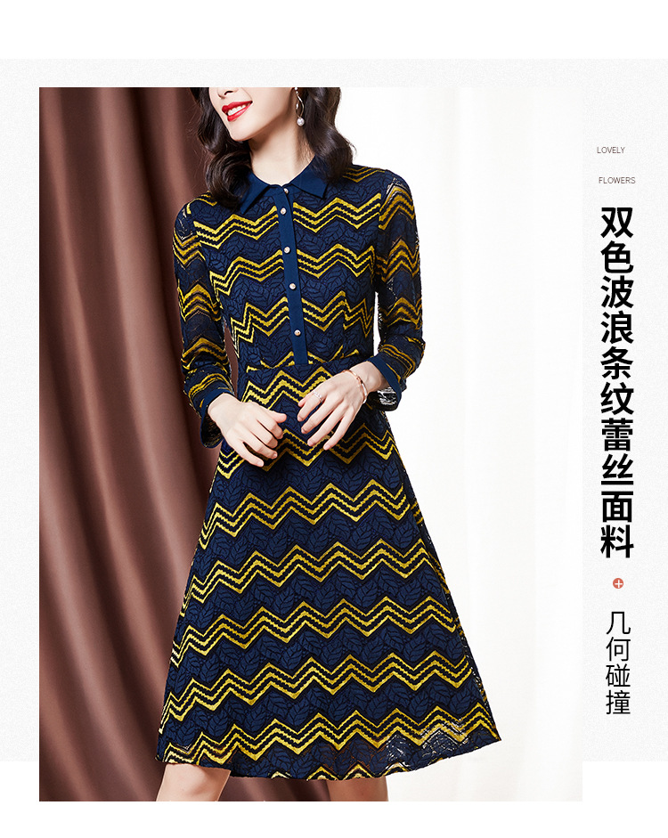 ZS-1589新款春秋季双色波浪条纹长袖连衣裙女休闲翻领中长款条纹裙子