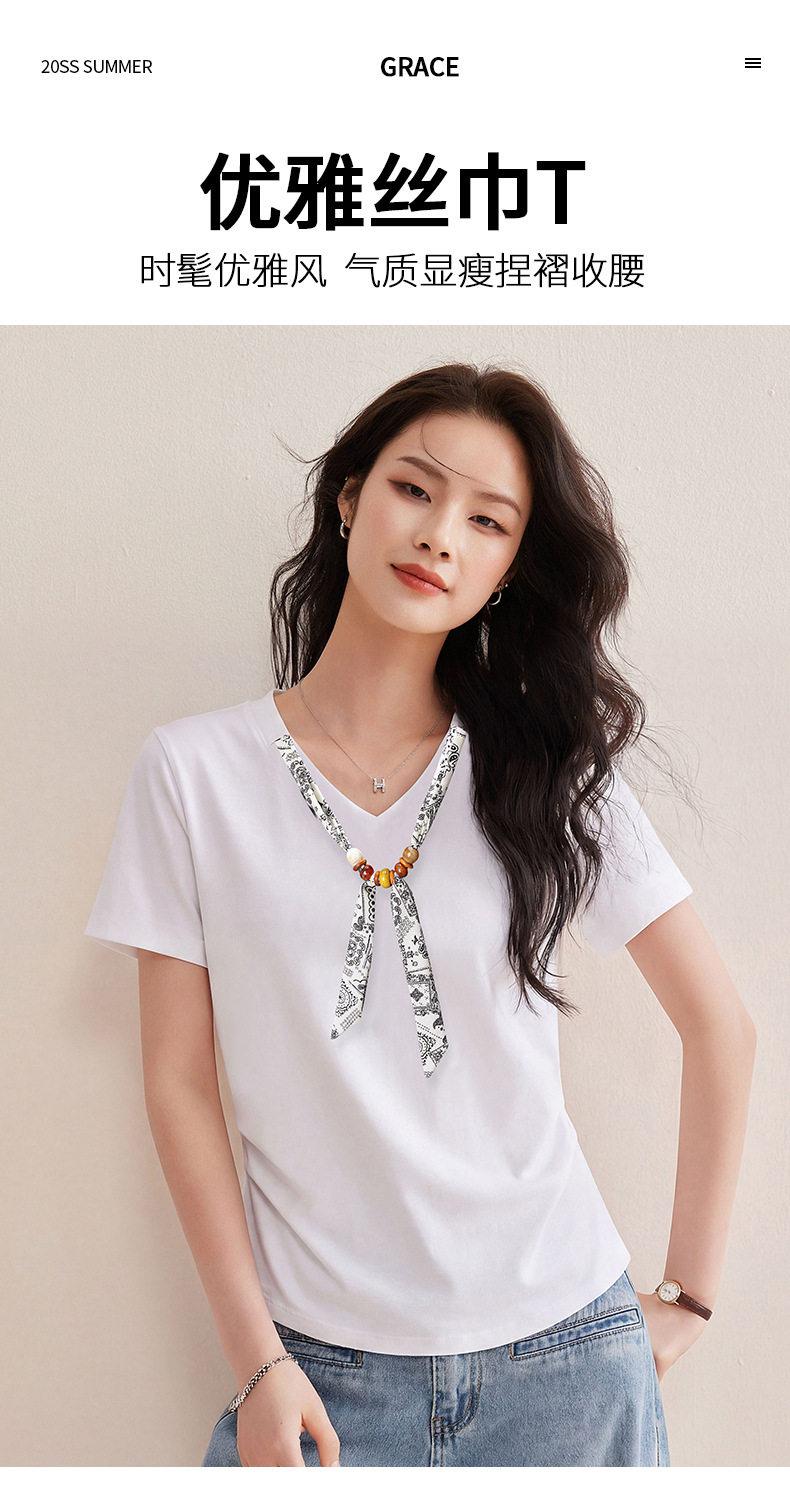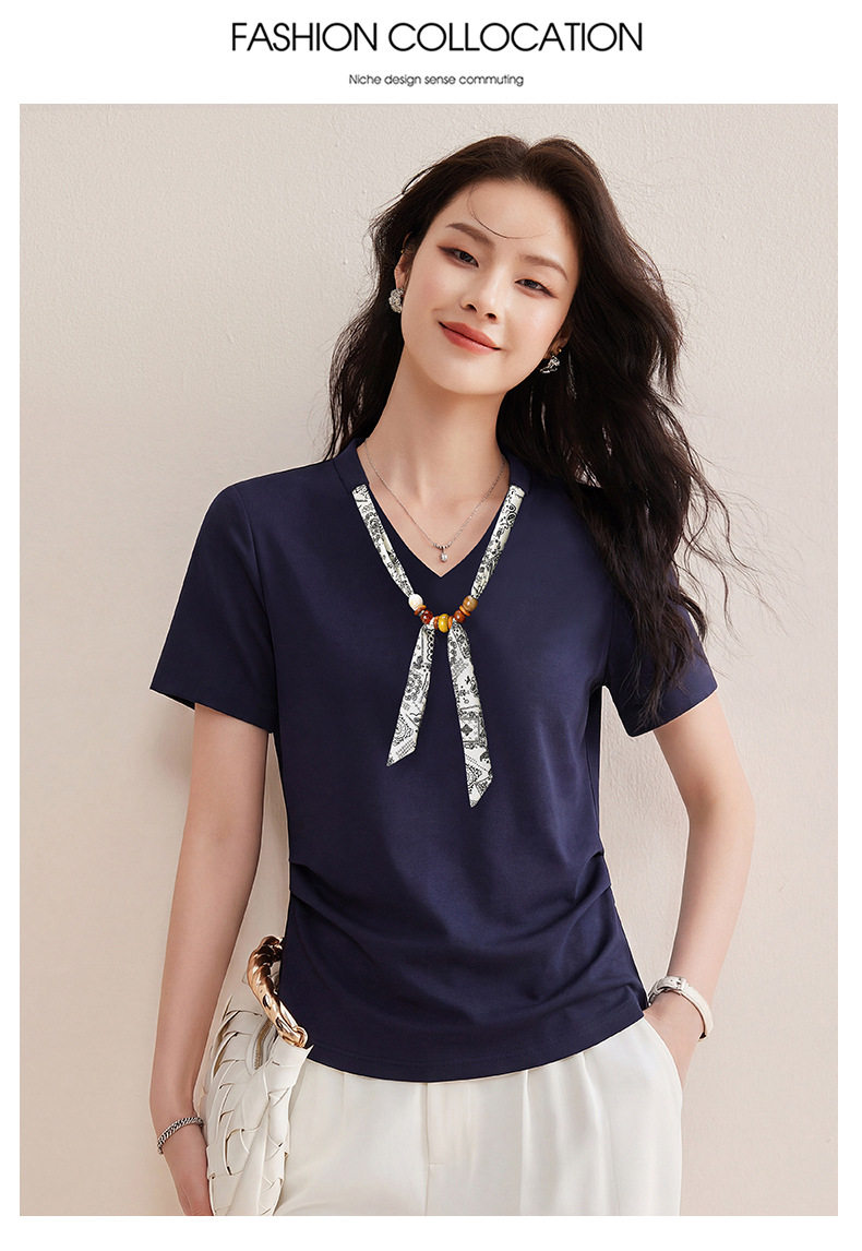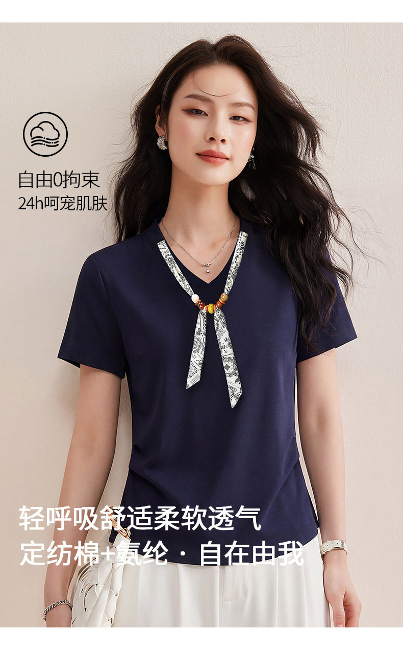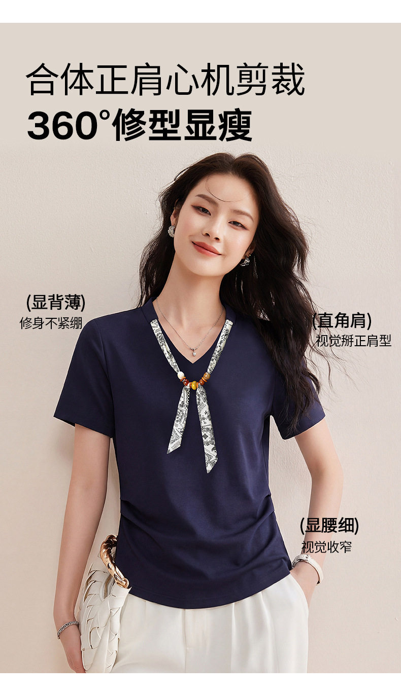 「自」全新升级【铂金会员128/天猫169/差价41】(02333)洛诗琳气质V领丝巾短袖上衣女2026夏季新款扭褶收腰显瘦T恤