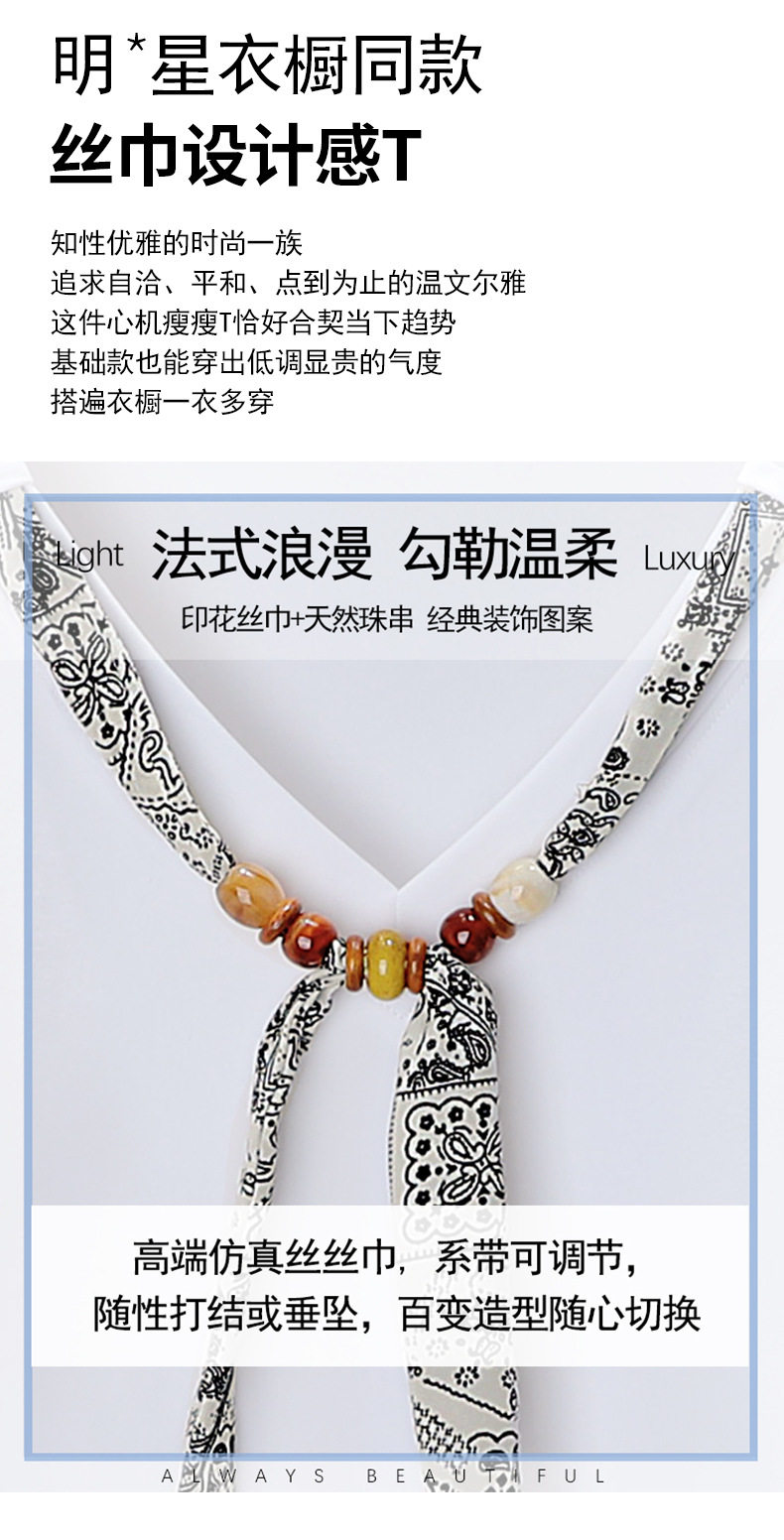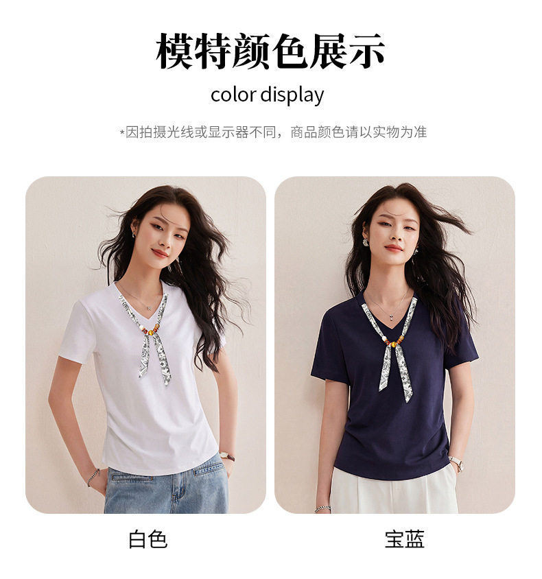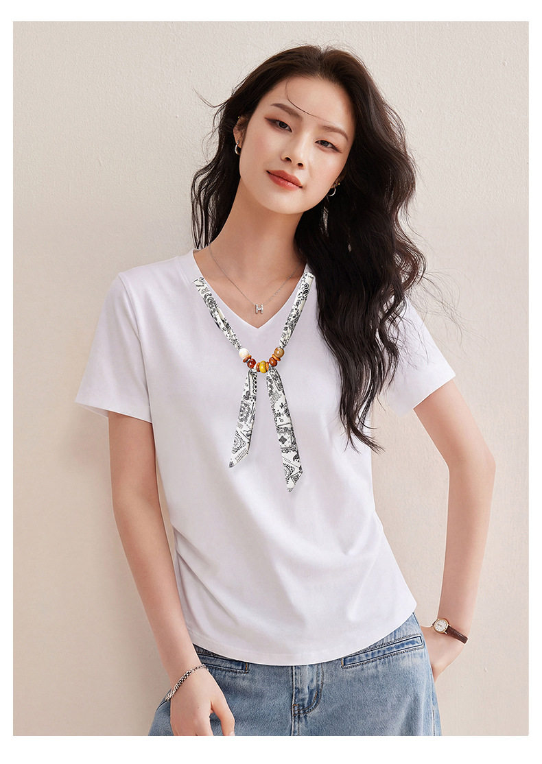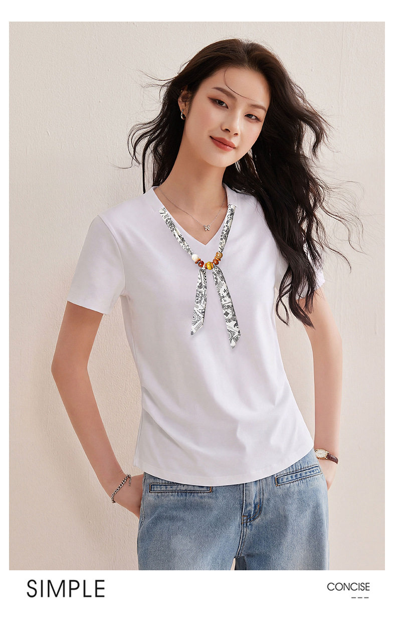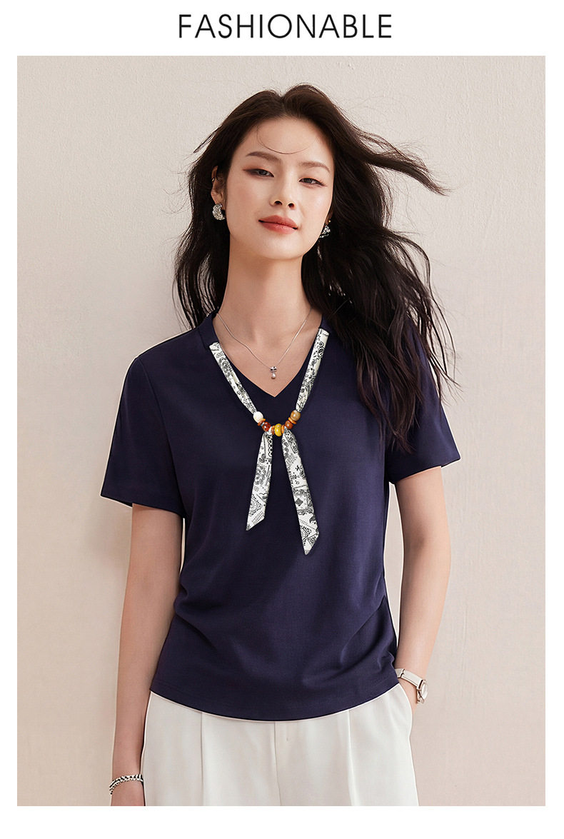 「自」全新升级【铂金会员128/天猫169/差价41】(02333)洛诗琳气质V领丝巾短袖上衣女2026夏季新款扭褶收腰显瘦T恤