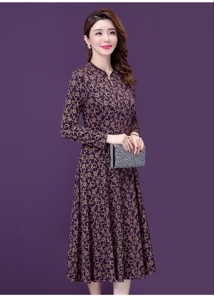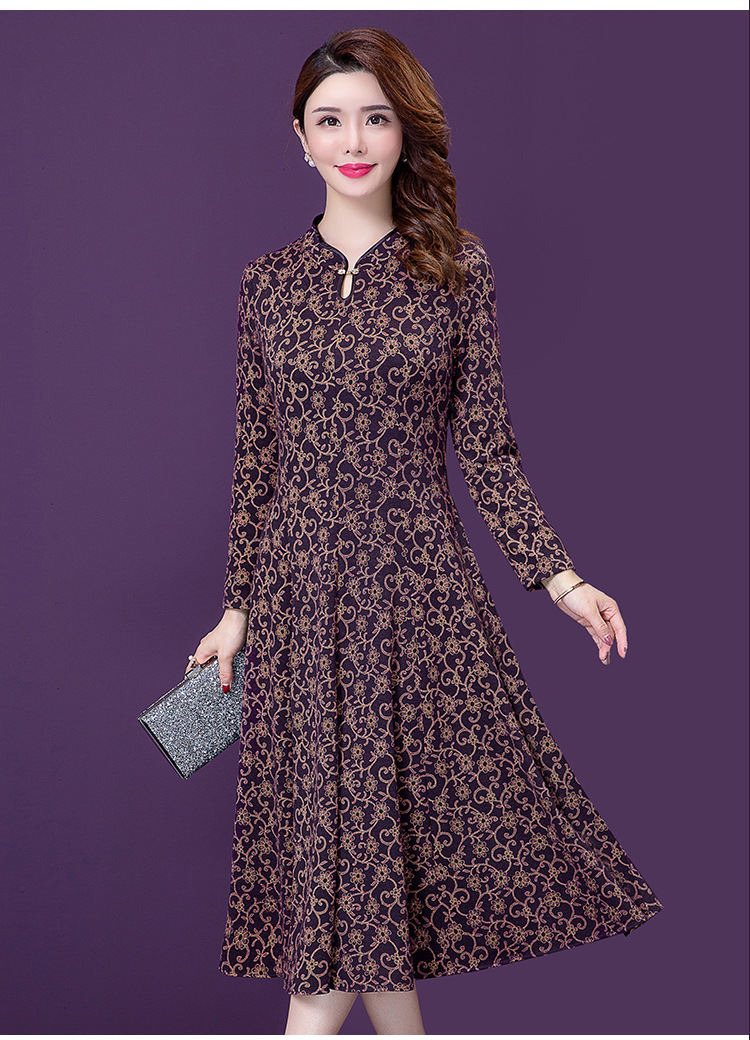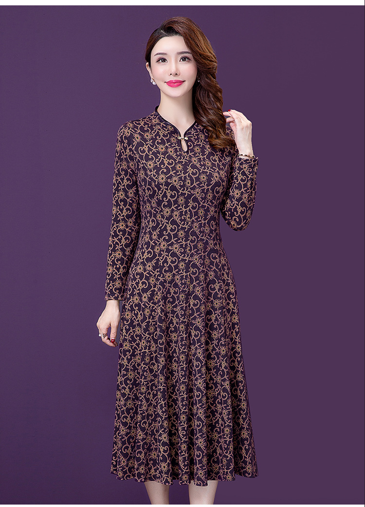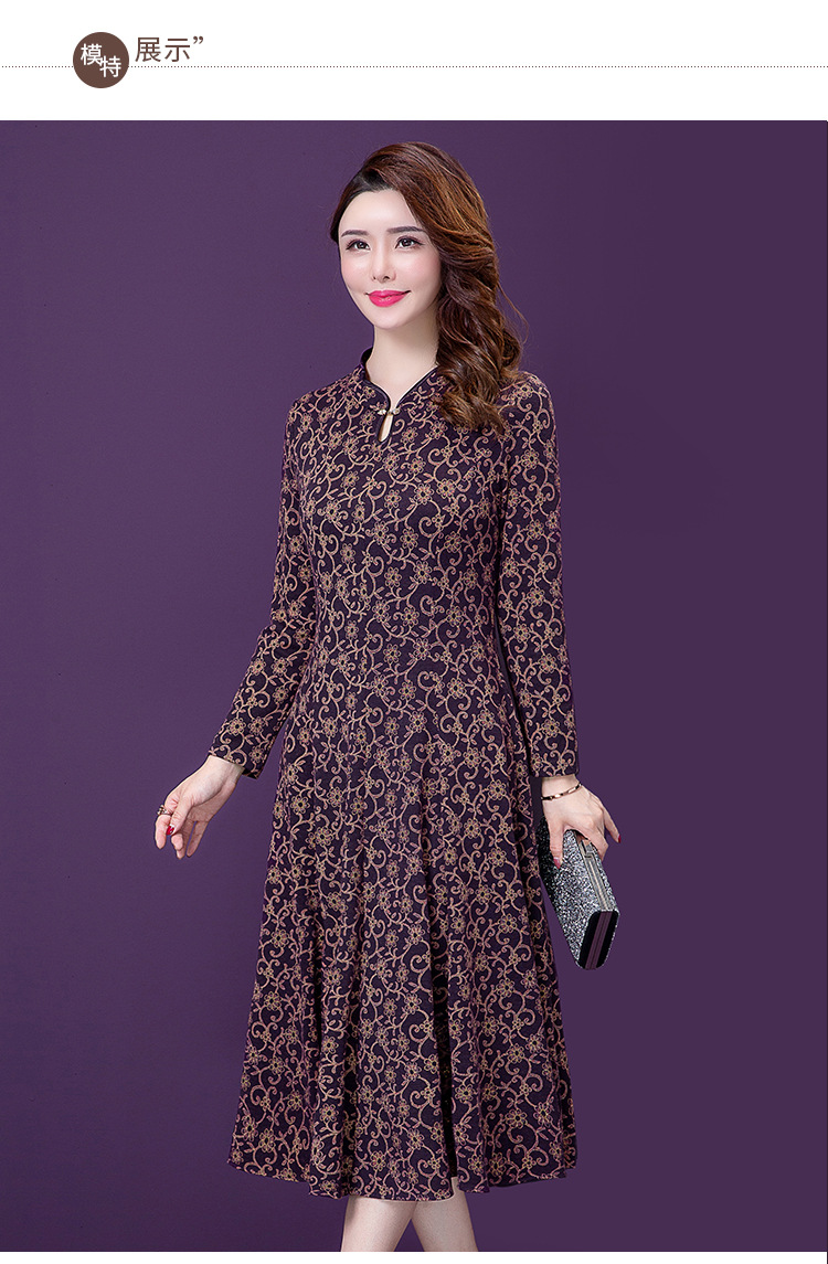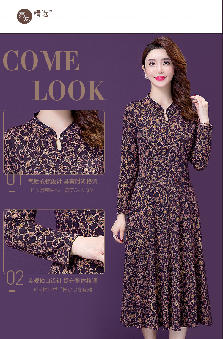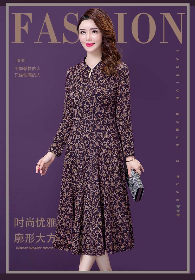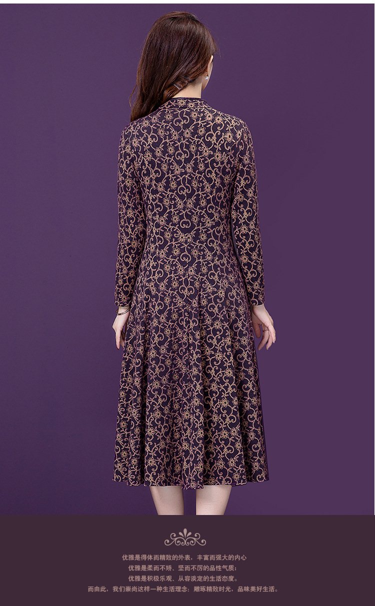 YM-8295新款复古气质妈妈中年显瘦收腰印花长袖连衣裙