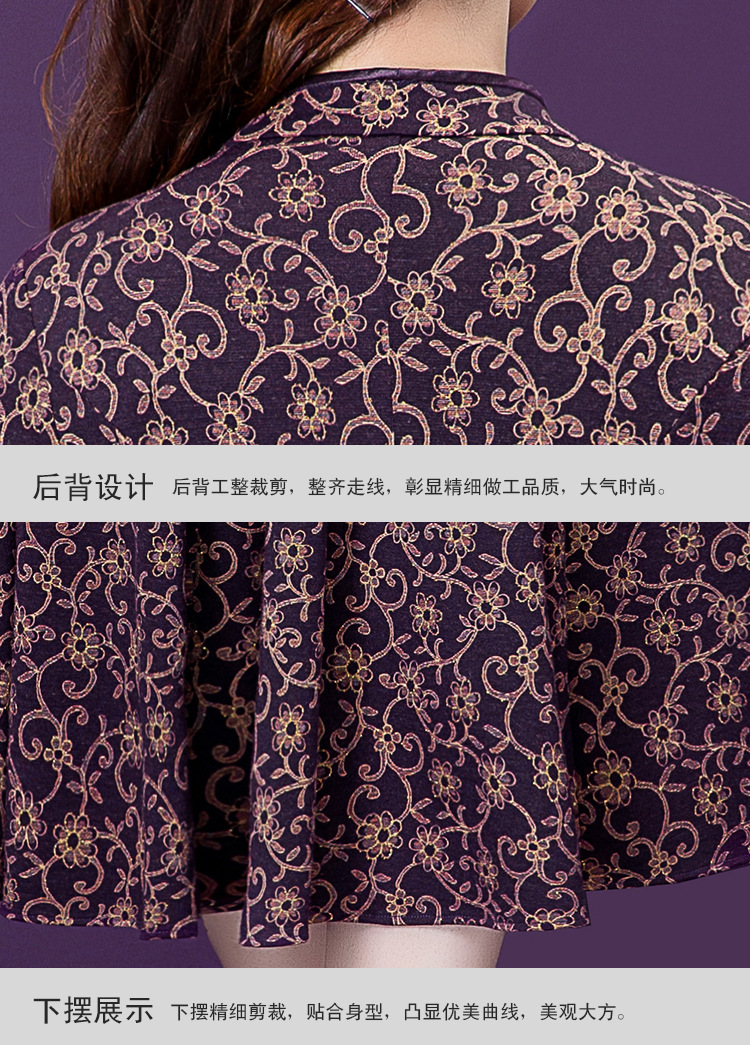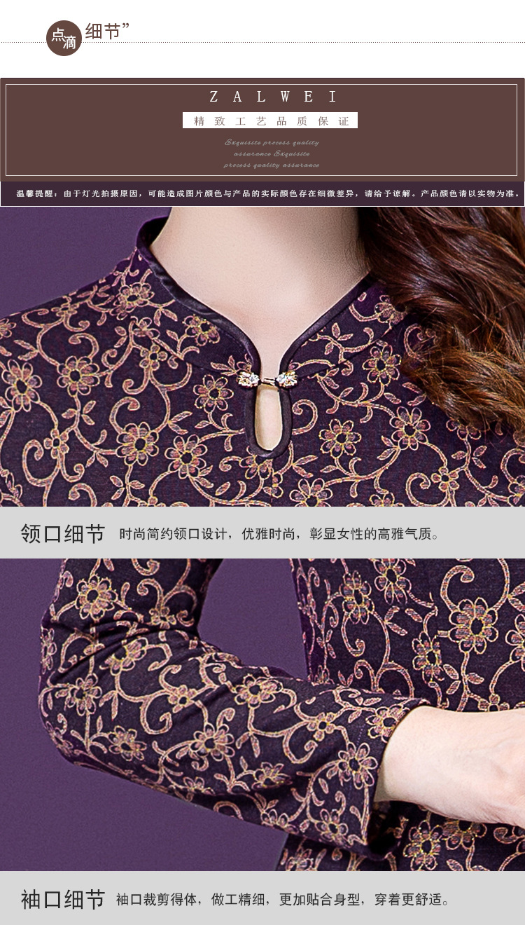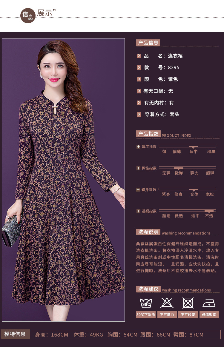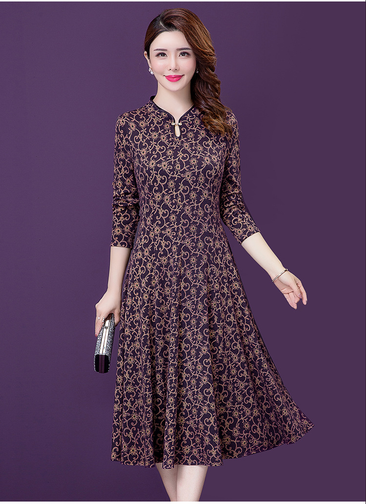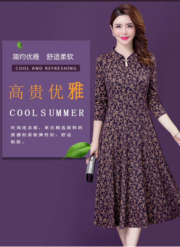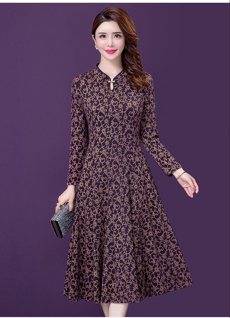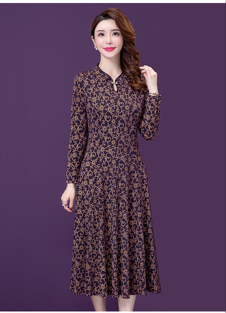 YM-8295新款复古气质妈妈中年显瘦收腰印花长袖连衣裙