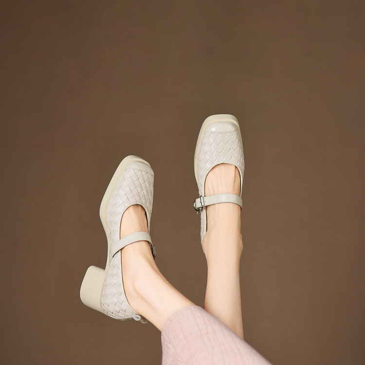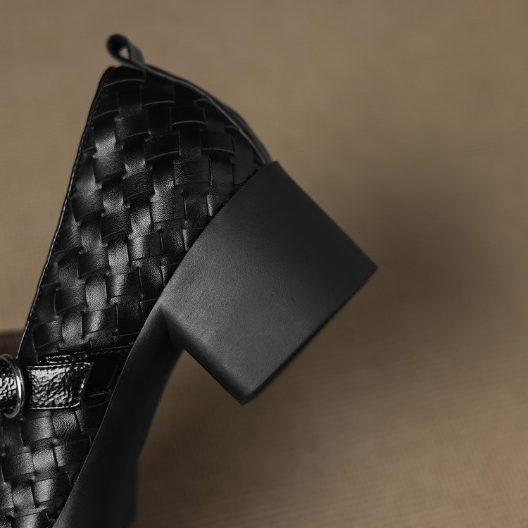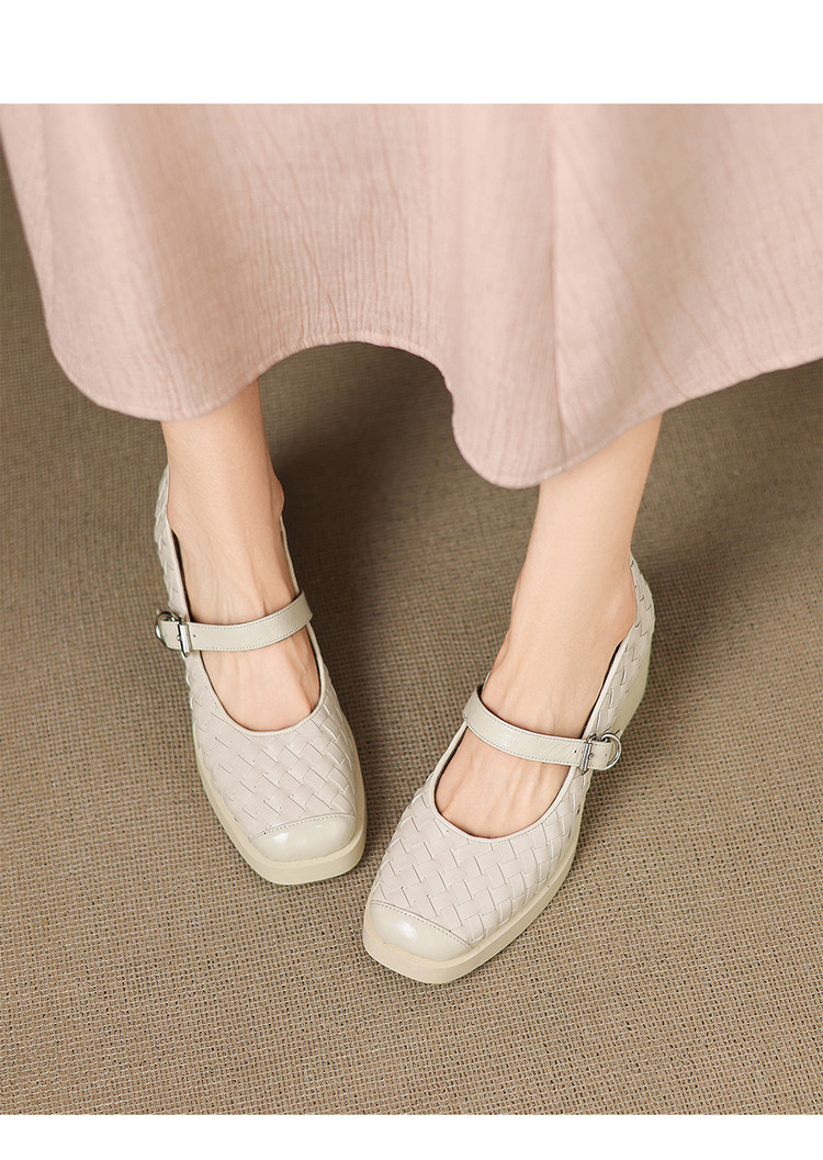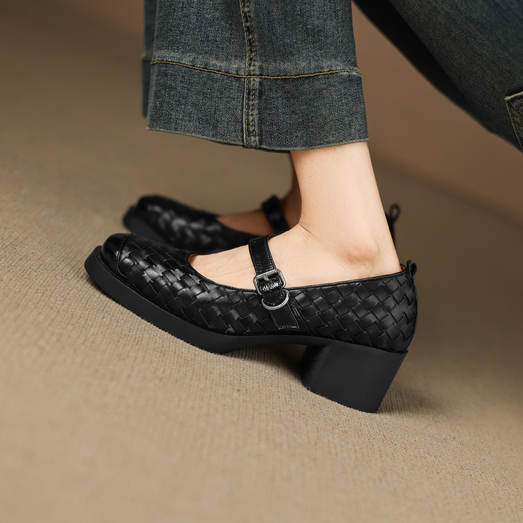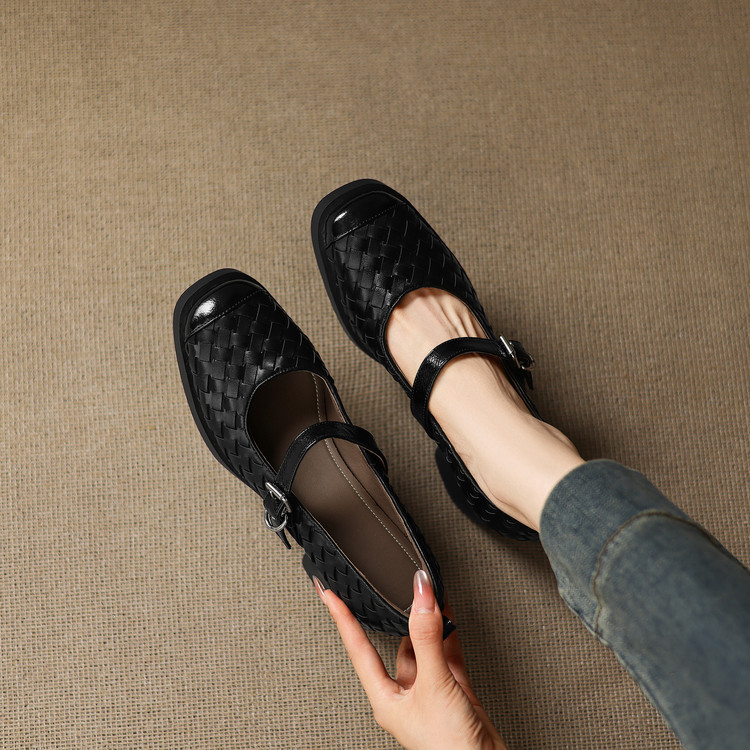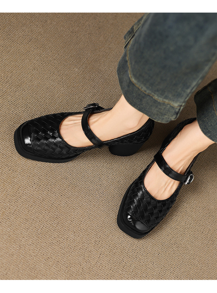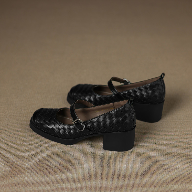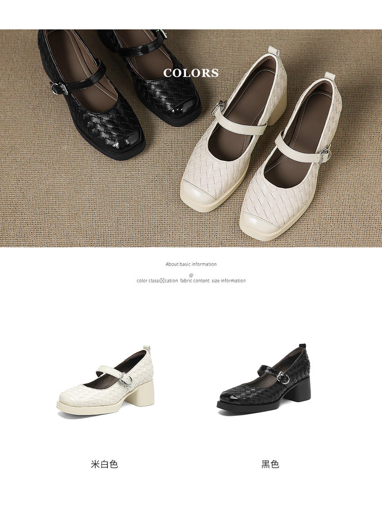 【预售5天】舒适厚底编织小皮鞋女新款真皮方头浅口单鞋粗跟高跟玛丽珍鞋ZYY&A1321