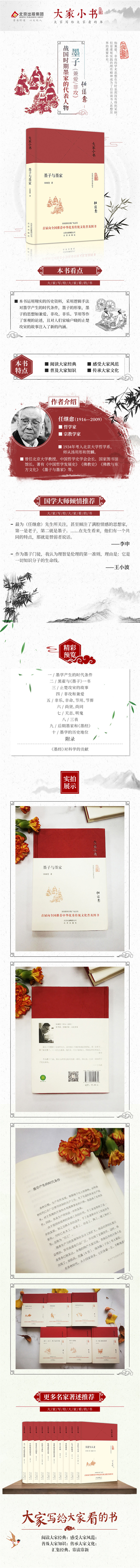 任继愈所著的《大家小书·墨子与墨家》是大家写给大家看的书。其中收录有关文学、历史、哲学、艺术等各个文科领域的作品,既是名家大家的作品,举重若轻,深入浅出,整齐地展示学术成果;又是大家民众的读物,可以开阔读者眼界,一窥学术堂奥。而一册小书,凝聚着人类的智慧,浓缩了学者毕生的心血和才华。