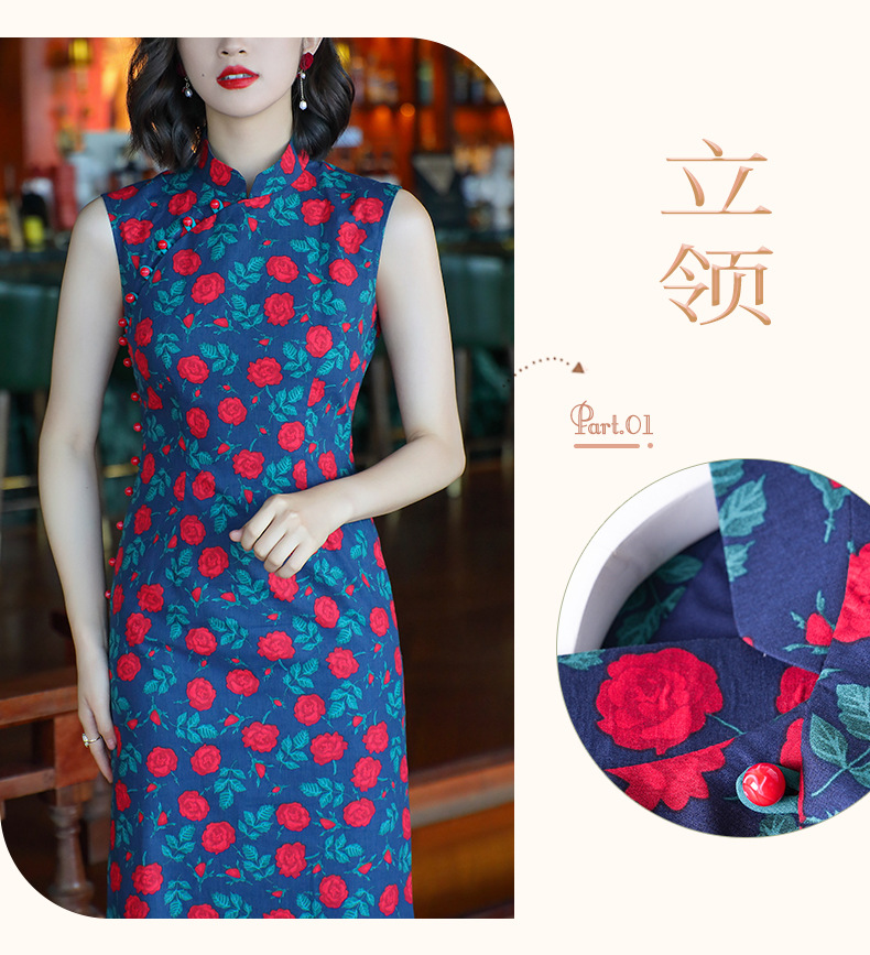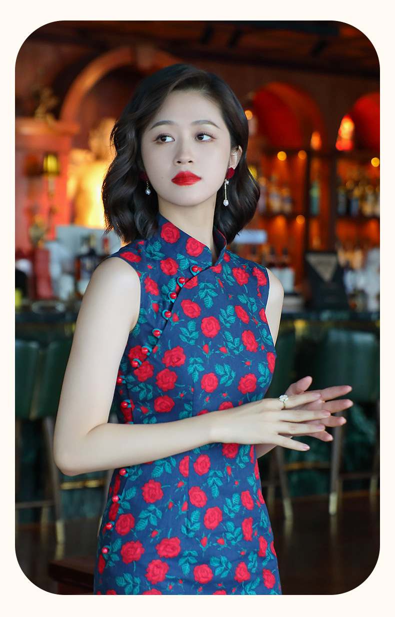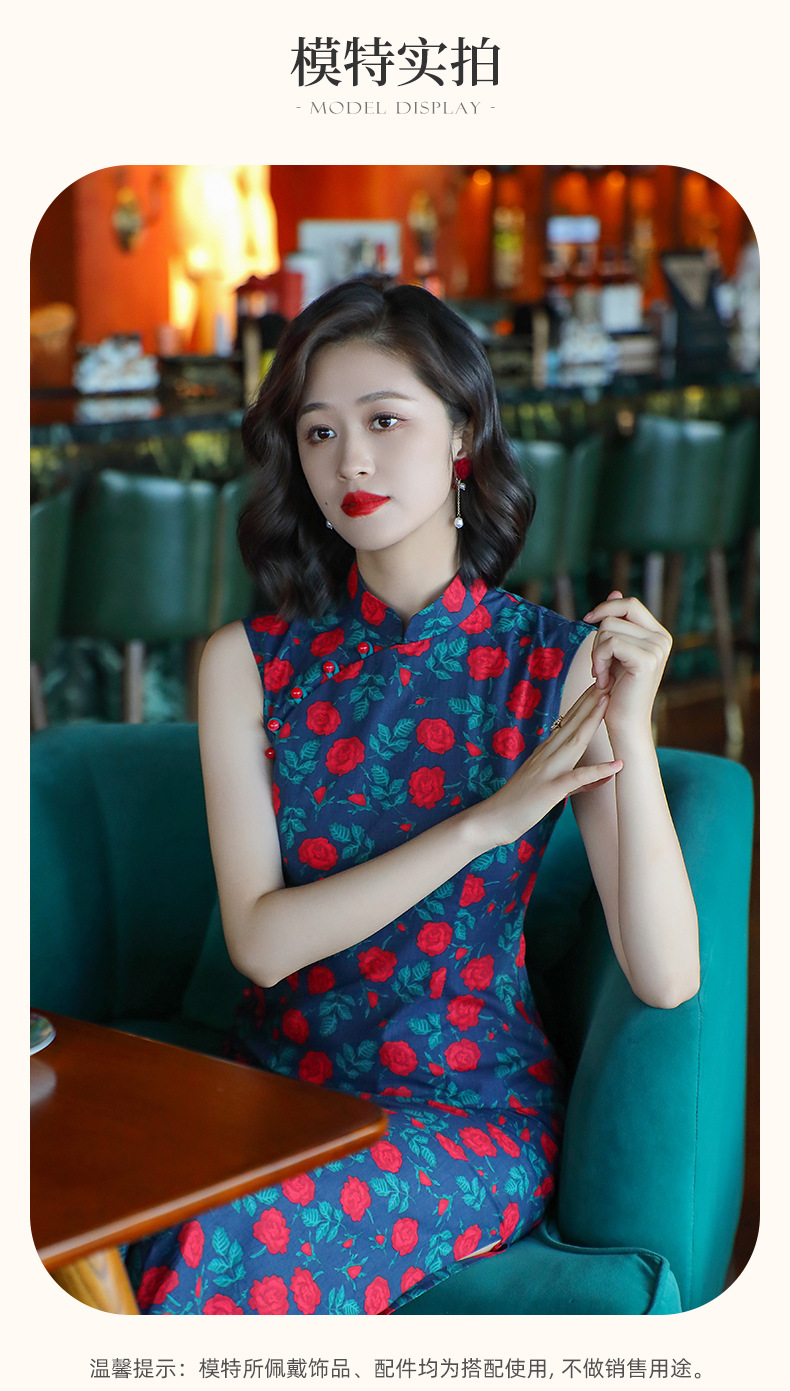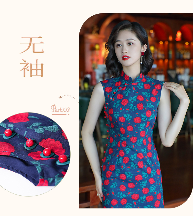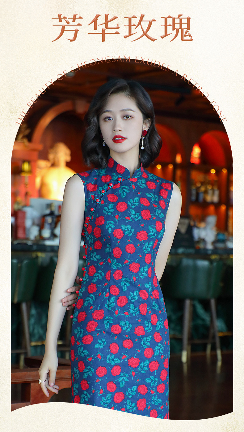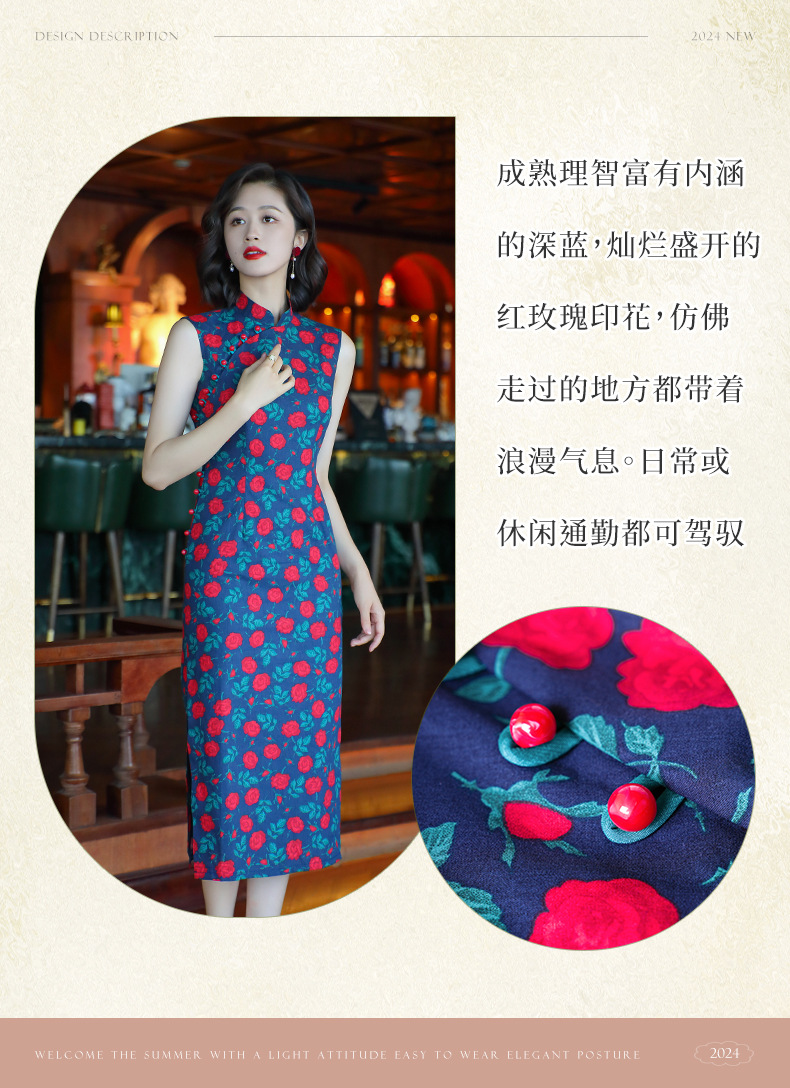 OY-24260中国风气质旗袍夏季2024年新款纯棉玫瑰印花日常改良连衣裙24260