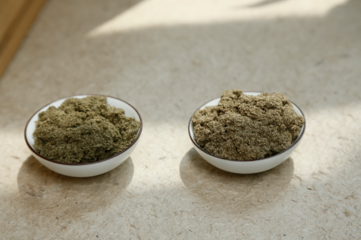 三年陈艾绒颜色如土黄色,新艾绒还是青绿的