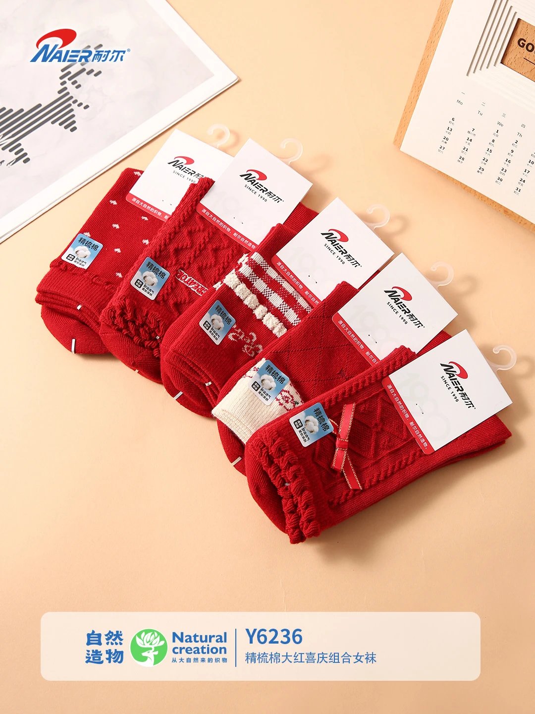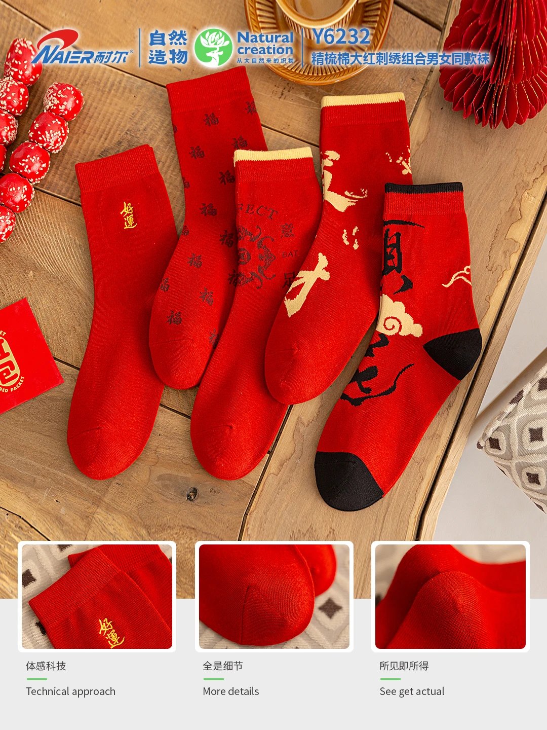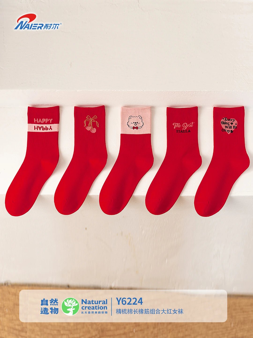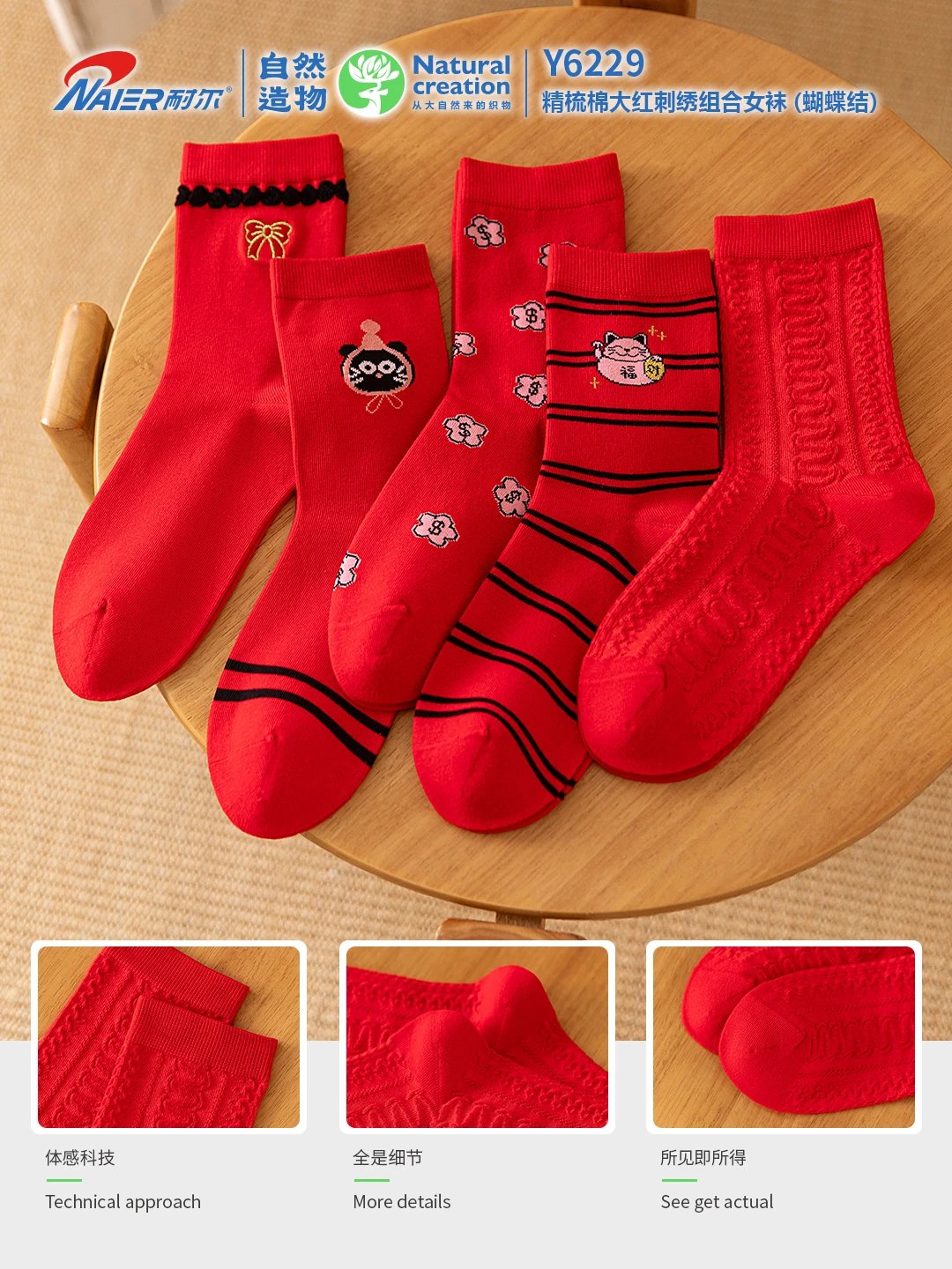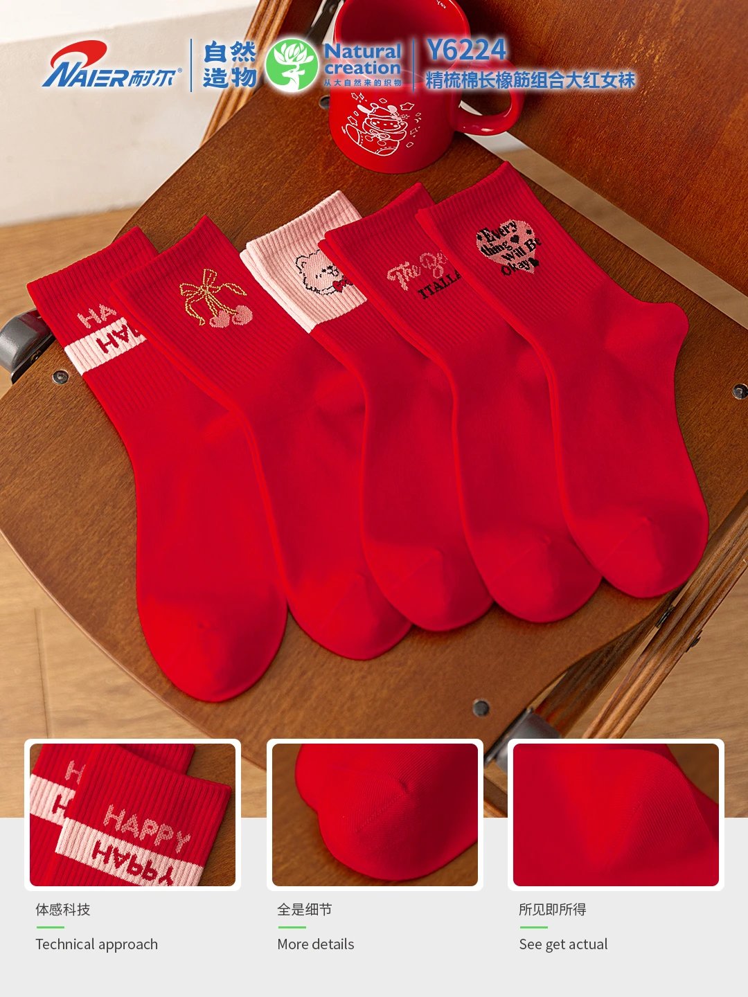 5双【新疆阳光棉 添加莱卡纤维 高弹不紧绷】耐尔精梳棉本命年鸿运袜5双装