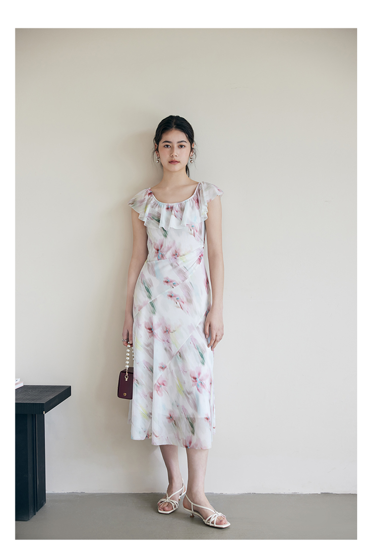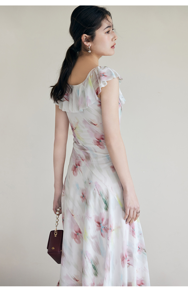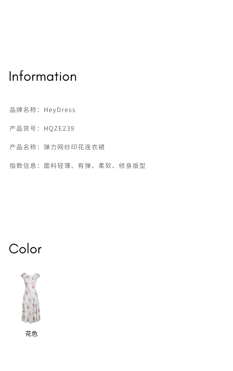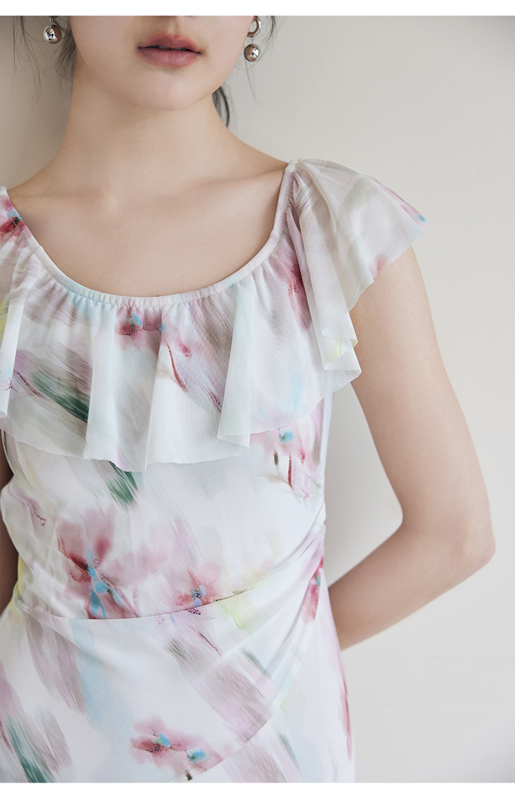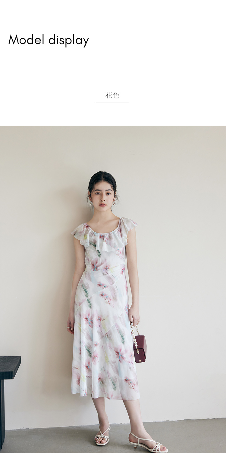 HeyDress荷叶领印花连衣裙女夏季法式U领修身弹力网纱浪漫裙子