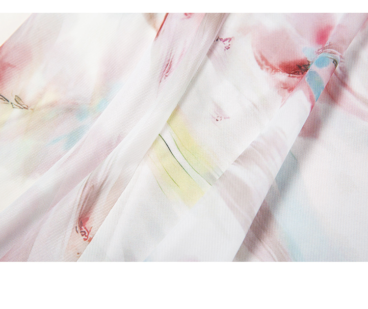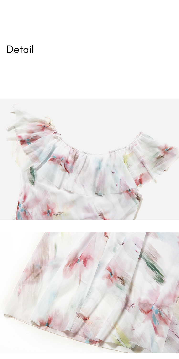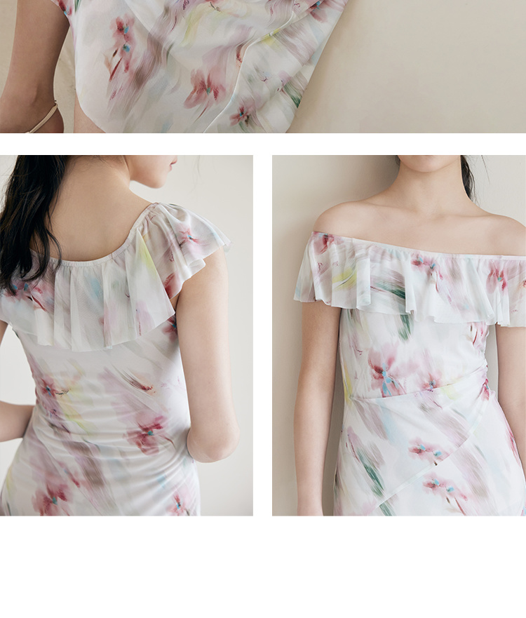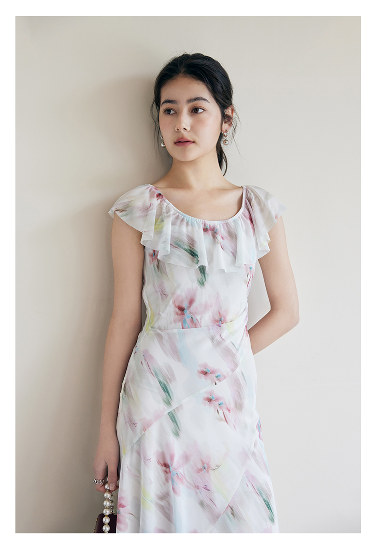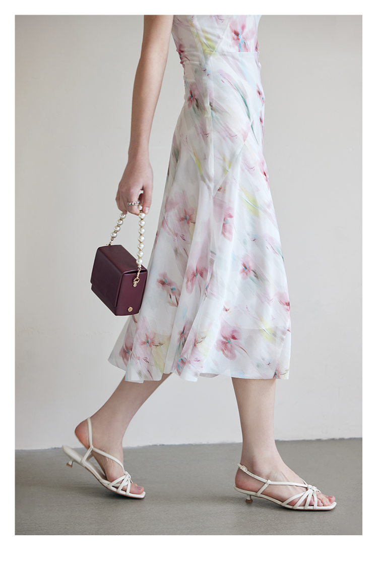 HeyDress荷叶领印花连衣裙女夏季法式U领修身弹力网纱浪漫裙子