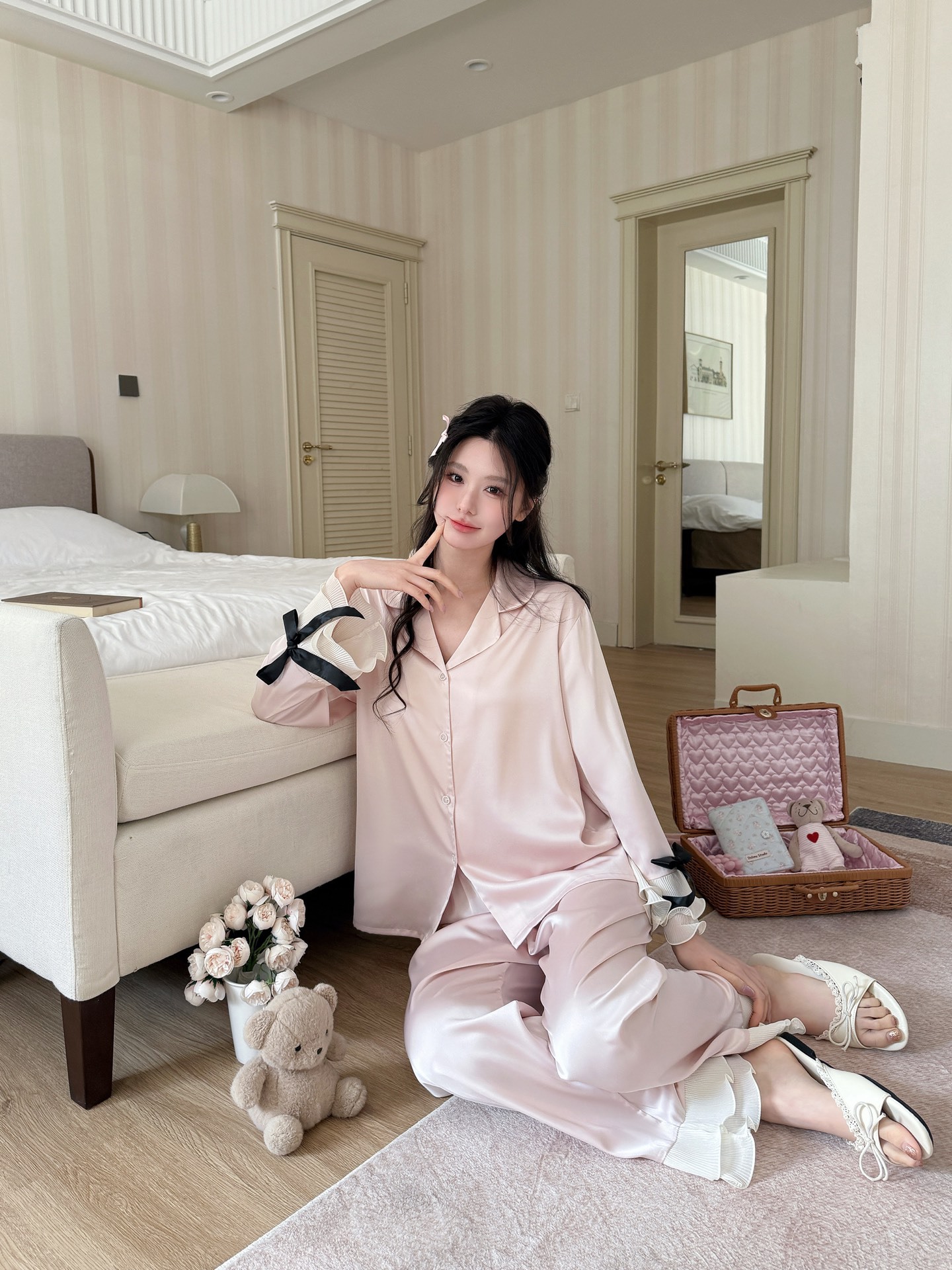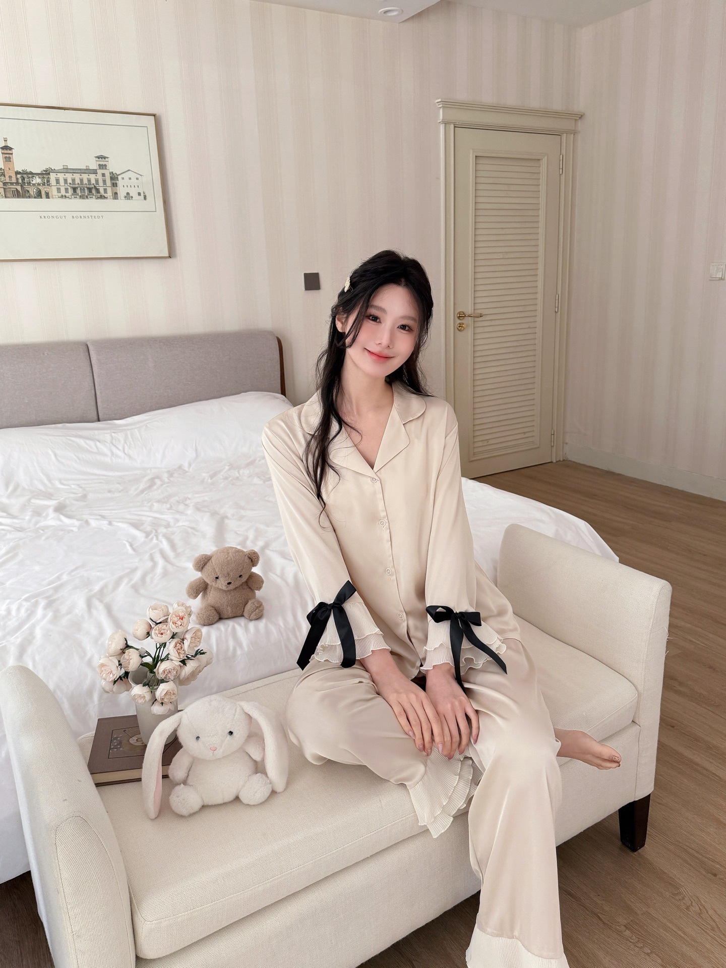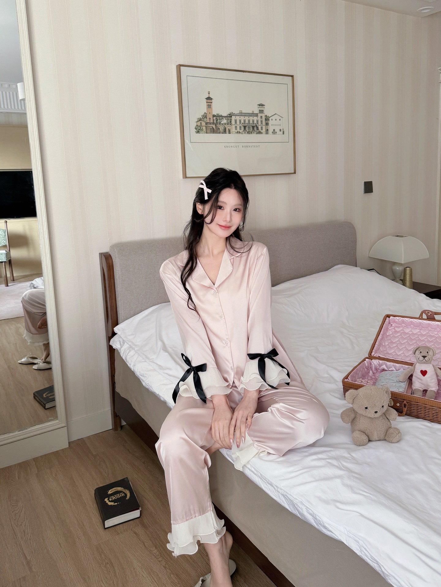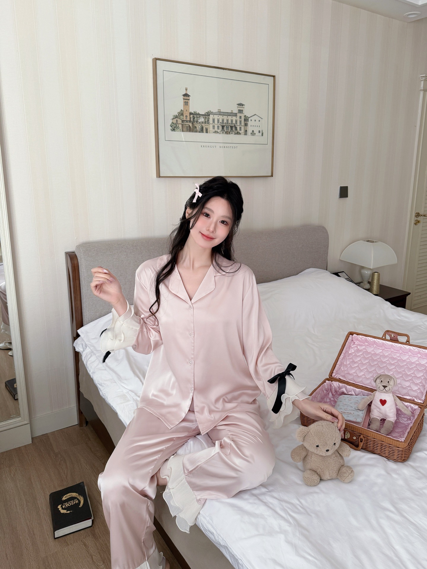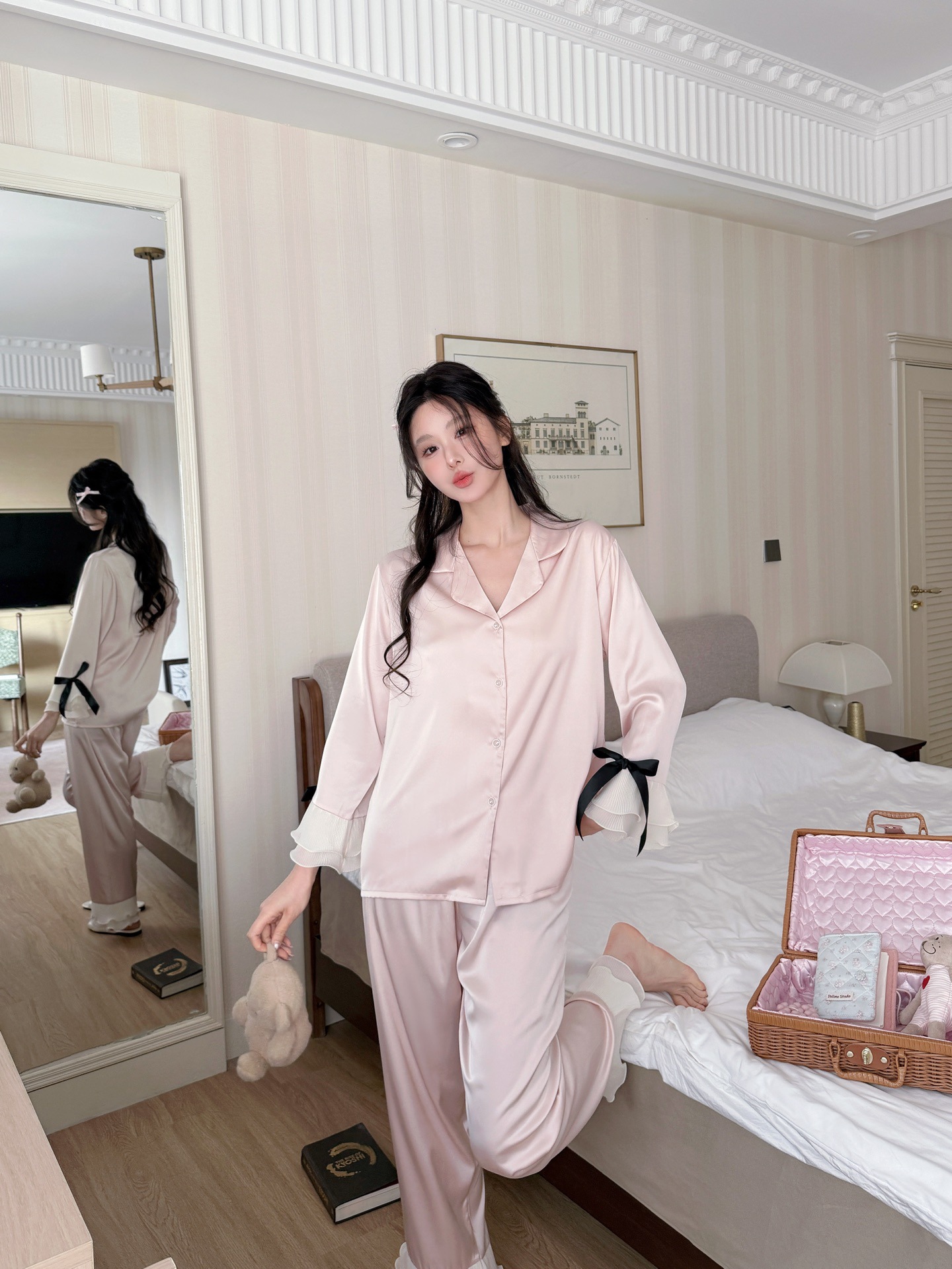 【垂顺丝滑❗️显瘦遮肉】2026冰丝睡衣套装女高级感甜美蝴蝶结袖口荷叶边长袖家居服薄。jd