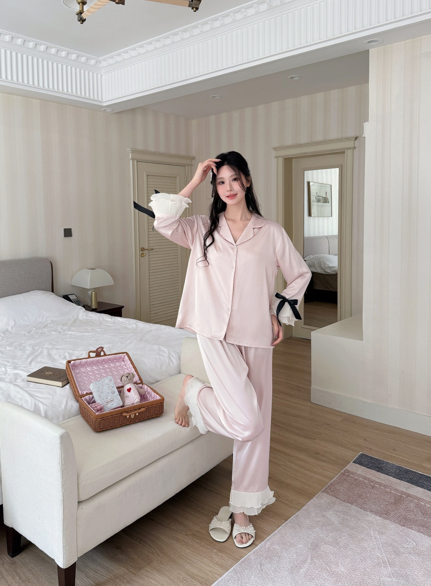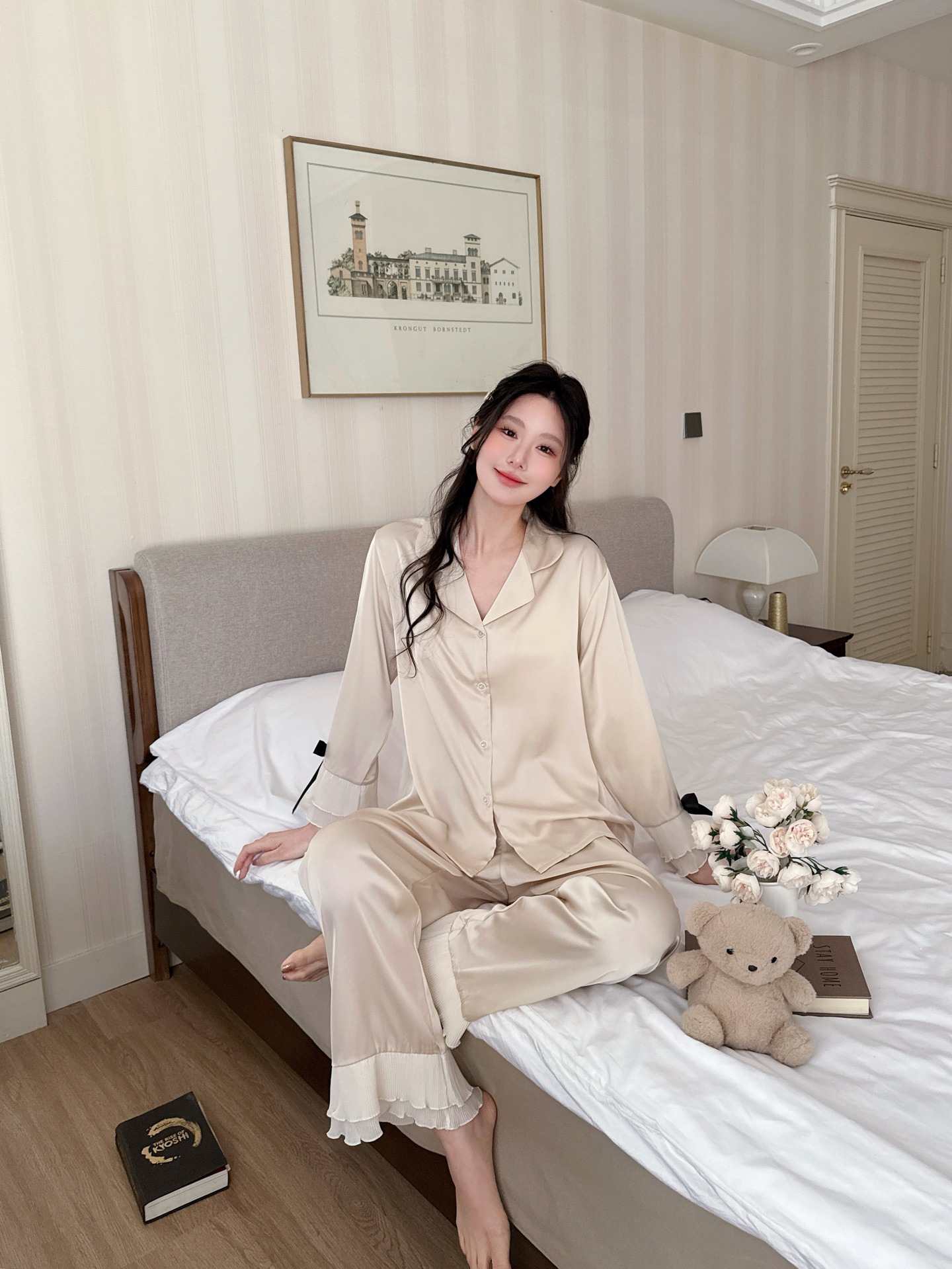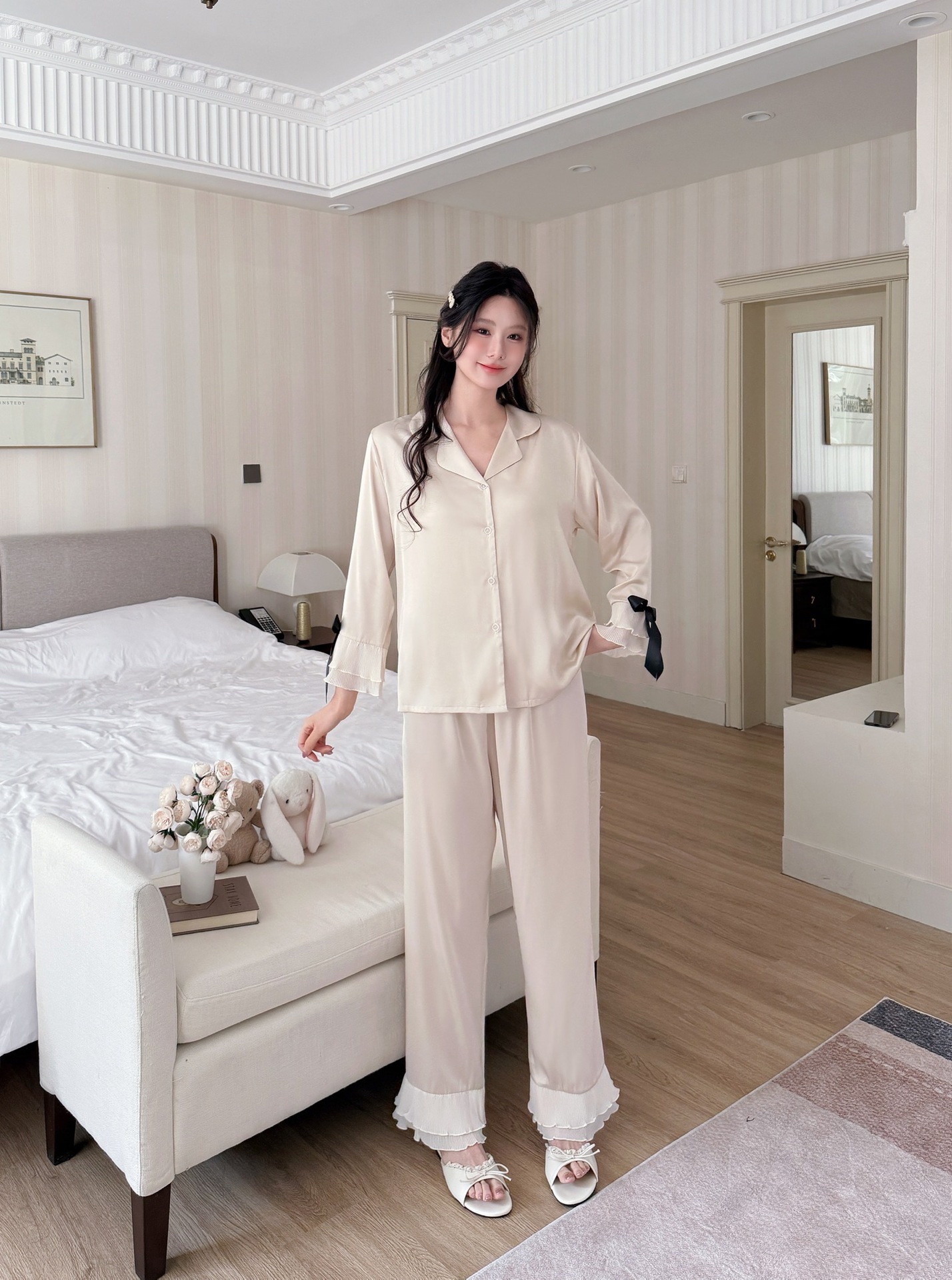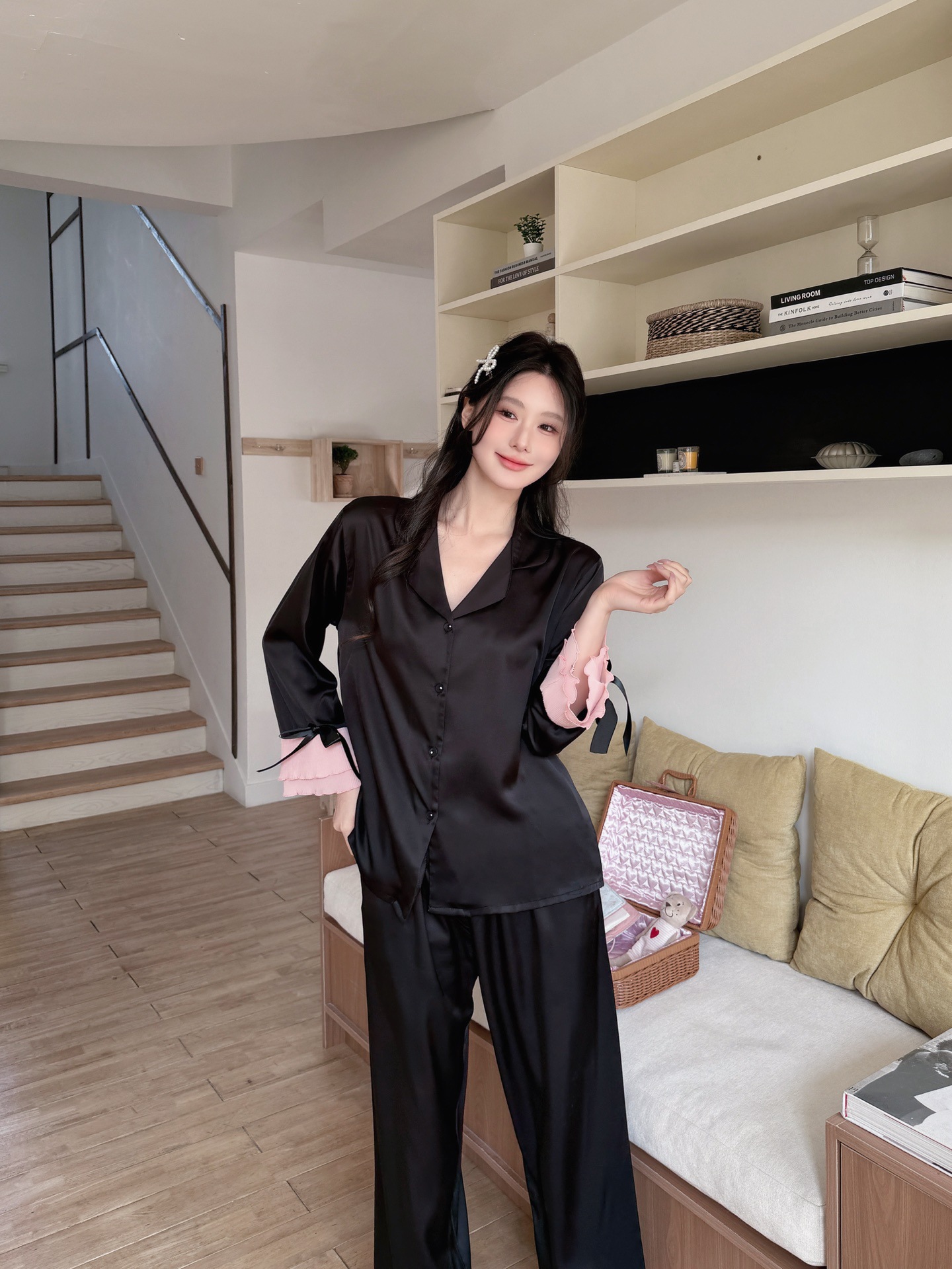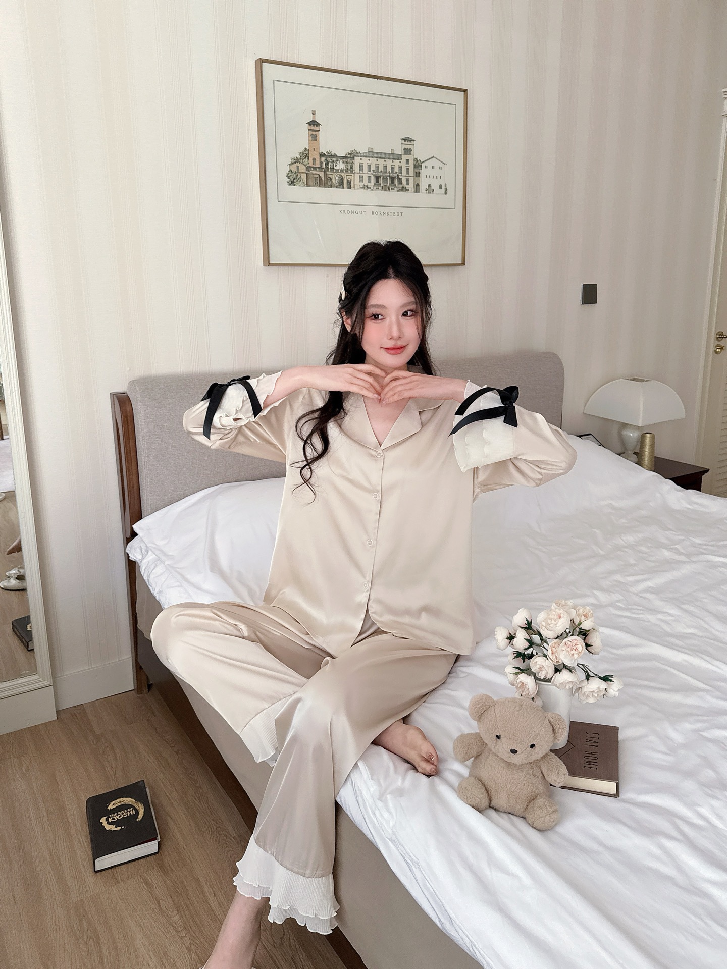 【垂顺丝滑❗️显瘦遮肉】2026冰丝睡衣套装女高级感甜美蝴蝶结袖口荷叶边长袖家居服薄。jd