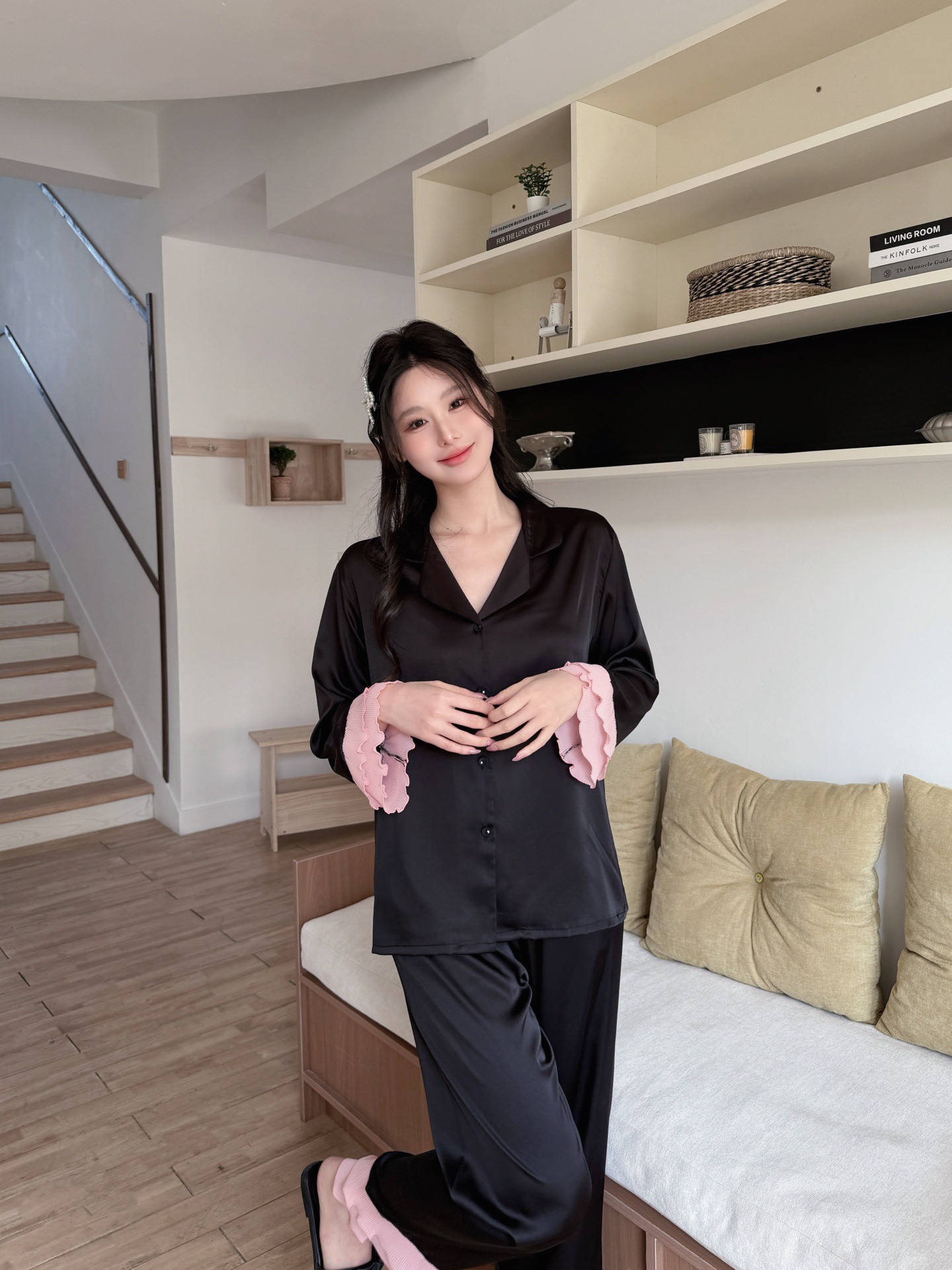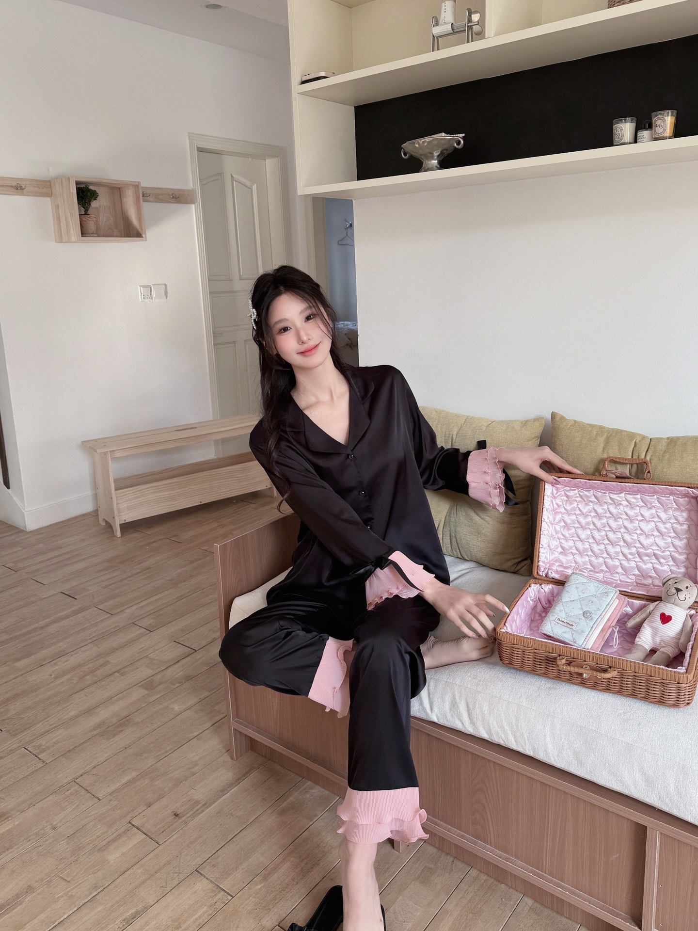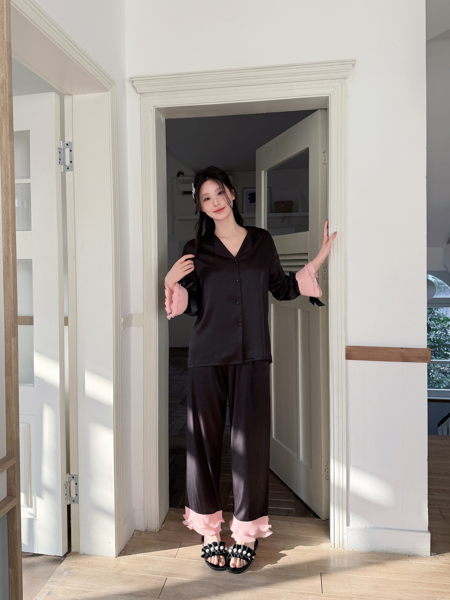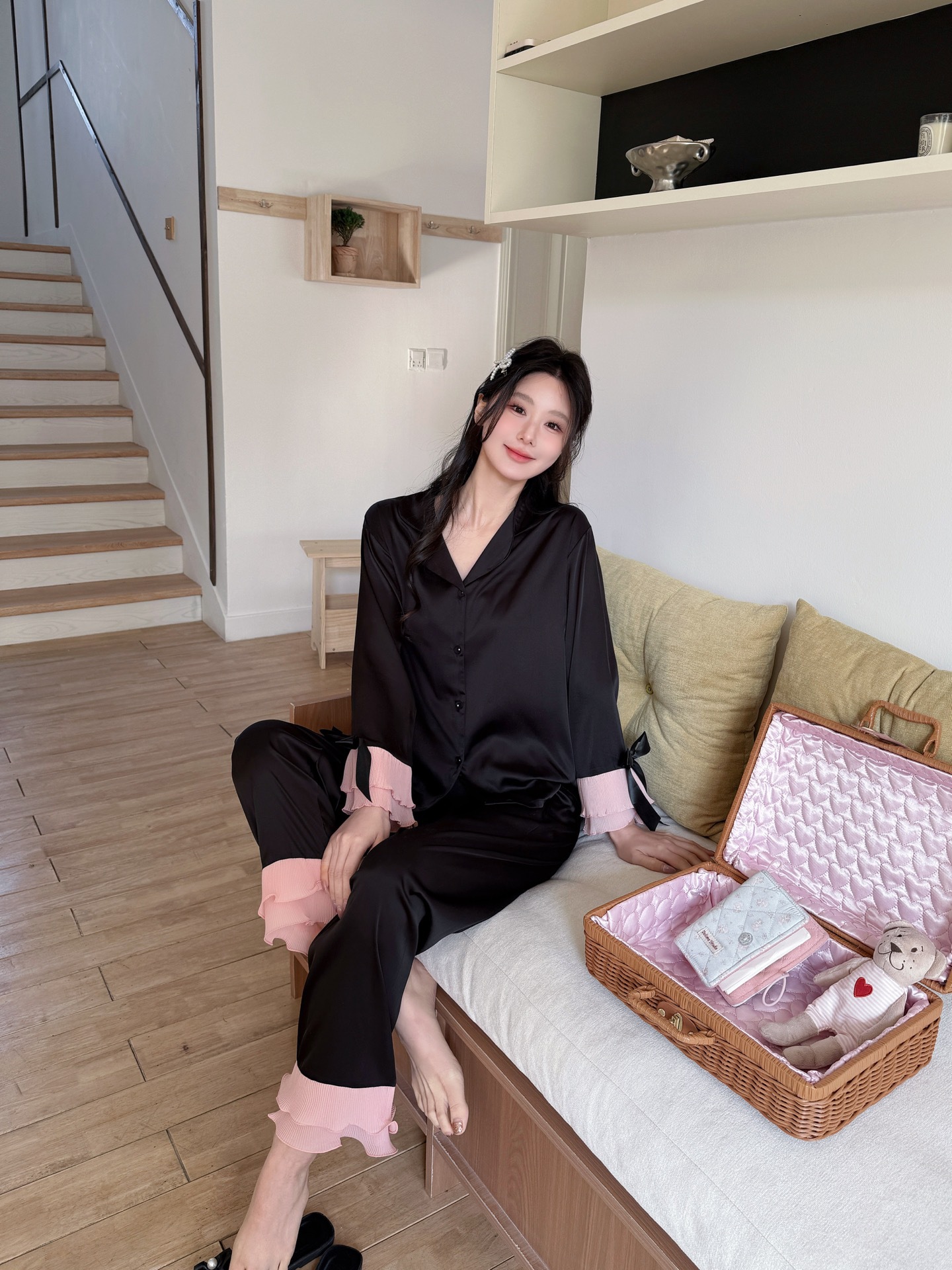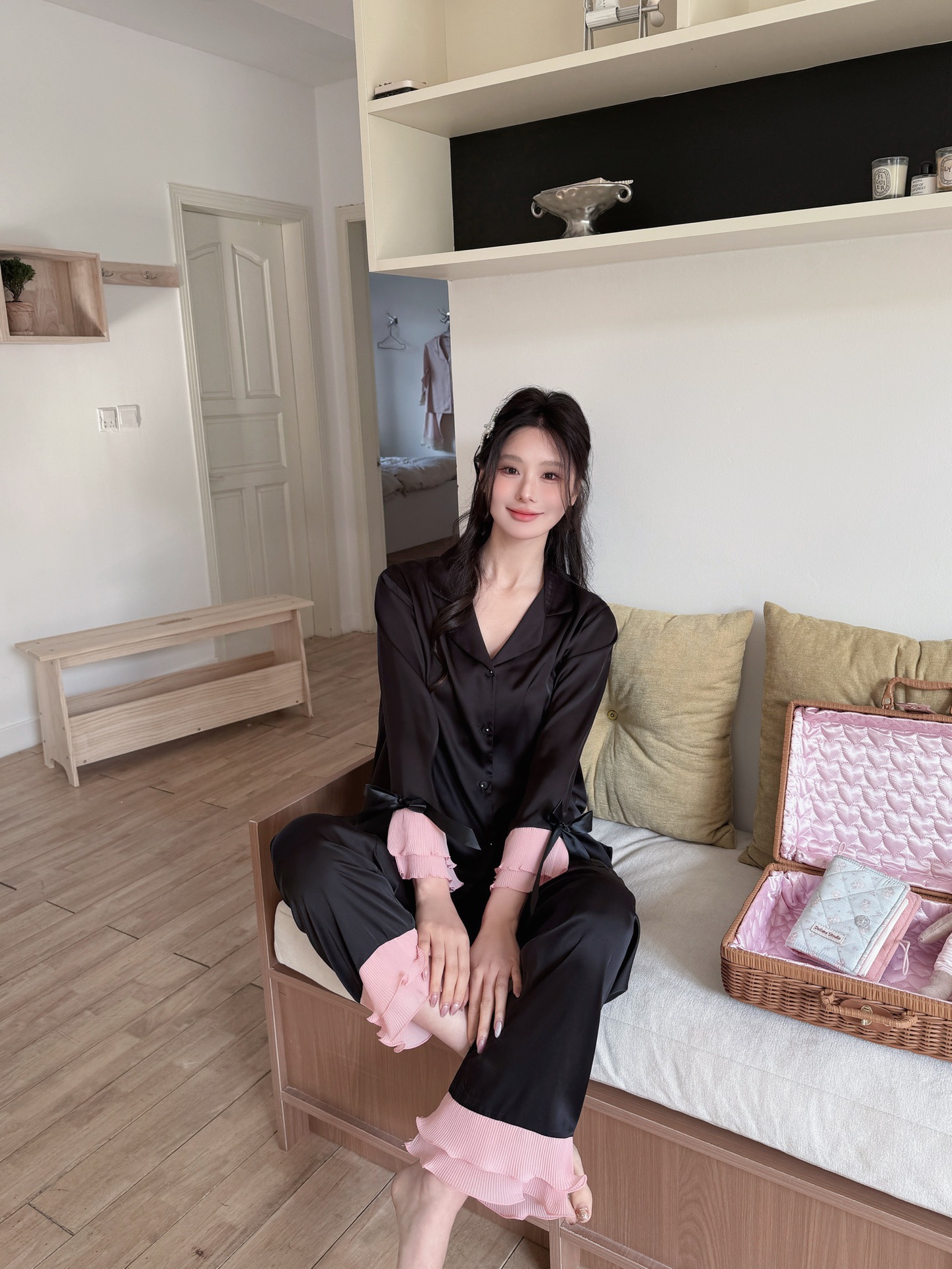 【垂顺丝滑❗️显瘦遮肉】2026冰丝睡衣套装女高级感甜美蝴蝶结袖口荷叶边长袖家居服薄。jd