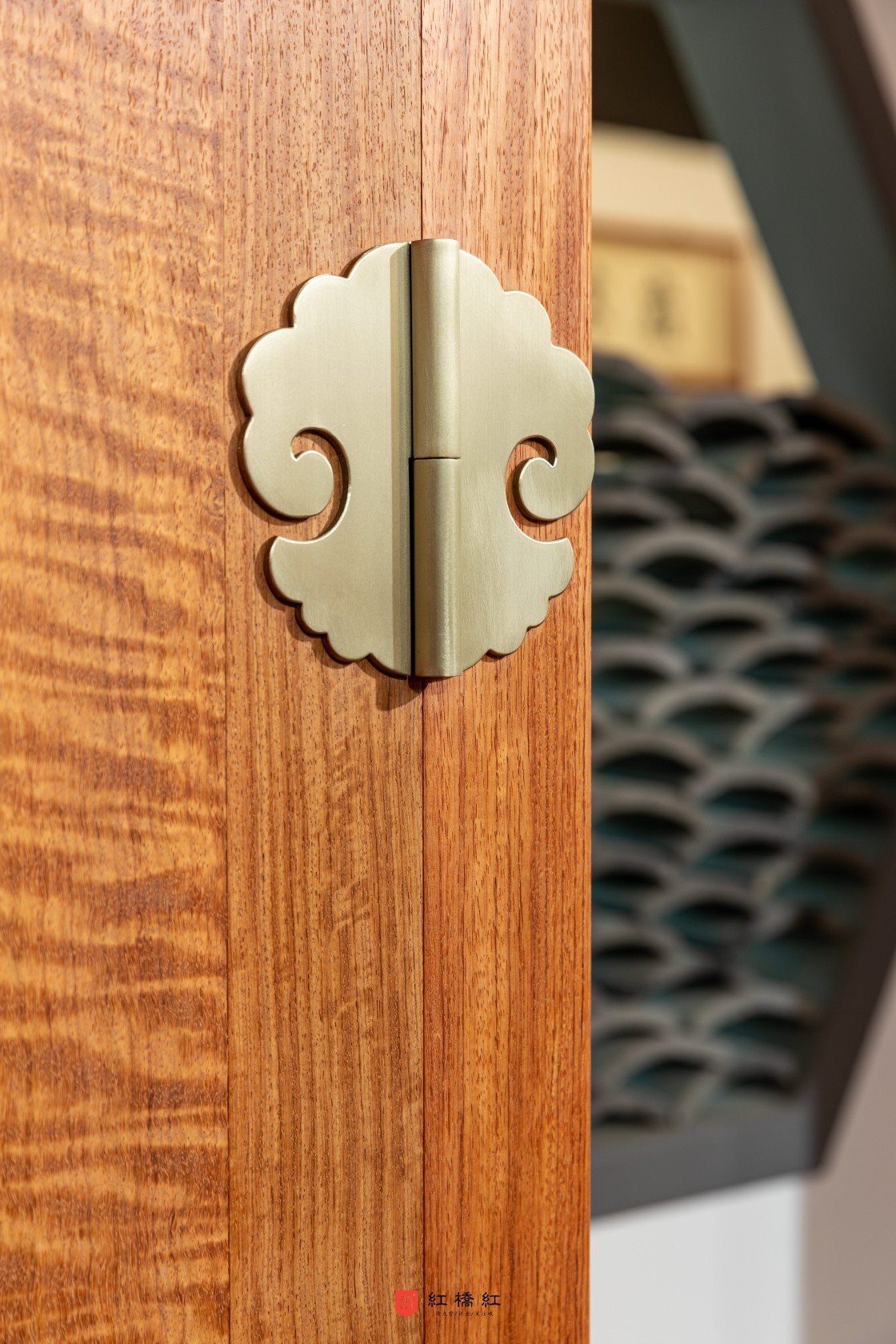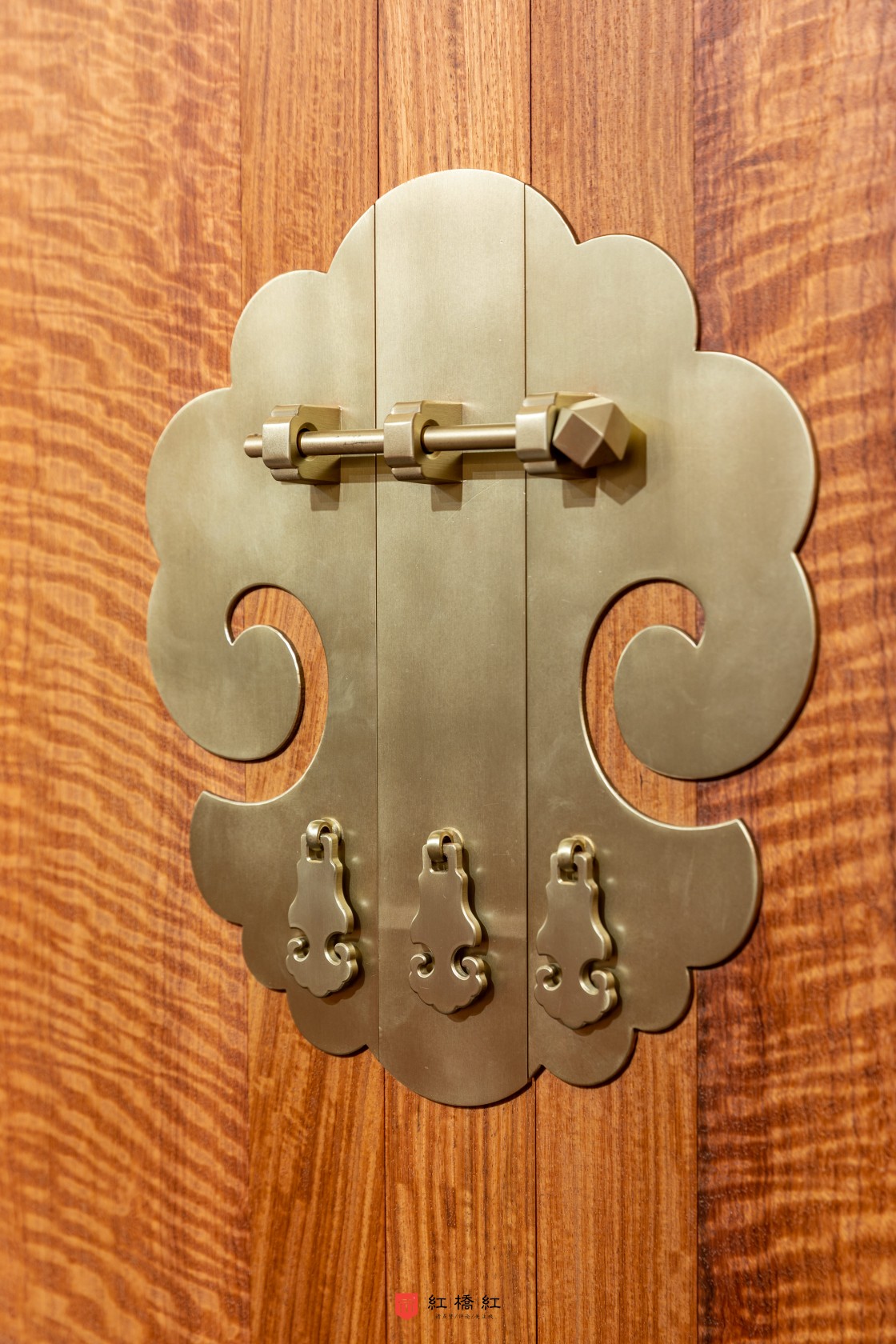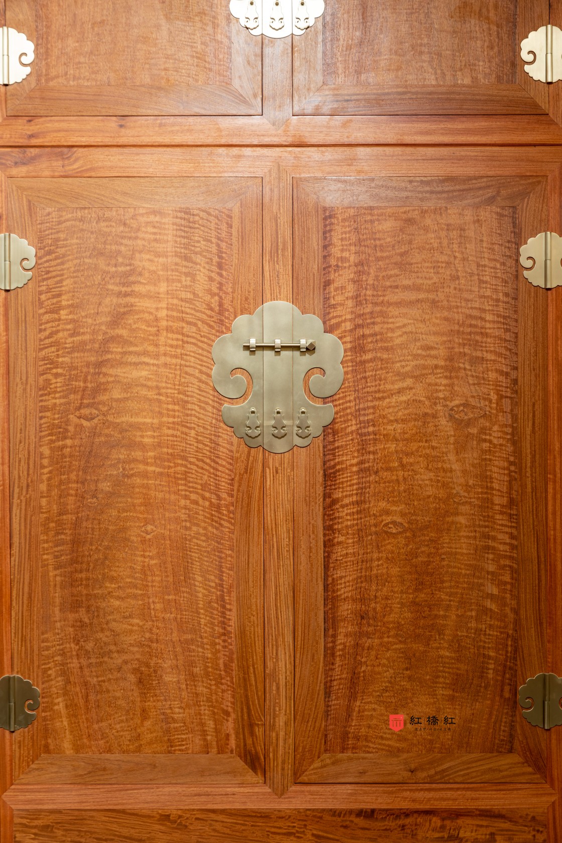 明式大型四件柜造型基本趋同,粽角榫方式三碰肩结合,以方正平直为美,形体高大,通体光素无纹饰,通过取大材的天然优美纹理,结合铜件造型,令人赏心悦目。