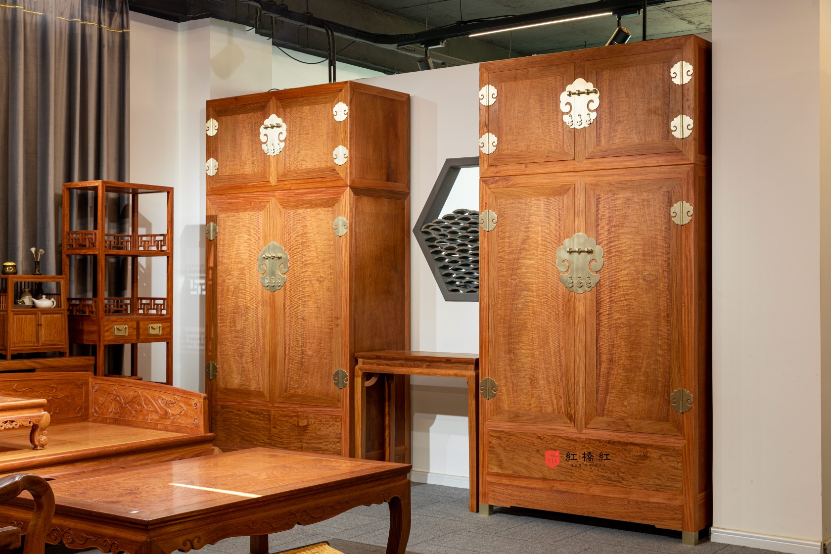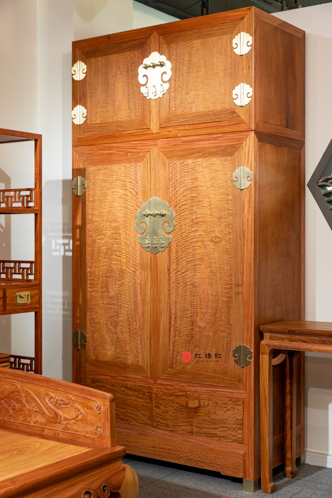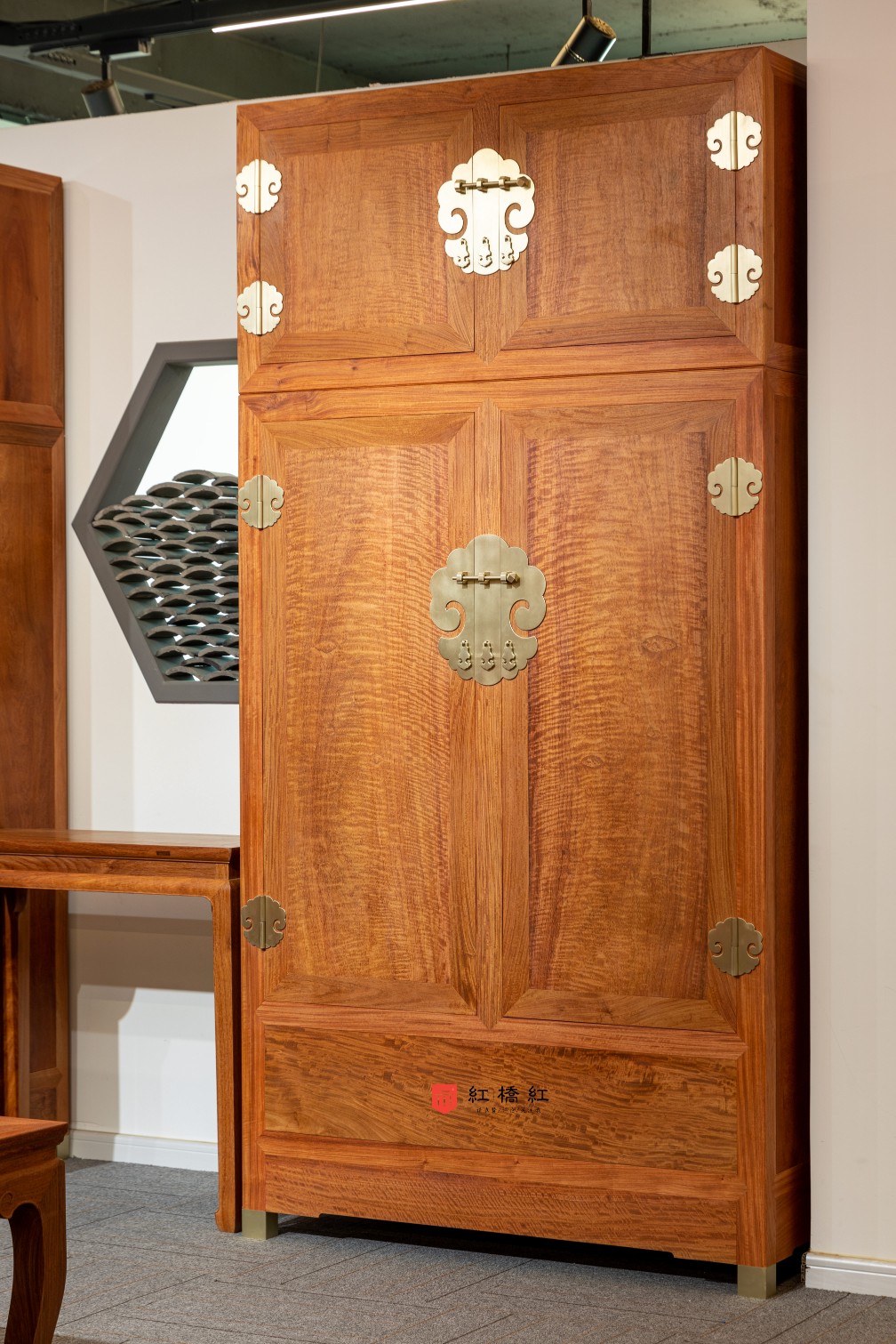 此器考虑当代生活实用性,一件内设抽屉,分隔出实用空间。另一件仅设可拆卸挂衣杆,与顶箱一样空敞,四件柜正面装板平镶,侧、背微微落堂,都是传统造法,方材大框牙板起阳线,形成观面的细致层次感,四足包铜,在搬动时起到更好的保护作用,成对摆放时,整体气势磅礴、雄伟壮观、重而不拙。