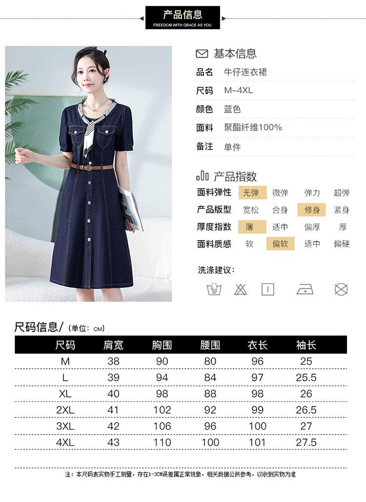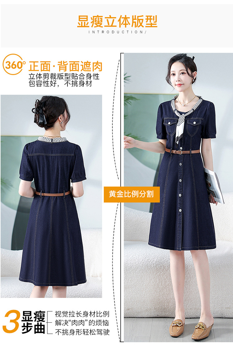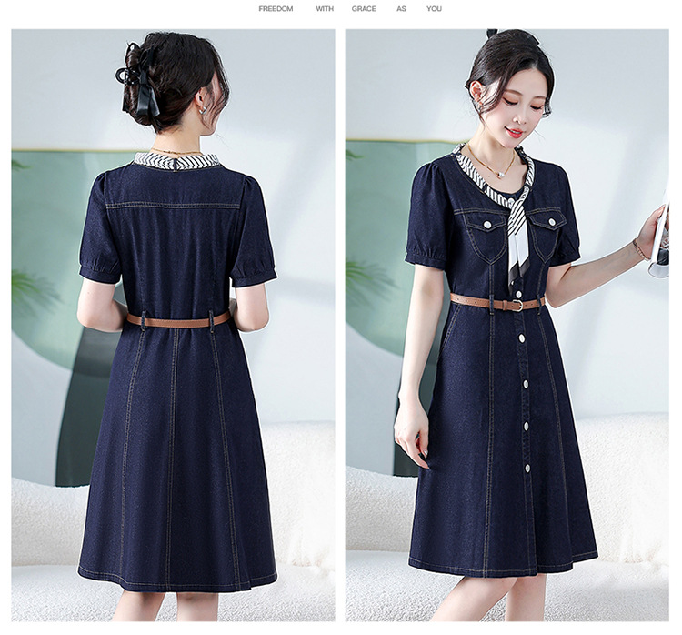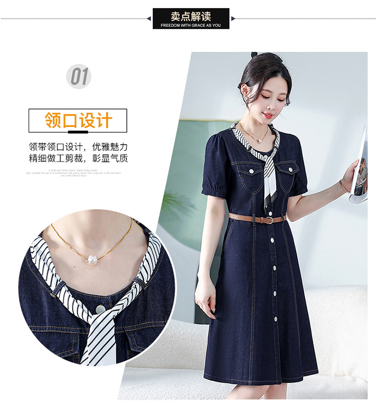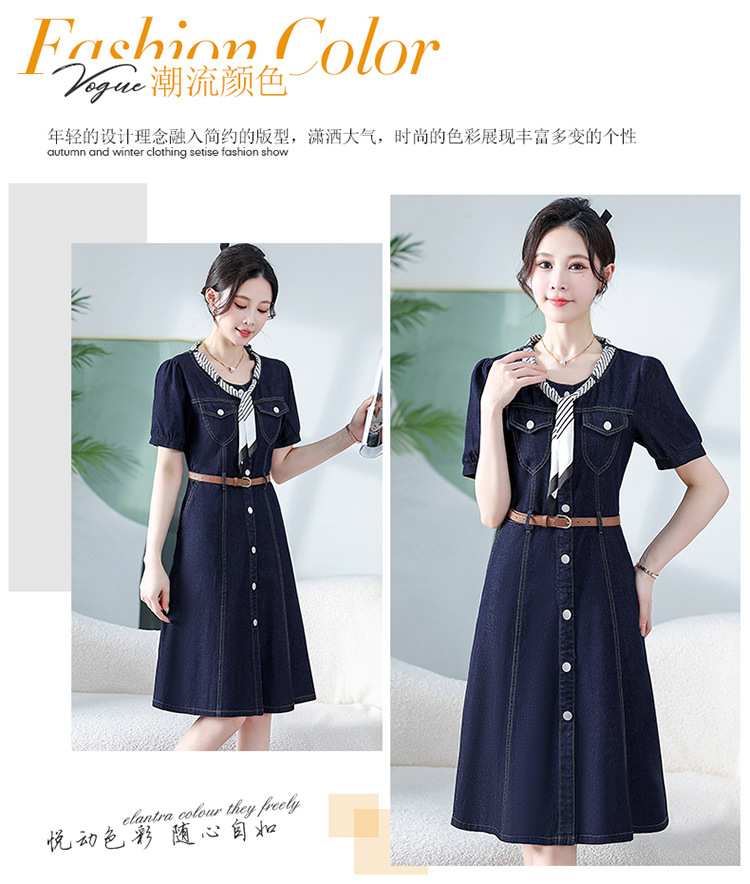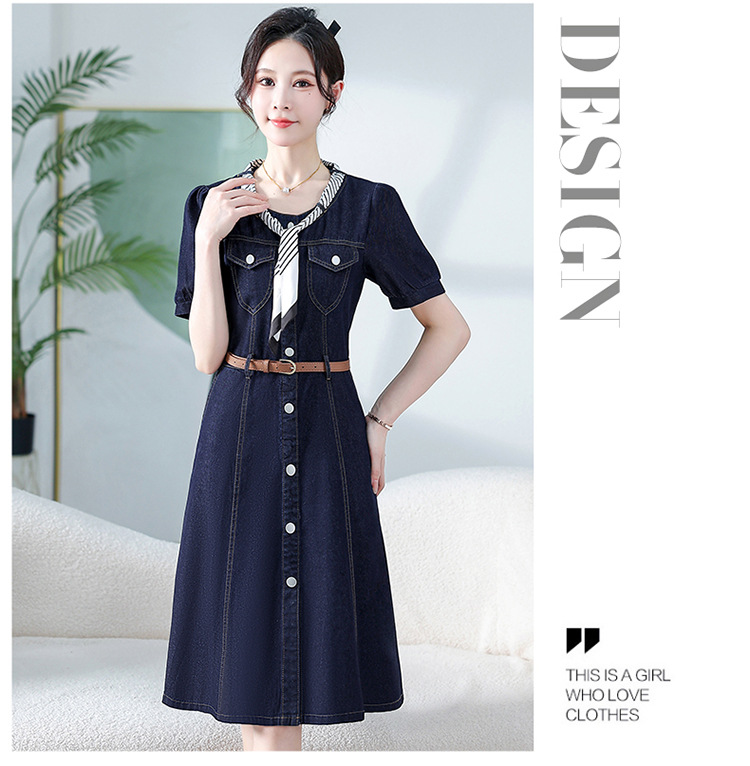 QYMKED-65020 -Y 2025年时尚飘带设计牛仔裙短袖连衣裙气质中长款A字裙