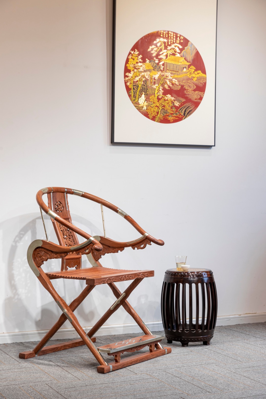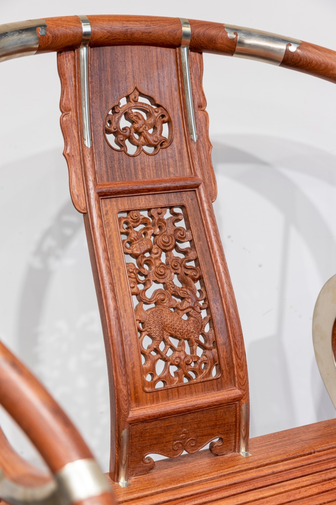 这把原型为王世襄旧藏黄花梨圆后背交椅,为众多行业人士,学习、复刻、研究的标准器。三截攒框镶板靠背,上部如意开光透雕螭龙纹,中部透雕麒麟、葫芦、山石、灵芝,下部亮脚起卷草纹阳线;嵌铜使其坚固,至精者,加微改良,施平嵌,工艺更为复杂。整体更为平顺,交椅在古时更为权势象征,今人多做主椅,赠长辈、领导,置空间显位营造氛围。