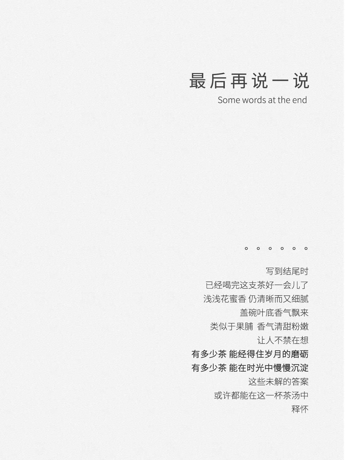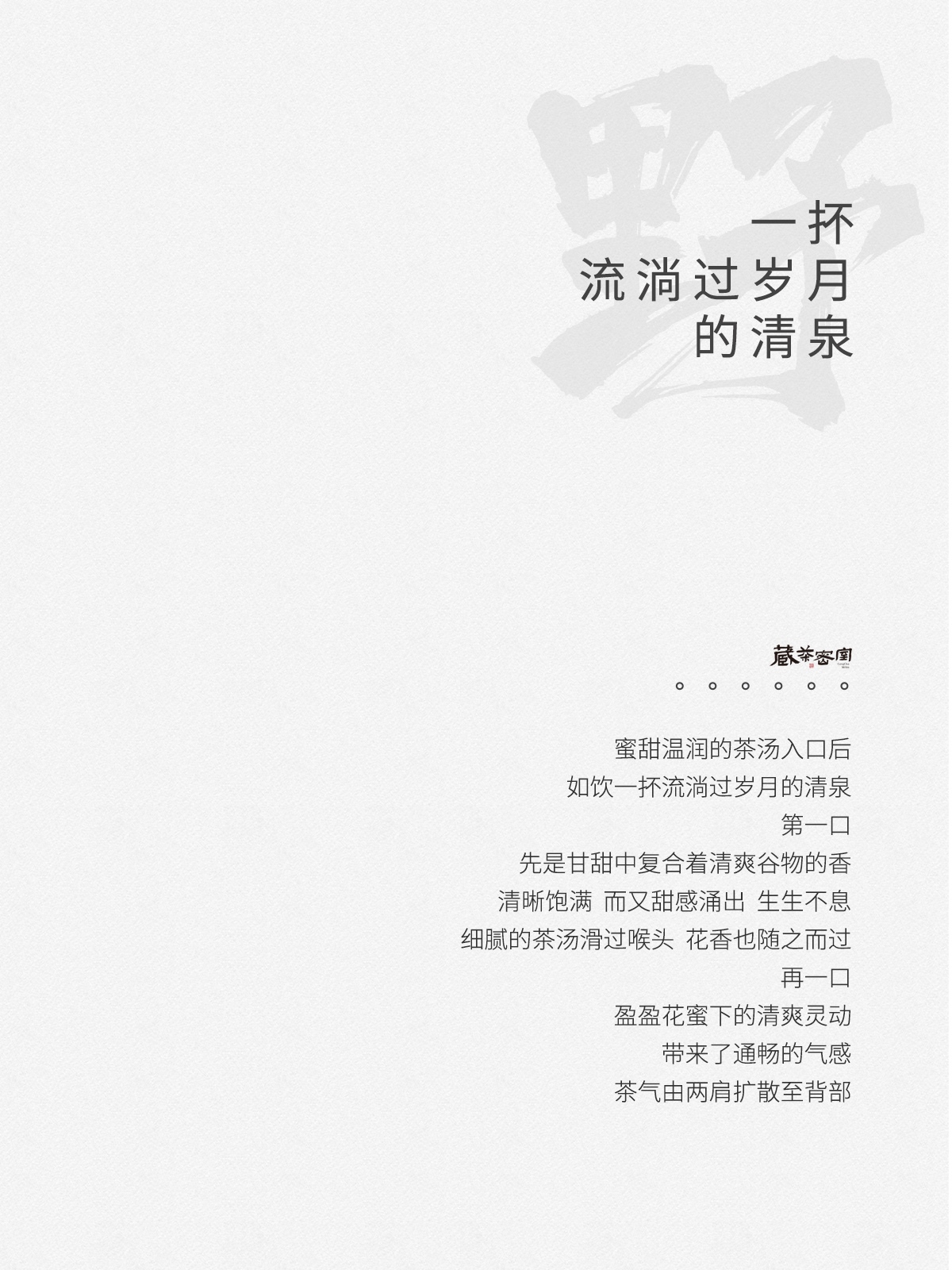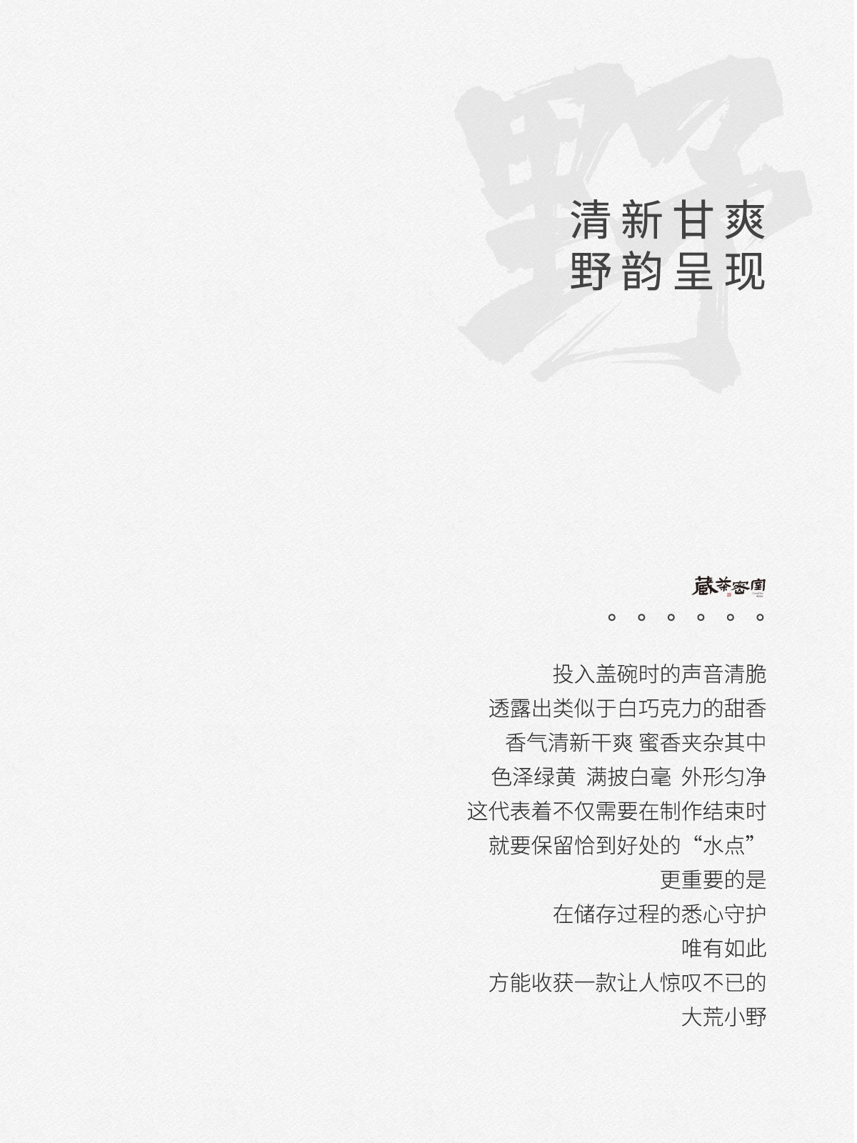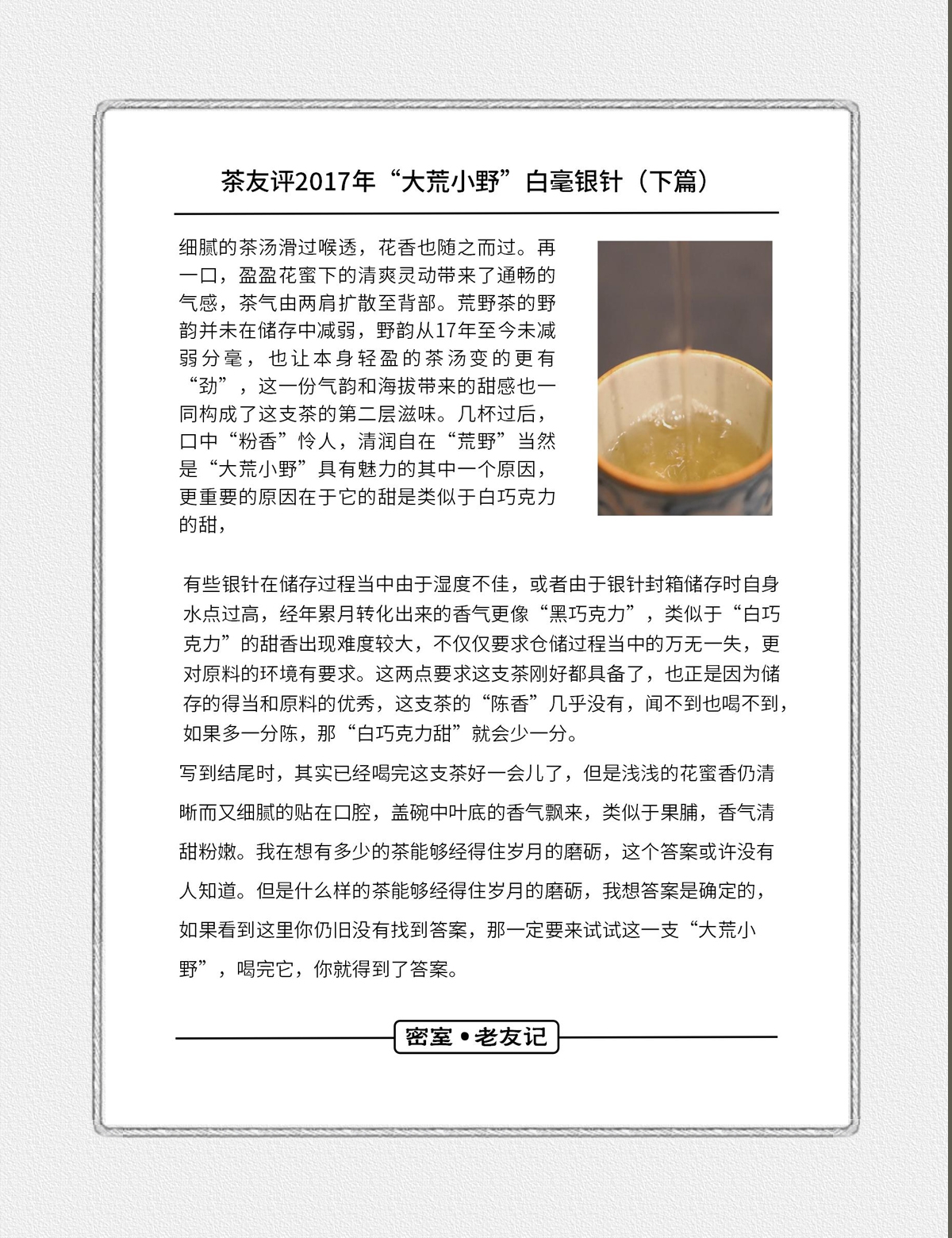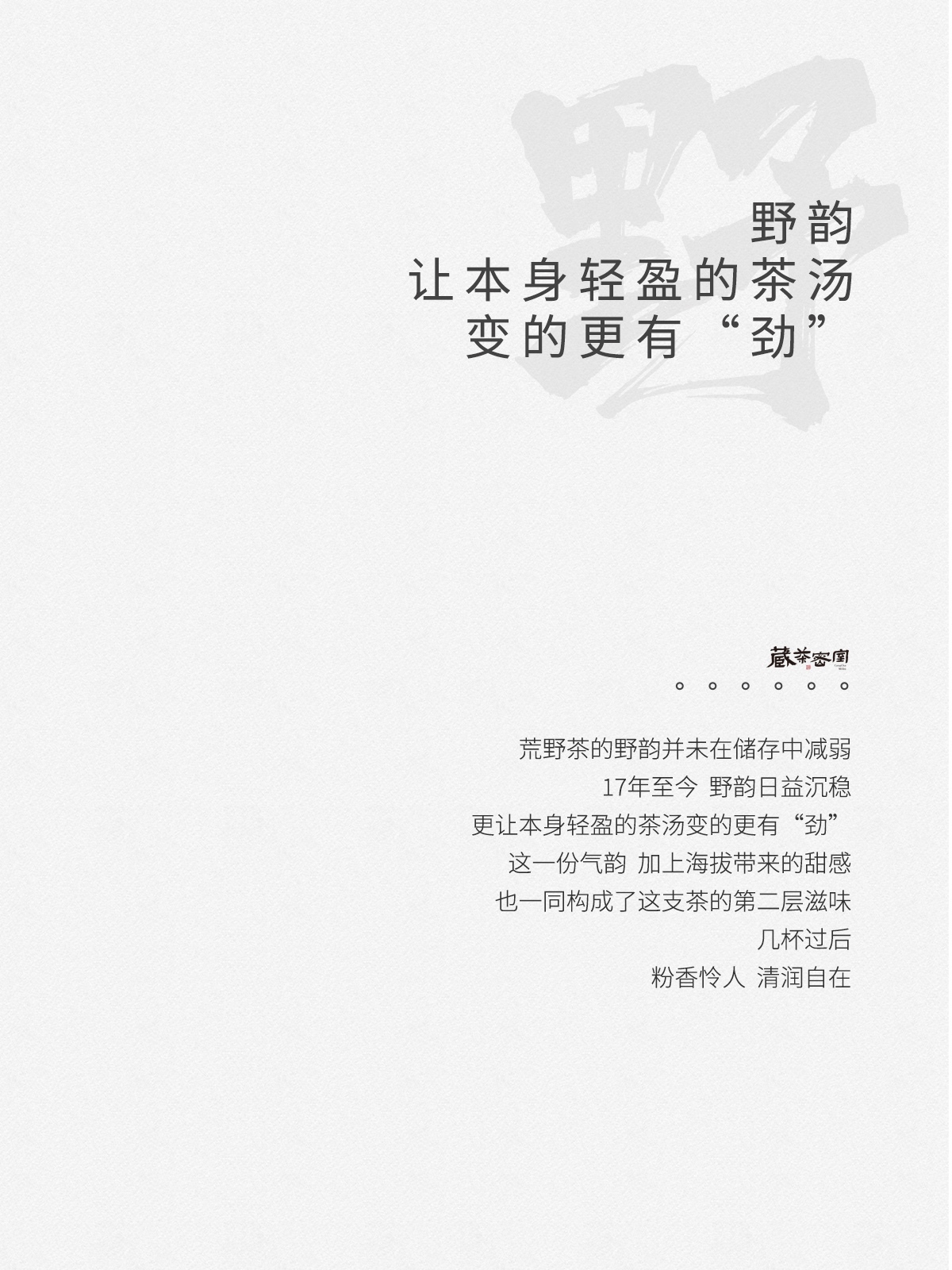 - 2021年,嘉木会创办了“藏茶密室”,开启了全新的藏茶模式,秉持“不将就,不迎合”的理念,通过“选、藏、养、醒”的方式,再度诠释藏茶的深意,沉醉杯汤,苦乐自知,茗透于心,迷之不悔!