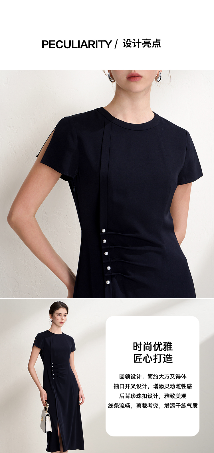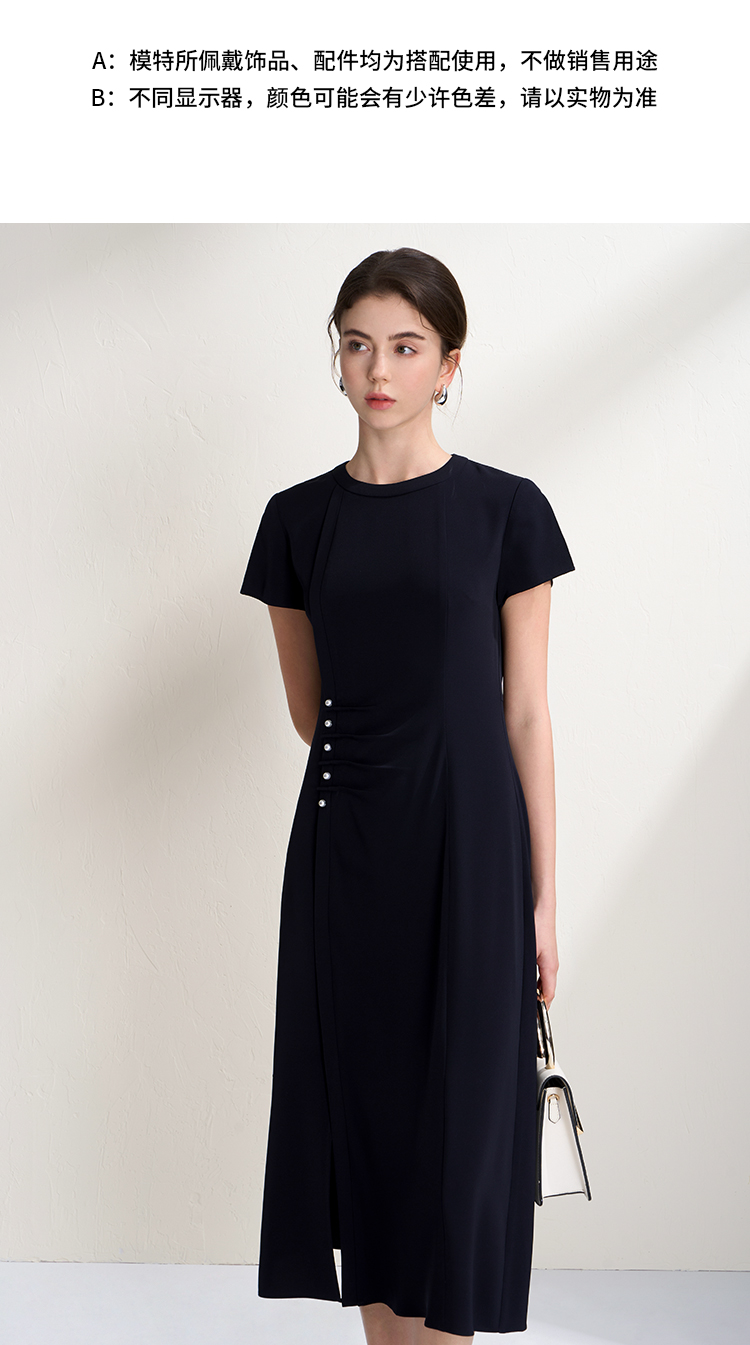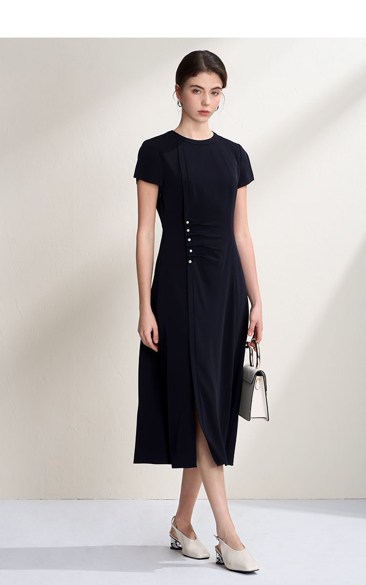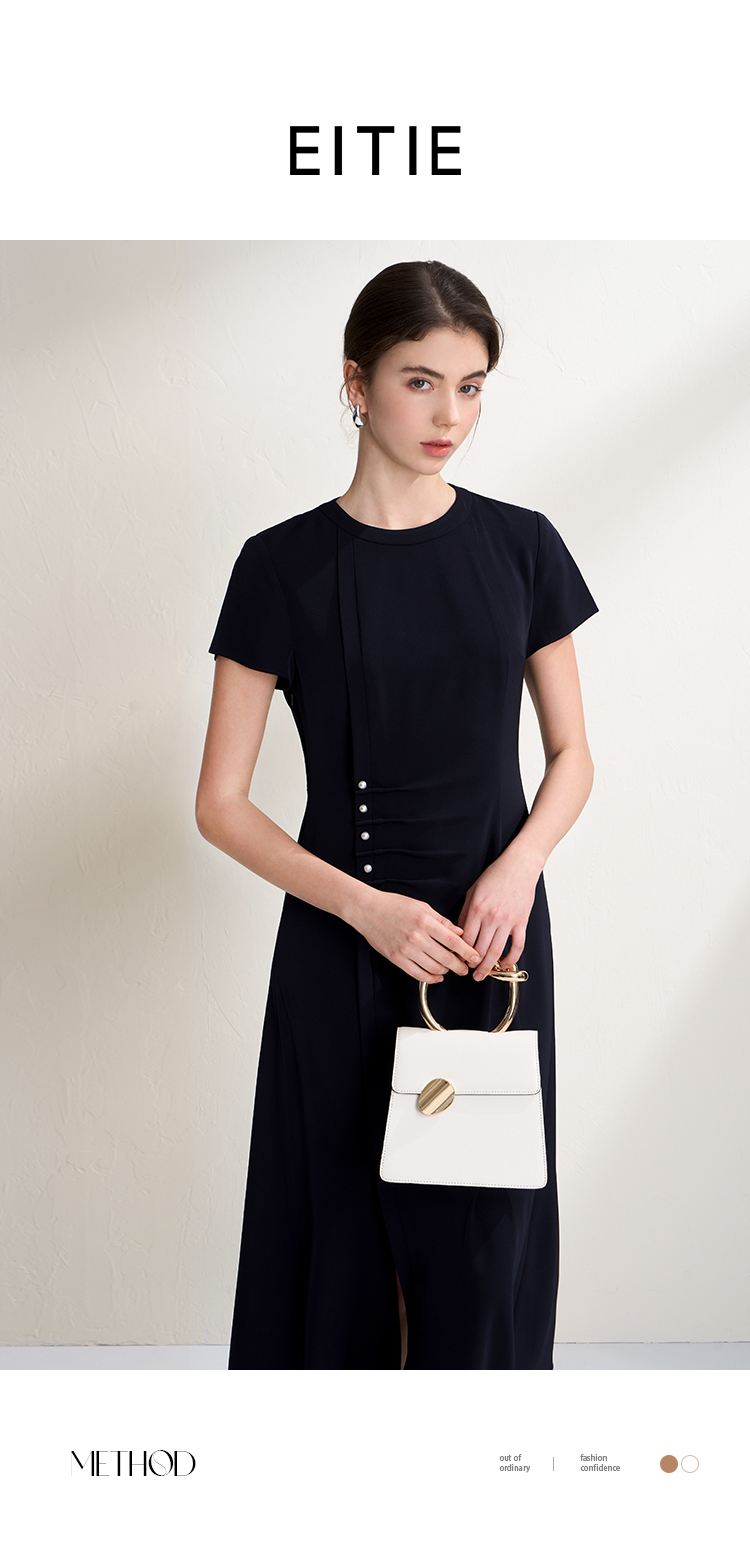 EITIE爱特爱简约不对称捏褶珍珠扣开叉飞飞袖连衣裙2026夏季新款B2607216