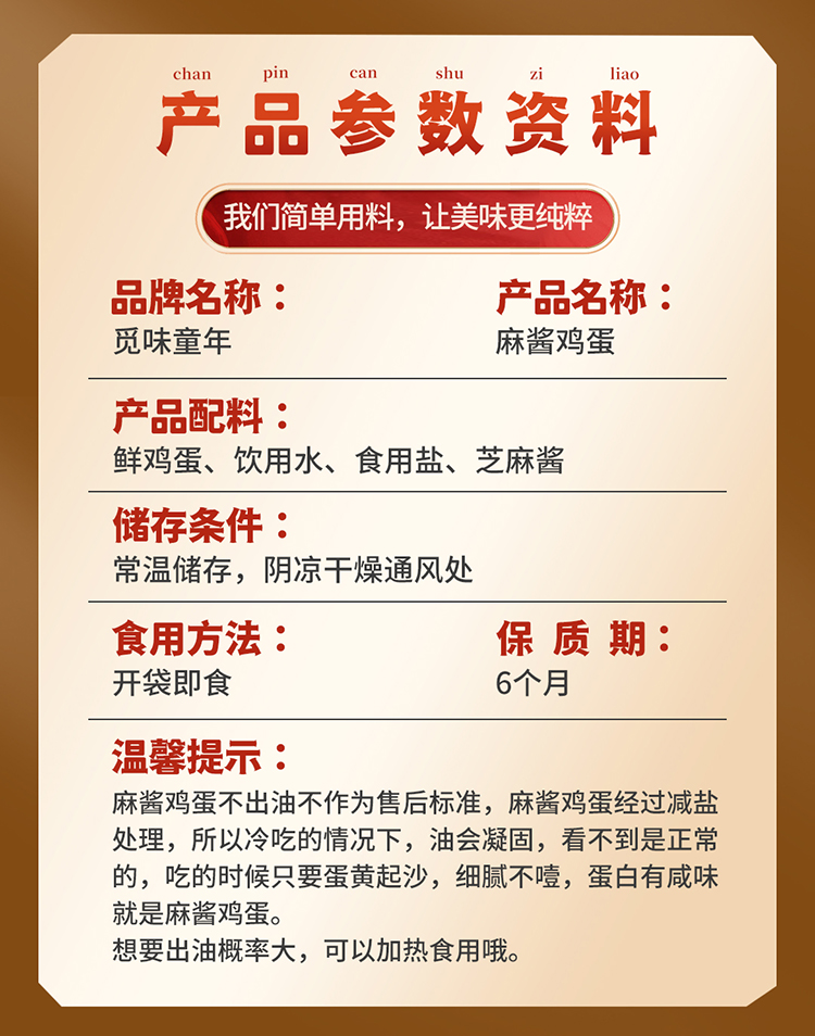 品名:正宗天津蓟县麻酱鸡蛋 规格1:10枚试吃装(单枚约50~55g) 规格2:20枚实惠装(单枚约50~55g) 规格3:30枚家庭装(单枚约50~55g) 规格2:30枚礼盒装(单枚约50~55g);拍几份发几个包裹,不一定能同时到达,请耐心等待; 发货地/产地:天津 包装方式:家庭装@礼盒装 保质期:6个月 物流信息:默认中通/圆通快递,不支持指定快递 发货区域:新疆、西藏、青海不发; 物流详情:周六、周日及节假日除外,正常48小时内发货,到货时间约为2~5天,请耐心等待 售后说明:收到货后有质量问题,在24小时内都可以拍照(坏品+快递单面箱子一起拍)上传,申请按坏品比例理赔或联系客服,生鲜性质特殊,不支持7天无理由退换货;因地址错误,手机号联系不上,拒收等造成的损失无法售后,请理解; |