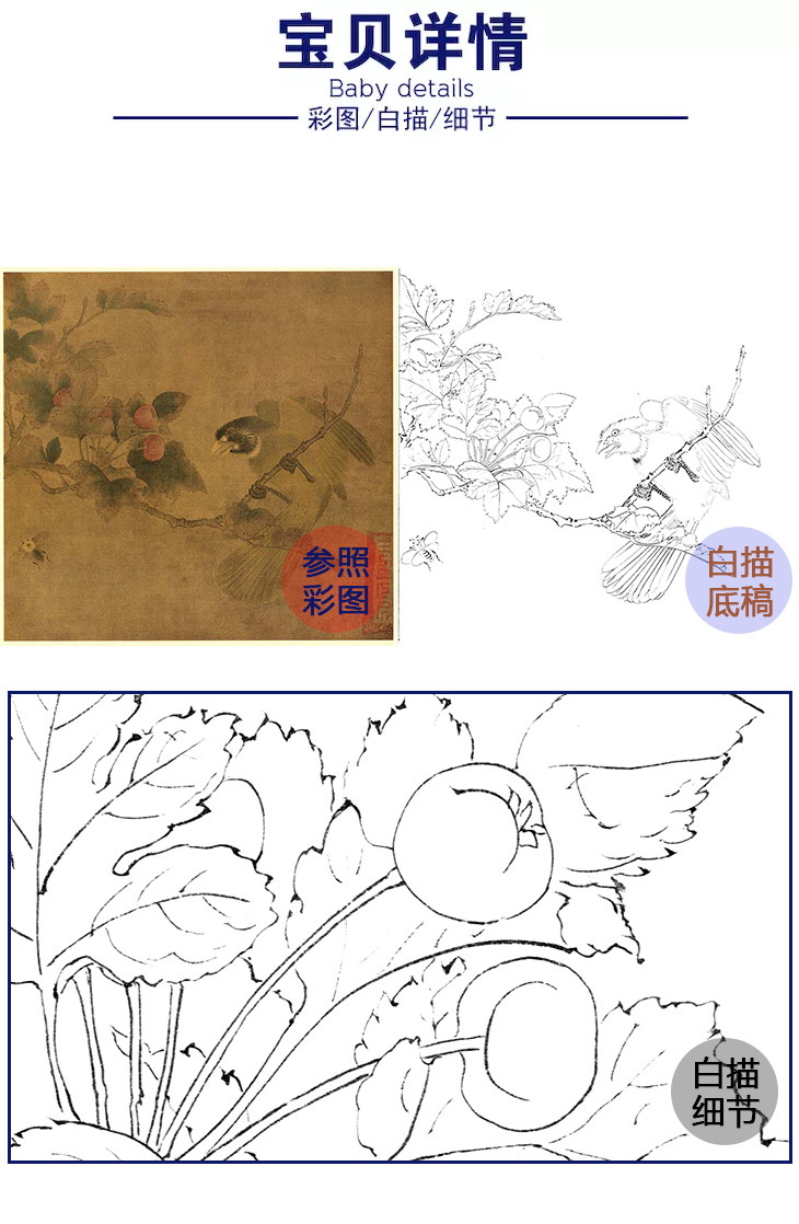 宋画花鸟白描底稿-佚名《红果绿鹎图》-斗方小品册页-GH70