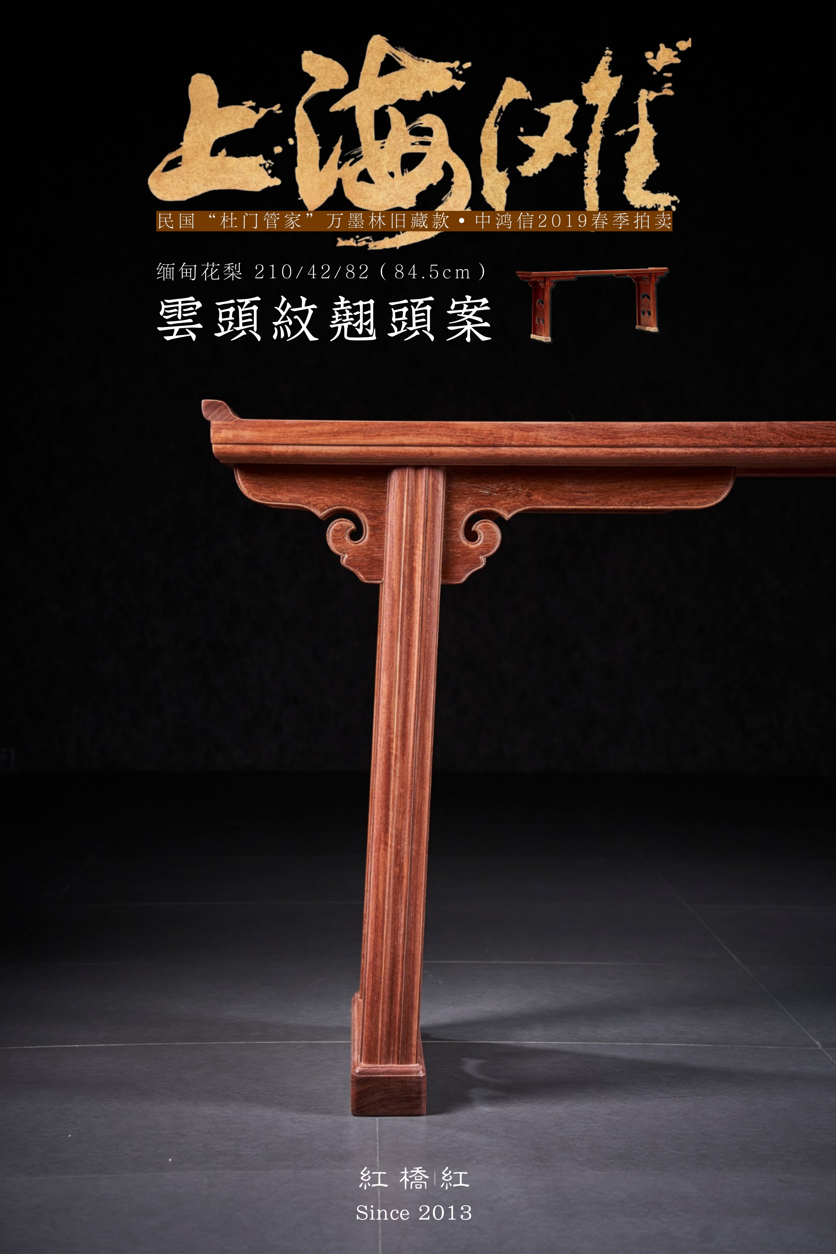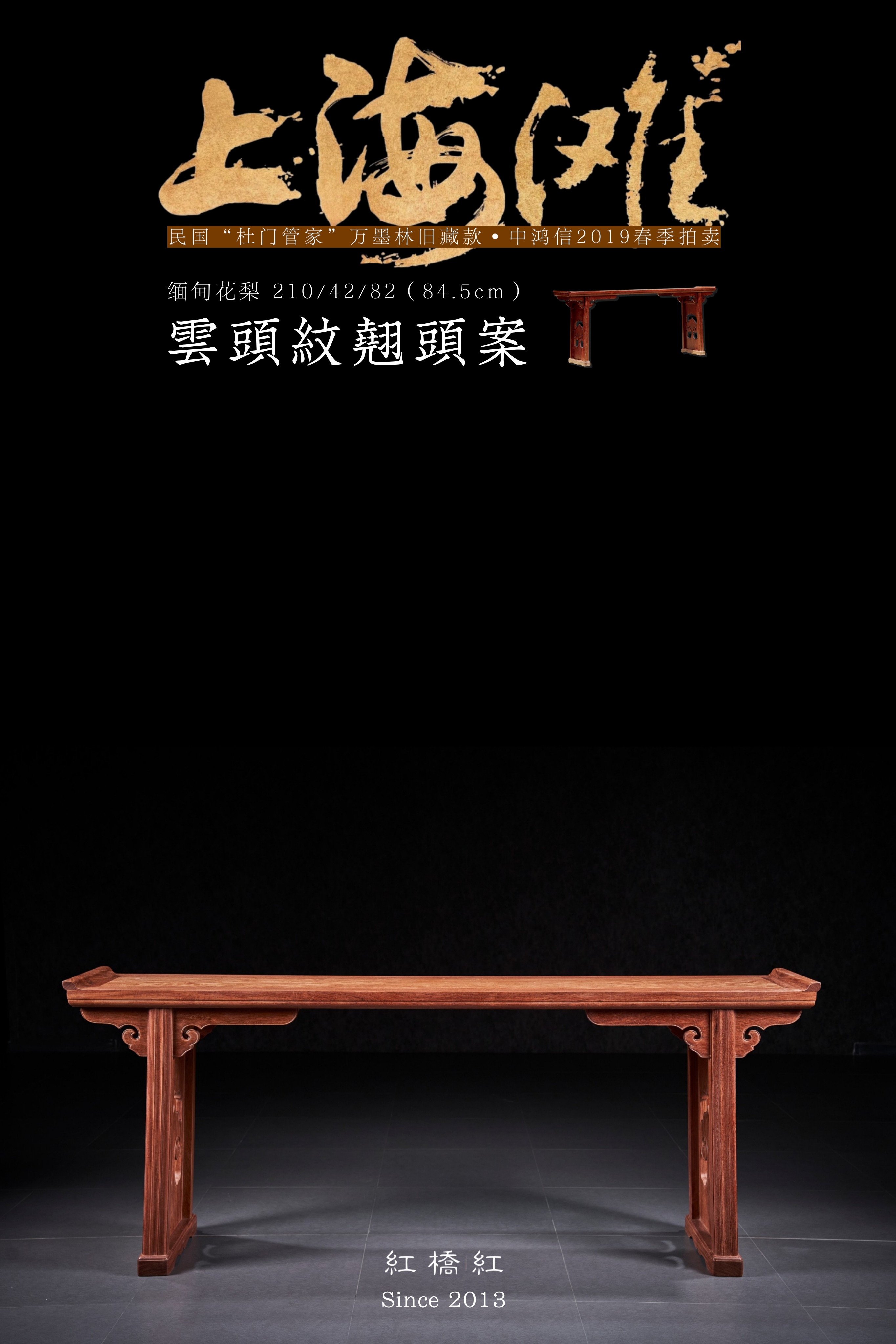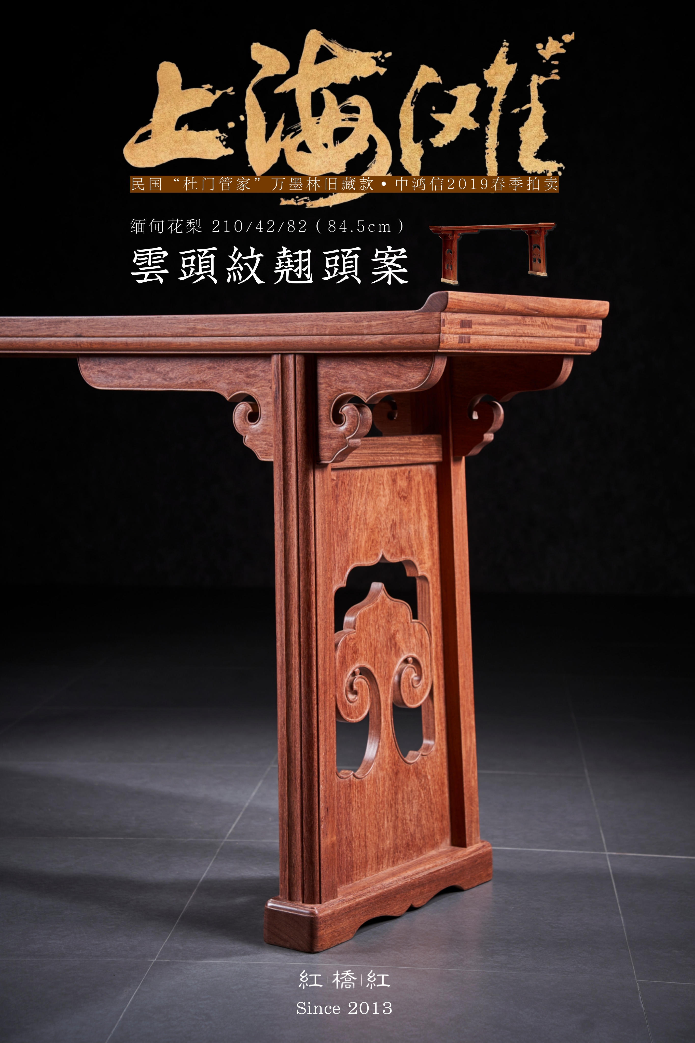 此款如意云头纹翘头案原型来自民国“杜门管家”万墨林旧藏款·中鸿信2019春季拍卖,一件清早期 黄花梨独板翘头案。