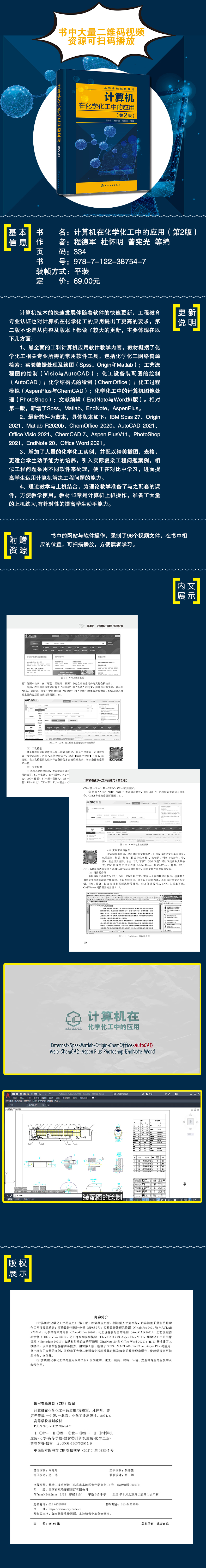 《计算机在化学化工中的应用》(第2版)以培养应用型、创新型人才为目标,内容涵盖了新的化学化工网络资源检索;实验设计与统计分析(SPSS 27);实验数据处理及绘图(OriginPro 2021和MATLAB R2020a);化学结构式的绘制(ChemOffice 2020);化工设备装配图的绘制(AutoCAD 2021);工艺流程图的绘制(Office Visio 2021);化工过程和流程模拟(ChemCAD 7和Aspen Plus V11);化学化工中的图像处理(Photoshop 2021);文献和科技论文撰写编辑(EndNote 20和Office Word 2021);在13章设计了上机操作,以培养学生操作动手能力。相对第1版,新增了SPSS、MATLAB、 EndNote、 Aspen Plus的应用。书中增加了大量的实例,并配套了大量二维码数字视频操作讲解及精美的教学配套课件, 使教学资源更加多样化、立体化。