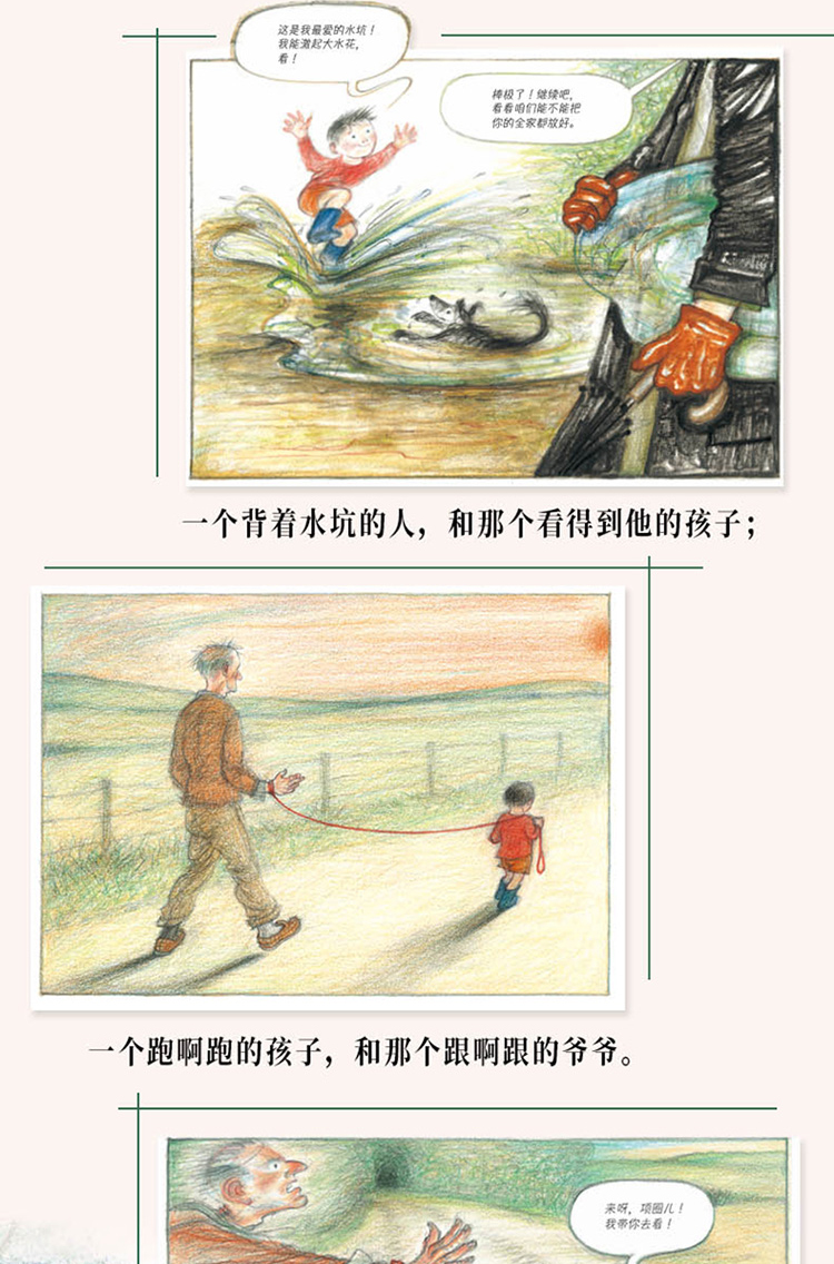 从图画的角度看,《水坑人》延续了布里格斯“儿童关怀类”作品的柔和、明亮与温馨。年届七十的布里格斯用彩铅绘画已入化境,黄黄绿绿的轻抹便是乡间的草场,寥寥几笔方格线就是围栏,路边的草与树、天上的云与夕阳都是柔柔淡淡的,构成了一幅幅奇妙的类似印象派画作的乡间美景。