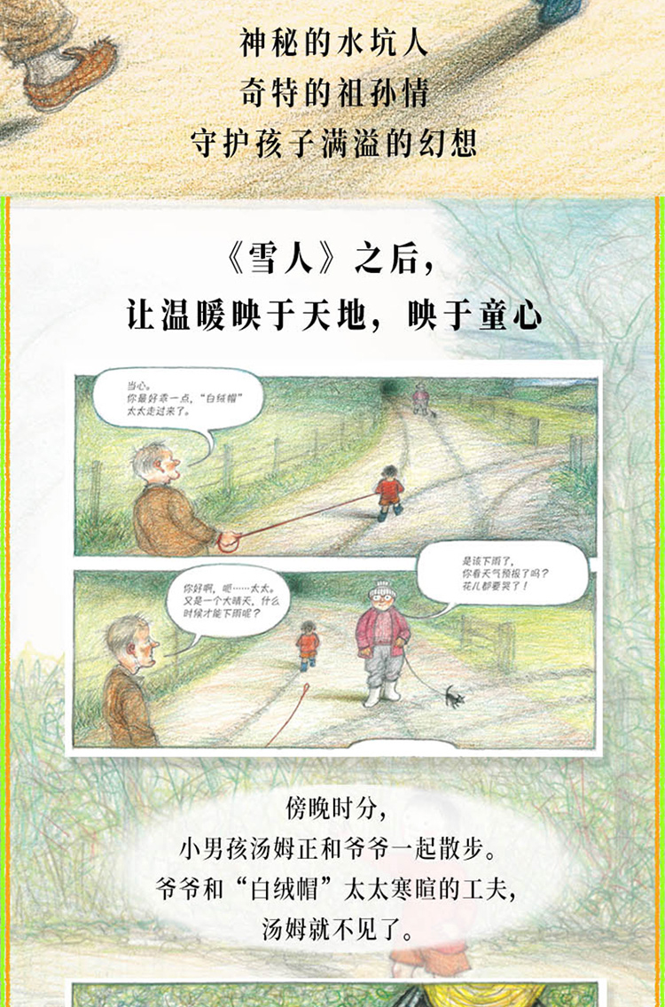 傍晚时分,小男孩汤姆正和爷爷进行着一场好玩又古怪的散步,谁知爷爷和“白绒帽”太太寒暄一句话的工夫,汤姆就不见了。原来,汤姆遇到了神秘的“水坑人”,他帮水坑人一起将水坑放进干涸的坑洼,还为水坑起了家人的名字。水坑形态各异,仿佛真的拥有各自不同的性格一样……