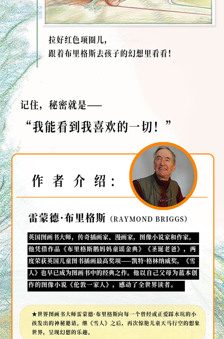 雷蒙德·布里格斯(Raymond Briggs),英国图画书大师,传奇插画家、漫画家,图像小说家和作家。他凭借作品《鹅妈妈童谣金典》《圣诞老爸》,两度荣获英国儿童图书插画最高奖项——凯特·格林纳威奖,《雪人》也早已成为图画书中的经典之作。他以自己父母为蓝本创作的图像小说《伦敦一家人》,感动了全世界读者。
