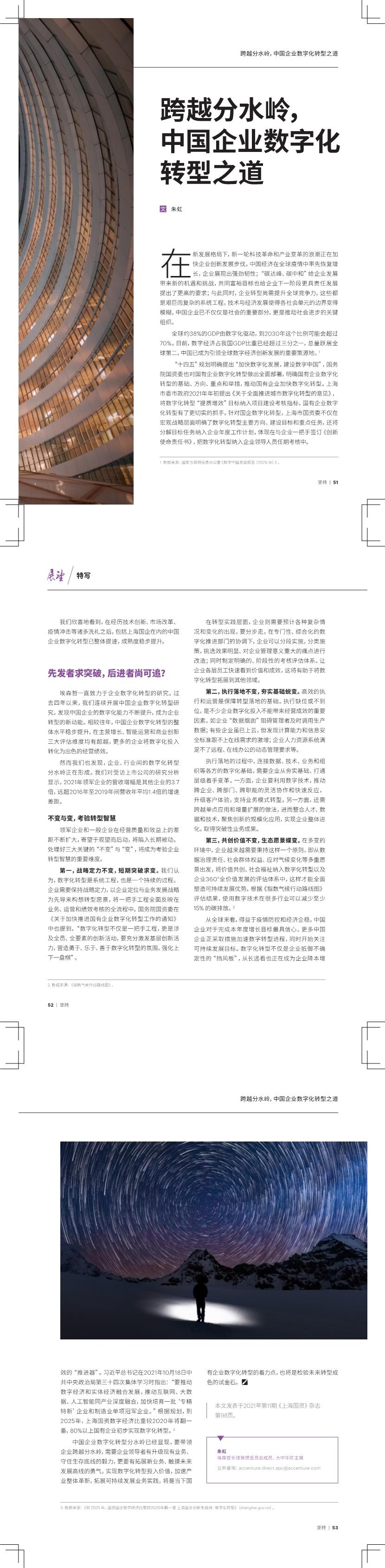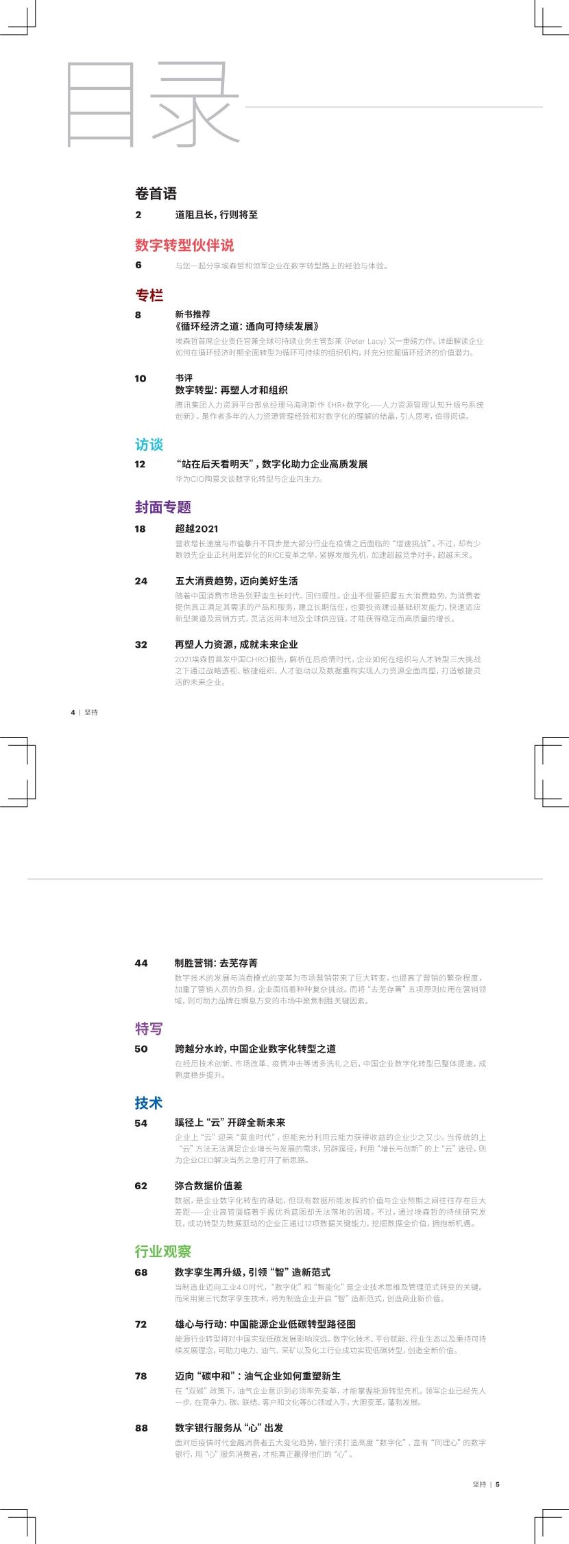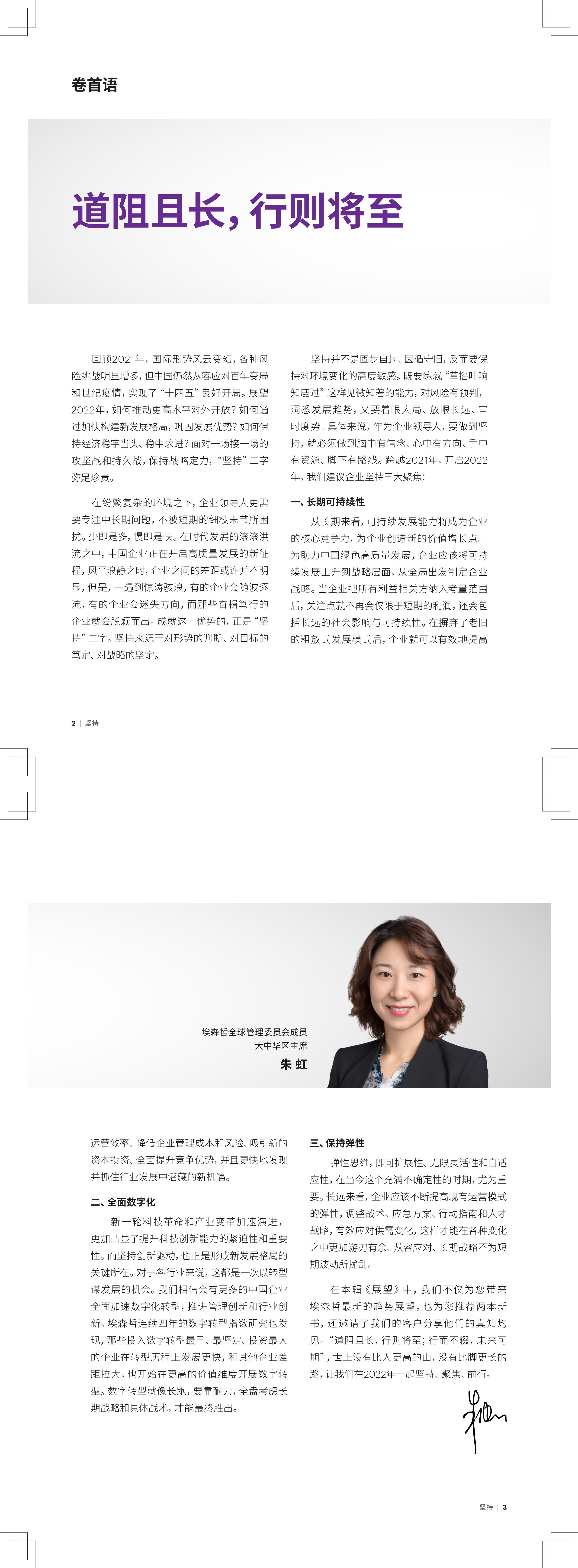 奋楫笃行的企业会在纷繁复杂的环境之下脱颖而出,而成就这一优势的,正是“坚 持”二字。坚持来源于对形势的判断、对目标的笃定、对战略的坚定。开启2022年,我们 建议企业坚持聚焦长期可持续性、全面数字化并保持弹性,这样才能游刃有余、从容应 对各种变化,并依靠耐力与坚持,在数字化转型长跑之中紧握机遇,稳步前行。