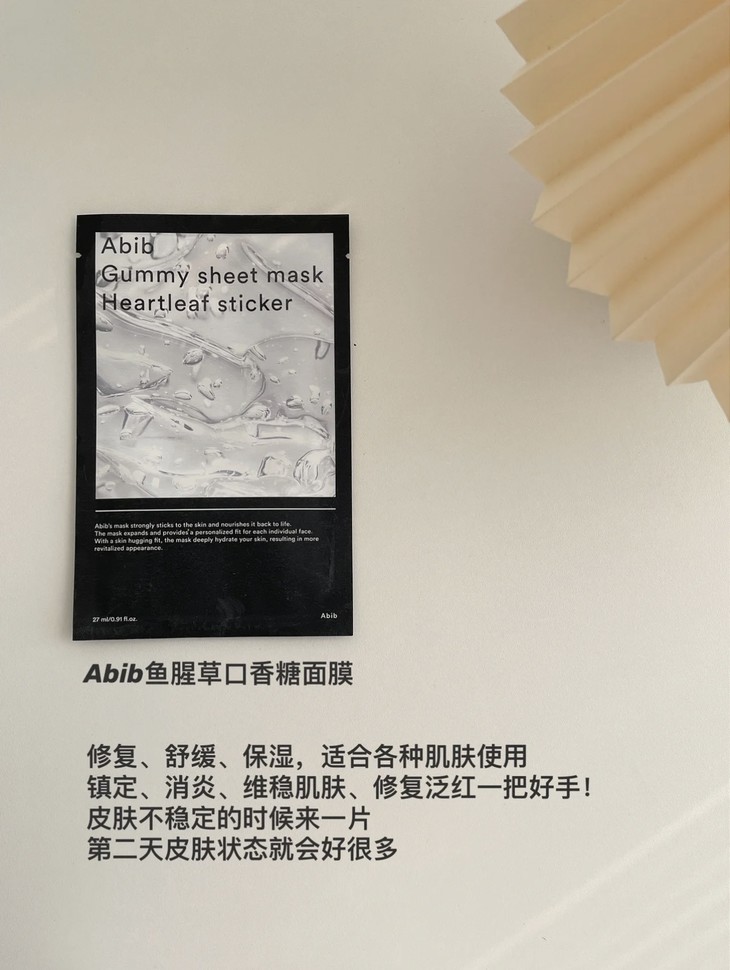 👑Abib 鱼腥草口香糖面膜 👍 主打“舒缓泛红肌肤”✨!含有“鱼腥草、角鲨烷、白烨茸”提取物📣! 💦紧密补水,修护屏障的同时还能“舒缓泛红”🔥。面膜紧密贴合,狂甩不掉💯! ✅有效成分在密闭环境中更好的传递给肌肤,避免营业成分被缝隙蒸发🌈! 🙌适合脆弱肌、痘痘肌、熬夜加班、油脂分泌旺盛的人群✅。