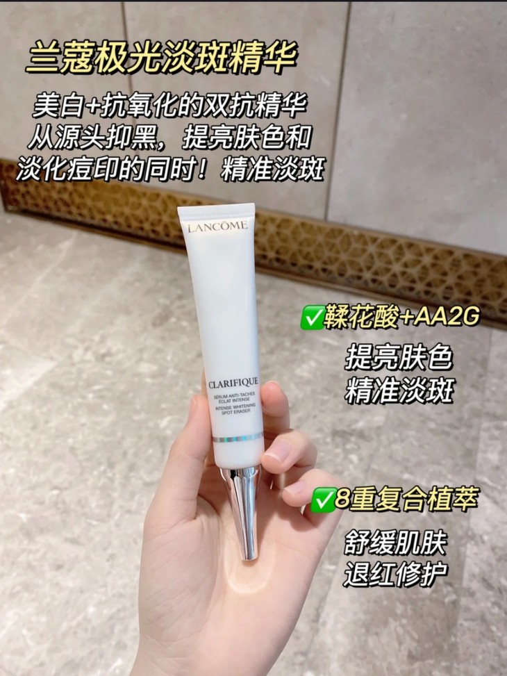 👑兰蔻极光美白精华50ml 👍兰蔻爆冷门!淡斑、提亮两手抓! ✅主打靶向淡斑和高效美白,精准淡化痘印和斑点!! 💚滴管设计,干净卫生!使用超级方便。轻盈凝乳质地,好推开,清爽好吸收 ✨成分实打实在线!坚持使用从内到外打造肤色透亮均匀的发光感~ 👉全脸涂抹,提亮肤色,局部涂抹,精准淡斑🙌