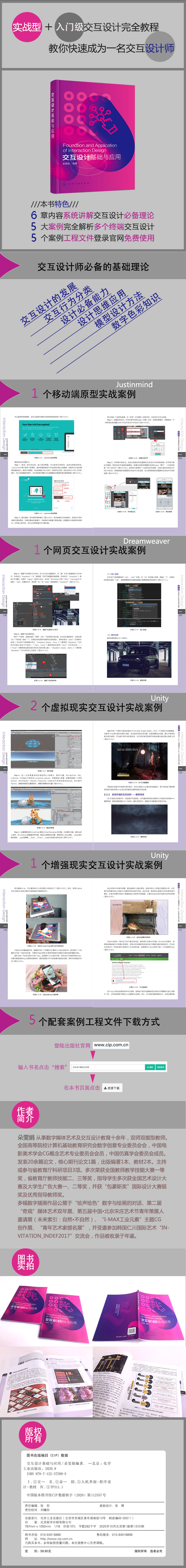 本书作为交互设计基础理论与实践应用入门用书,通过两大部分共六章内容深入浅出、生动直观地展开讲解。排名靠前部分:基于交互设计思维的第1、2章内容,涵盖交互设计的原理、发展历程,交互行为类型,交互设计师的工作职能及必备特质,设计思维的应用,等等。第二部分:以交互设计应用技术为主的第3~6章内容,其中包括数字色彩构成、交互界面设计、低保真与高保真模型的设计方法、 Justinmind软件的功能介绍与应用,并以实际案例详细展示了移动端原型设计与应用、网页设计中的交互设计应用、虚拟现实(VR)与增强现实(AR)中的交互设计应用,包括Justinmind的功能与应用、Dreamweaver及其操作、Unity及其交互特效的应用。为了便于实践操作、高效学习,书中附有与案例配套的工程压缩包,大家可登录www.cip.com.cn,搜索本书,在图书页面点击“资源下载”,或在出版社官网zui下端的“资源下载”中搜索、下载。 本教材适用于高等院校数字媒体艺术、数字媒体技术、新媒体设计、产品设计、工业设计、计算机应用等相关专业的师生,也可作为无交互设计基础的爱好者、入门人士的自学教程。